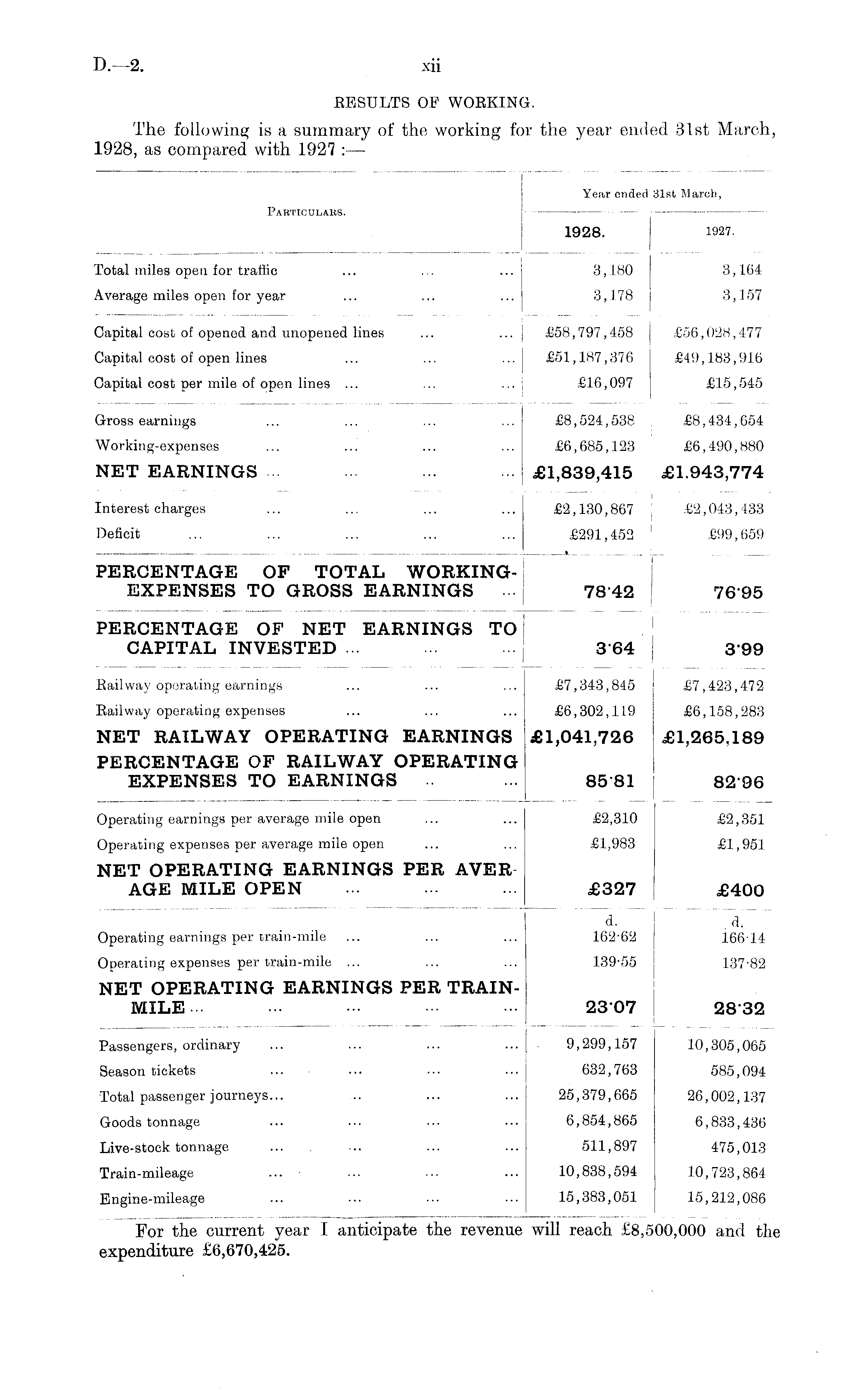 Pabtioulaks. Year ended 31st March, 1928. 1927. Total miles open for traffic 3,180 3,164 Average miles open for year 3,178 3,157 Capital cost of opened and unopened lines £58,797,458 £56,028,477 Capital cost of open lines £51,187,376 £49,183,916 Capital cost per mile of open lines ... £16,097 £15,545 Gross earnings £8,524,538 £8,434,654 Working-expenses £6,685,123 £6,490,880 NET EARNINGS ... £1,839,415 £1.943,774 Interest charges £2,130,867 £2,043,433 Deficit £291,452 £99,659 I , _™__„____^^.. I PERCENTAGE OF TOTAL WORKINGEXPENSES TO GROSS EARNINGS ... 7842 7695 PERCENTAGE OF NET EARNINGS TO CAPITAL INVESTED ... 364 399 Eailvvay operating earnings £7,343,845 £7,423,472 Railway operating expenses £6,302,119 £6,158,283 NET RAILWAY OPERATING EARNINGS £1,041,726 £1,265,189 PERCENTAGE OF RAILWAY OPERATING EXPENSES TO EARNINGS 8581 8296 Operating earnings per average mile open £2,310 £2,351 Operating expenses per average mile open £1,983 £1,951 NET OPERATING EARNINGS PER AVER AGE MILE OPEN £327 £400 Operating earnings per train-mile d. d. 162-62 16614 Operating expenses per train-mile ... 139-55 137-82 NET OPERATING EARNINGS PER TRAINMILE ... 2307 2832 Passengers, ordinary 9,299,157 10,305,065 Season tickets 632,763 585,094 Total passenger journeys... 25,379,665 26,002,137 Goods tonnage 6,854,865 6,833,436 Live-stock tonnage 511,897 475,013 Train-mileage ... - 10,838,594 10,723,864 Engine-mileage 15,383,051 15,212,086 For the current year I anticipate the revenue expenditure £6,670,425. will reach £8,500,000 and the