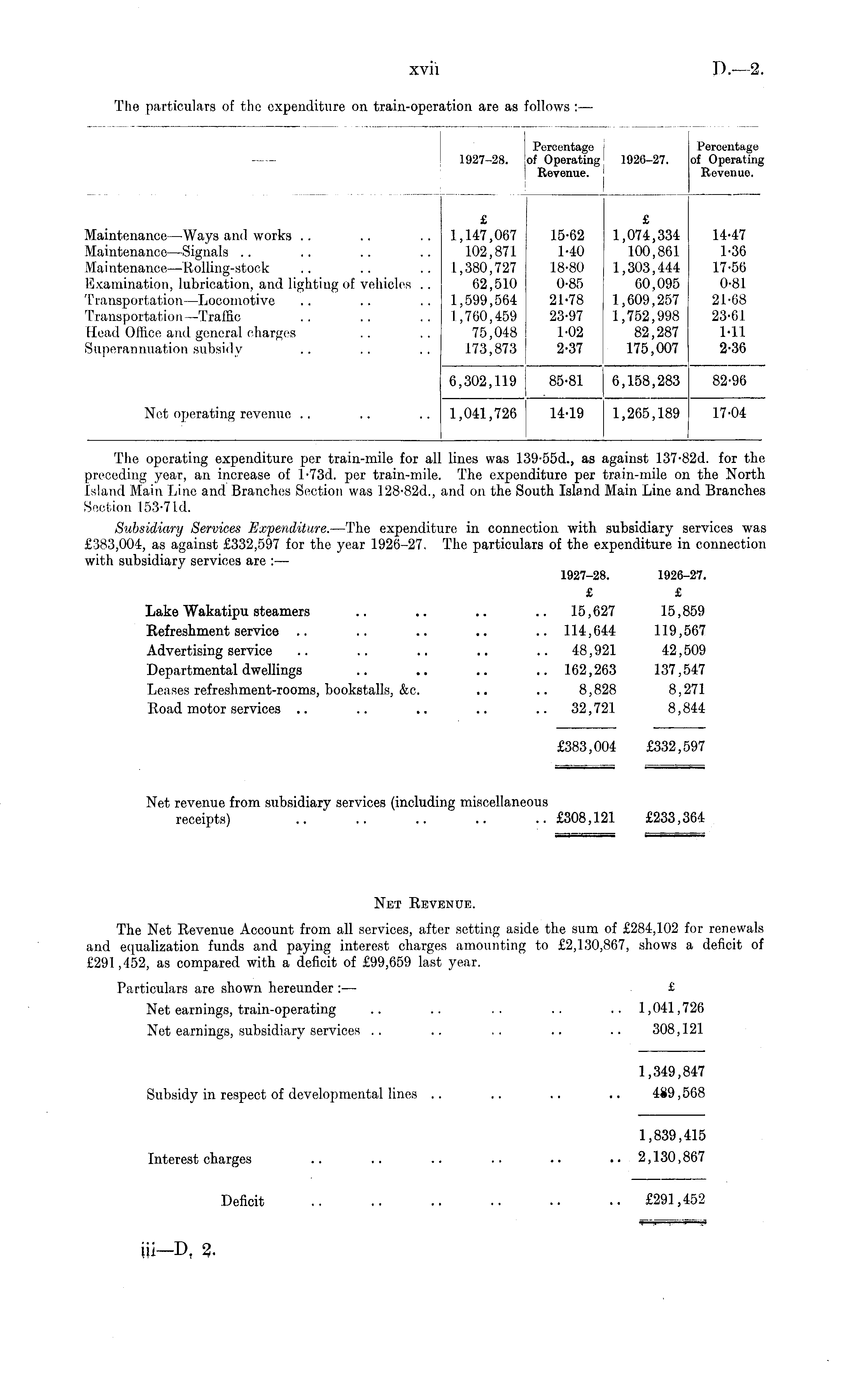 The operating expenditure per train-mile for all lines was 139*55 d., as against 137-82 d. for the preceding year, an increase of l-73d. per train-mile. The expenditure per train-mile on the North Island Main Line and Branches Section was 128-82 d., and on the South Island Main Line and Branches Section 153-71 d. Subsidiary Services Expenditure. —The expenditure in connection with subsidiary services was £383,004, as against £332,597 for the year 1926-27. The particulars of the expenditure in connection with subsidiary services are : — 1927-28. 1926-27. £ £ Lake Wakatipu steamers .. .. .. .. 15,627 15,859 Refreshment service .. .. .. .. .. 114,644 119,567 Advertising service .. .. .. .. .. 48,921 42,509 Departmental dwellings .. .. .. ..162,263 137,547 Leases refreshment-rooms, bookstalls, &c. .. .. 8,828 8,271 Road motor services .. .. .. .. ..32,721 8,844 £383,004 £332,597 Net revenue from subsidiary services (including miscellaneous receipts) £308,121 £233,364 Net Revenue. The Net Revenue Account from all services, after setting aside the sum of £284,102 for renewals and equalization funds and paying interest charges amounting to £2,130,867, shows a deficit of £291,452, as compared with a deficit of £99,659 last year. Particulars are shown hereunder :— £ Net earnings, train-operating .. .. . . .. .. 1,041,726 Net earnings, subsidiary services .. .. .. .. .. 308,121 1,349,847 Subsidy in respect of developmental lines .. .. .. .. 489,568 1,839,415 Interest charges .. .. .. .. .. •• 2,130,867 Deficit £291,452
