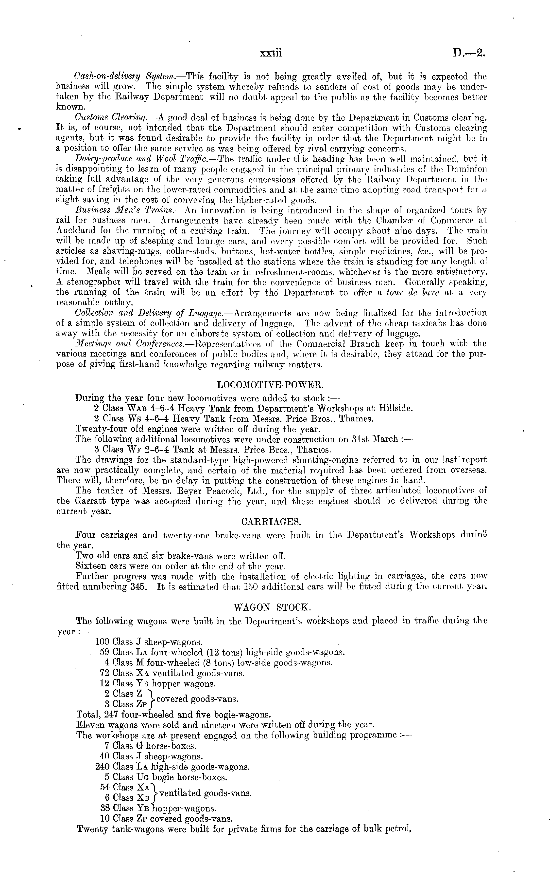 Cash-on-deUvery System.. —This facility is not being greatly availed of, but it is expected the business will grow. The simple system whereby refunds to senders of cost of goods may be undertaken by the Railway Department will no doubt appeal to the public as the facility becomes better known. Customs Clearing. —A good deal of business is being done by the Department in Customs clearing. It is, of course, not intended that the Department should enter competition with Customs clearing agents, but it was found desirable to provide the facility in order that the Department might be in a position to offer the same service as was being offered by rival carrying concerns. Dairy-produce and Wool Traffic. —The traffic under this heading has been well maintained, but it is disappointing to lea.m of many people engaged in tho principal primary industries of the Dominion taking full advantage of the very generous concessions offered by the Railway Department; in the matter of freights on the lower-rated commodities and at the same time adopting road transport for a slight saving in the cost of conveying the higher-rated goods. Business Men's Trains. —An innovation is being introduced in the shape of organized tours by rail for business men. Arrangements have already been made with the Chamber of Commerce at Auckland for the running of a cruising train. The journey will occupy about nine days. The train will be made up of sleeping and lounge cars, and every possible comfort will be provided for. Such articles as shaving-mugs, collar-studs, buttons, hot-water bottles, simple medicines, &c, will be provided for, and telephones will be installed at the stations where the train is standing for any length of time. Meals will be served on the train or in refreshment-rooms, whichever is the more satisfactory. A stenographer will travel with the train, for the convenience of business men. Generally speaking, the running of the train will be an effort by the Department to offer a tour de luxe at a very reasonable outlay. Collection and Delivery of Luggage. —Arrangements are now being finalized for the introduction of a simple system of collection and delivery of luggage. The advent of the cheap taxicabs has done away with tho necessity for an elaborate system of collection and delivery of luggage. Meetings and Conferences. —Representatives of the Commercial Branch keep in touch with the various meetings and conferences of publio bodies and, where it is desirable, they attend for the purpose of giving first-hand knowledge regarding railway matters. LOCOMOTIVE-POWER. During the year four new locomotives were added to stock : — 2 Class Wab 4-6-4 Heavy Tank from Department's Workshops at Hillside. 2 Class Ws 4-6-4 Heavy Tank from Messrs. Price Bros., Thames. Twenty-four old engines were written off during the year. The following additional locomotives were under construction on 31st March : — 3 Class Wf 2-6-4 Tank at Messrs. Price Bros., Thames. The drawings for the standard-type high-powered shunting-engine referred to in our last'report are now practically complete, and certain of the material required has been ordered from overseas. There will, therefore, be no delay in putting the construction of these engines in hand. The tender of Messrs. Beyer Peacock, Ltd., for the supply of three articulated locomotives of the Garratt type was accepted during the year, and these engines should be delivered during the current year. CARRIAGES. Four carriages and twenty-one brake-vans were built in the Department's Workshops during the year. Two old cars and six brake-vans were written off. Sixteen cars were on order at the end. of the yenr. Further progress was made with the installation of electric lighting in carriages, the cars now fitted numbering 345. It is estimated that 150 additional oars will be fitted during the current year. WAGON STOCK. The following wagons were built in the Department's workshops and placed in traffic during the year : — 100 Class J sheep-wagons. 59 Class La four-wheeled (12 tons) high-side goods-wagons. 4 Class M four-wheeled (8 tons) low-side goods-wagons. 72 Class Xa ventilated goods-vans. 12 Class Yb hopper wagons. 2 Class Z "\ , , 3ClassZp/ CoVered g° ods - vans - Total, 247 four-wheeled and five bogie-wagons. Eleven wagons were sold and nineteen were written off during the year. The workshops are at present engaged on the following building programme :— 7 Class G horse-boxes. 40 Class J sheep-wagons. 240 Class La high-side goods-wagons. 5 Class Ug bogie horse-boxes. 54 Class ~.. , , , 6 Class Xn rventilated goods-vans. 38 Class Yb hopper-wagons. 10 Class Zp covered goods-vans. Twenty tank-wagons were built for private firms for the carriage of bulk petrol,