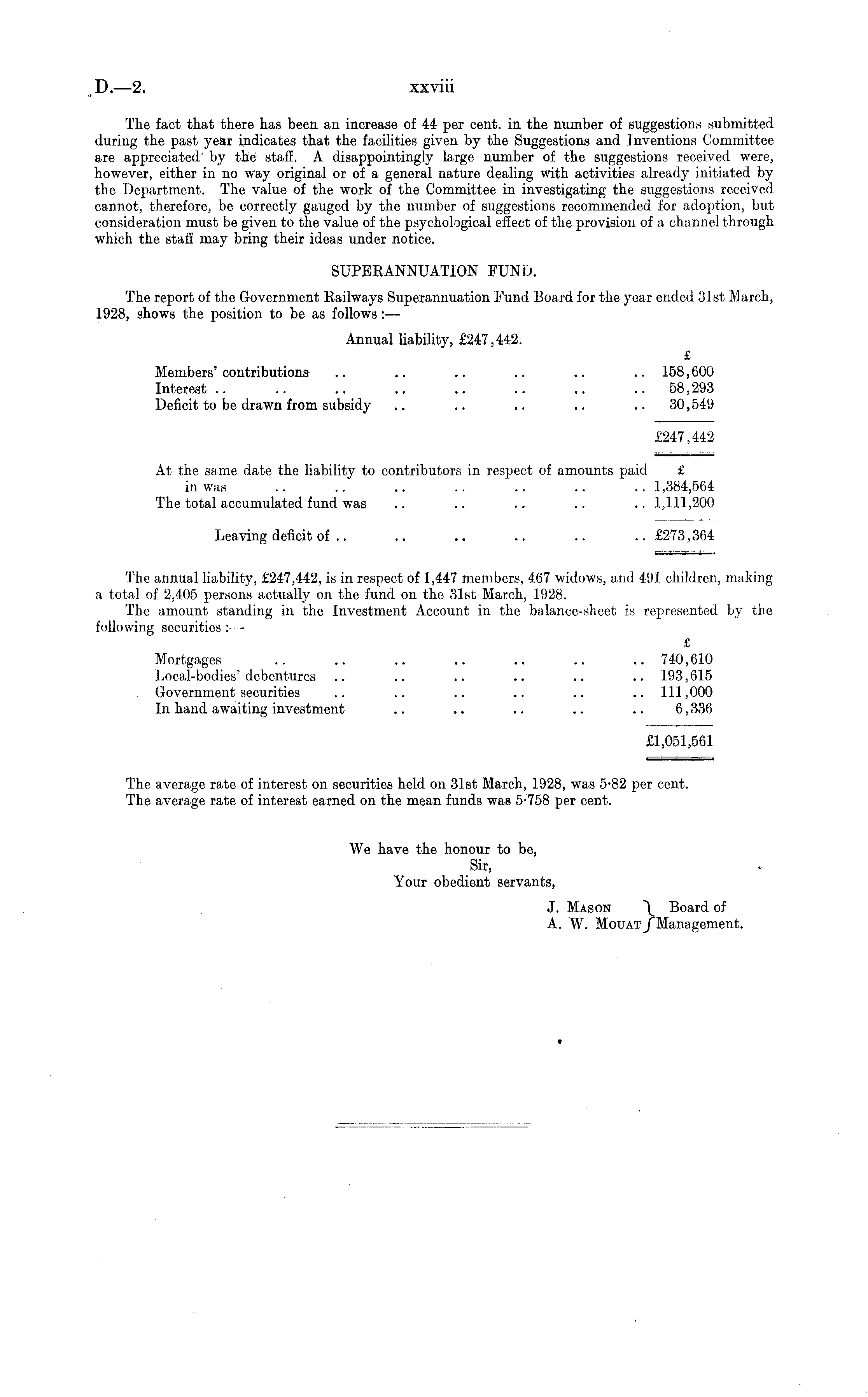 The fact that there has been an increase of 44 per cent, in the number of suggestions submitted during the past year indicates that the facilities given by the Suggestions and Inventions Committee are appreciated by the staff. A disappointingly large number of the suggestions received were, however, either in no way original or of a general nature dealing with activities already initiated by the Department. The value of the work of the Committee in investigating the suggestions received cannot, therefore, be correctly gauged by the number of suggestions recommended for adoption, but consideration must be given to the value of the psychological effect of the provision of a channel through which the staff may bring their ideas under notice. SUPERANNUATION FUND. The report of the Government Railways Superannuation Fund Board for the year ended 31st March, 1928, shows the position to be as follows: — Annual liability, £247,442. £ Members'contributions .. .. .. .. .. .. 158,600 Interest .. .. .. .. .. .. .. .. 58,293 Deficit to be drawn from subsidy .. .. .. .. .. 30,549 £247,442 At the same date the liability to contributors in respect of amounts paid £ in was .. .. .. .. .. .. .. 1,384,564 The total accumulated fund was .. .. .. .. .. 1,111,200 Leaving deficit of .. .. .. .. .. ..£273,364 The annual liability, £247,442, is in respect of 1,447 members, 467 widows, and 491 children, making a total of 2,405 persons actually on the fund on the 31st March, 1928. The amount standing in the Investment Account in tho balance-sheet is represented by the following securities : — £ Mortgages .. .. .. .. .. .. .. 740,610 Local-bodies'debentures .. .. .. .. .. .. 193,615 Government securities .. .. .. .. .. ..11l ,000 In hand awaiting investment .. .. .. .. .. 6,336 £1,051,561 The average rate of interest on securities held on 31st March, 1928, was 5-82 per cent. The average rate of interest earned on the mean funds was 5*758 per cent. We have the honour to be, Sir, » Your obedient servants, J. Mason \ Board of A. W. Mouat/Management.