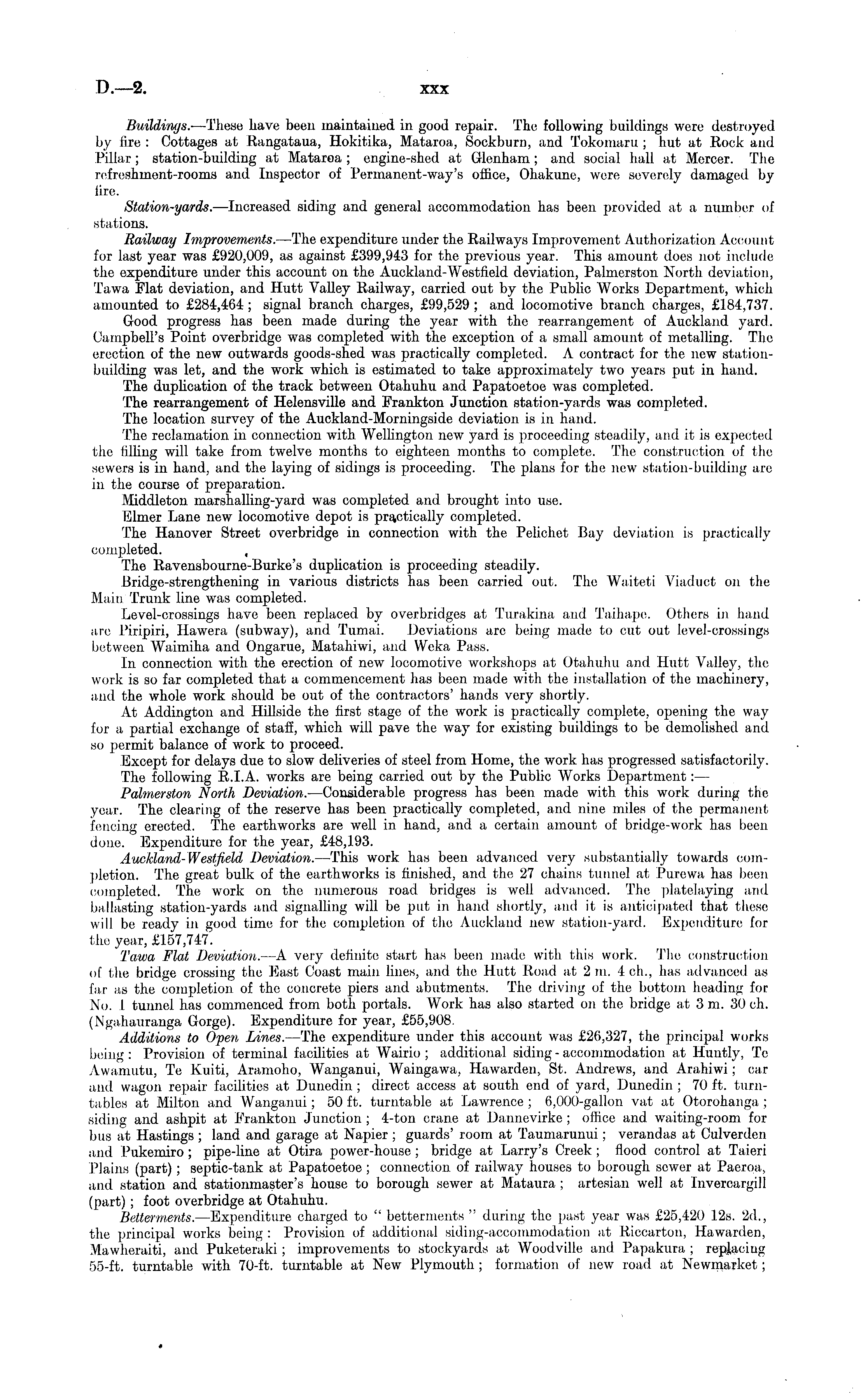 Buildings.- —These have been maintained in good repair. The following buildings were destroyed by fire : Cottages at Rangataua, Hokitika, Mataroa, Sockburn, and Tokomaru ; hut at Rock and Pillar; station-building at Mataroa; engine-shed at Glenham; and social hall at Mercer. The refreshment-rooms and Inspector of Permanent-way's office, Ohakune, were severely damaged by fire. Station-yards. —Increased siding and general accommodation has been provided at a number of stations. Railway Improvements. —The expenditure under the Railways Improvement Authorization Account for last year was £920,009, as against £399,943 for the previous year. This amount does not include the expenditure under this account on the Auckland-Westfield deviation, Palmerston North deviation, Tawa Flat deviation, and Hutt Valley Railway, carried out by the Public Works Department, which amounted to £284,464 ; signal branch charges, £99,529 ; and locomotive branch charges, £184,737. Good progress has been made during the year with the rearrangement of Auckland yard. Campbell's Point overbridge was completed with the exception of a small amount of metalling. The erection of the new outwards goods-shed was practically completed. A contract for the new stationbuilding was let, and the work which is estimated to take approximately two years put in hand. The duplication of the track between Otahuhu and Papatoetoe was completed. The rearrangement of Helensville and Frankton Junction station-yards was completed. The location survey of the Auckland-Morningside deviation is in hand. The reclamation in connection with Wellington new yard is proceeding steadily, and it is expected the filling will take from twelve months to eighteen months to complete. The construction of the sewers is in hand, and the laying of sidings is proceeding. The plans for the new station-building are in the course of preparation. Middleton marshalling-yard was completed and brought into use. Elmer Lane new locomotive depot is practically completed. The Hanover Street overbridge in connection with the Pelichet Bay deviation is practically completed. , The Ravensbourne-Burke's duplication is proceeding steadily. Bridge-strengthening in various districts has been carried out. The Waiteti Viaduct on the Main Trunk line was completed. Level-crossings have been replaced by overbridges at Turakina and Taihape. Others in hand are Piripiri, Hawera (subway), and Tumai. Deviations are being made to cut out level-crossings between Waimiha and Ongarue, Matahiwi, and Weka Pass. In connection with the erection of new locomotive workshops at Otahuhu and Hutt Valley, the work is so far completed that a commencement has been made with the installation of the machinery, and the whole work should be out of the contractors' hands very shortly. At Addington and Hillside the first stage of the work is practically complete, opening the way for a partial exchange of staff, which will pave the way for existing buildings to be demolished and so permit balance of work to proceed. Except for delays due to slow deliveries of steel from Home, the work has progressed satisfactorily. The following R.I.A. works are being carried out by the Public Works Department:— Palmerston North Deviation. —Considerable progress has been made with this work during the year. The clearing of the reserve has been practically completed, and nine miles of the permanent fencing erected. The earthworks are well in hand, and a certain amount of bridge-work has been done. Expenditure for the year, £48,193. Auckland-Westfield Deviation.--Thin work has been advanced very substantially towards completion. The great bulk of the earthworks is finished, and the 27 chains tunnel at Purewa has been completed. The work on the numerous road bridges is well advanced. The platelaying and ballasting station-yards and signalling will be put in hand shortly, and it is anticipated that these will be ready in good time for the completion of the Auckland new station-yard. Expenditure for the year, £157,747. Tawa Flat Deviation. —A very definite start has been made with this work. The construction of the bridge crossing the Flast Coast main lines, and the Hutt Road at 2 m. 4 eh., has advanced as far as the completion of the concrete piers and abutments. The driving of the bottom heading for No. 1 tunnel has commenced from both portals. Work has also started on the bridge at 3m. 30 eh. (Ngahauranga Gorge). Flxpenditure for year, £55,908. Additions to Open Lines. —The expenditure under this account was £26,327, the principal works being : Provision of terminal facilities at Wairio ; additional siding - accommodation at Huntly, Te Awamutu, Te Kuiti, Aramoho, Wanganui, Waingawa, Hawarden, St. Andrews, and Arahiwi; car and wagon repair facilities at Dunedin ; direct access at south end of yard, Dunedin ; 70 ft. turntables at Milton and Wanganui; 50 ft. turntable at Lawrence ; 6,000-gallon vat at Otorohanga ; siding and ashpit at F'rankton Junction ; 4-ton crane at Dannevirke ; office and waiting-room for bus at Hastings ; land and garage at Napier ; guards' room at Taumarunui; verandas at Culverden and Pukemiro ; pipe-line at Otira power-house ; bridge at Larry's Creek ; flood control at Taieri Plains (part) ; septic-tank at Papatoetoe ; connection of railway houses to borough sower at Paeroa, and station and stationmaster's house to borough sewer at Mataura ; artesian well at Invercargill (part) ; foot overbridge at Otahuhu. Betterments. —Expenditure charged to " betterments " during the past year was £25,420 12s. 2d., the principal, works being : Provision of additional siding-accommodation at Riccarton, Hawarden, Mawheraiti, and Puketeraki; improvements to stockyards at Woodville and Papakura ; replacing 55-ft. turntable with 70-ft. turntable at New Plymouth ; formation of new road at Newmarket;
