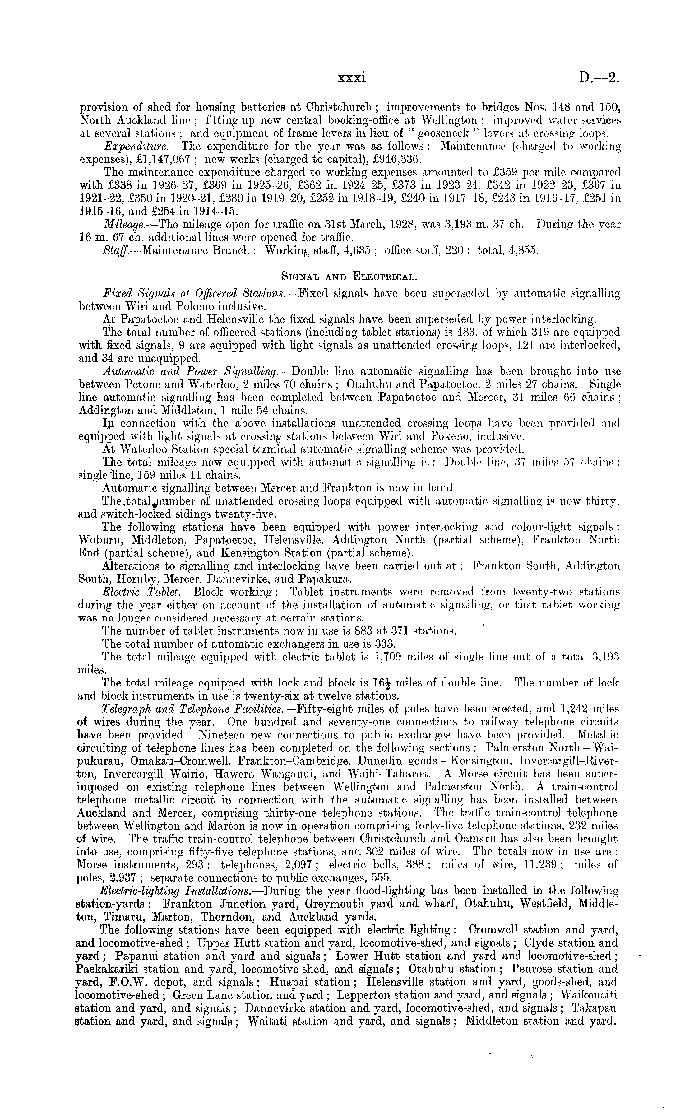 provision of shed for housing batteries at Christchuroh ; improvements to bridges Nos. 148 and 150, North Auckland line ; fitting-up new central booking-office at Wellington ; improved water-services at several stations ; and equipment of frame levers in lieu of " gooseneck " levers at crossing loops. Expenditure. —The expenditure for the year was as follows : Maintenance (charged to working expenses), £1,147,067 ; new works (charged to capital), £946,336. The maintenance expenditure charged to working expenses amounted to £359 per mile compared with £338 in 1926-27, £369 in 1925-26, £362 in 1924-25, £373 in 1923-24, £342 in 1922-23, £367 in 1921-22, £350 in 1920-21, £280 in 1919-20, £252 in 1918-19, £240 in 1917-18, £243 in 1916-17, £251 in 1915-16, and £254 in 1914-15. Mileage.-—The mileage open for traffic on 31st March, 1928, was 3,193 m. 37 eh. During the year 16 m. 67 eh. additional lines were opened for traffic. Staff.— Maintenance Branch : Working staff, 4,635 ; office staff, 220 : total, 4,855. Signal and Ebectbioal. Fixed Signals at Officered Stations. —Fixed signals have been superseded by automatic signalling between Wiri and Pokeno inclusive. At Papatoetoe and Helensville the fixed signals have been superseded by power interlocking. The total number of officered stations (including tablet stations) is 483, of which 319 are equipped with fixed signals, 9 are equipped with light signals as unattended crossing loops, 121 are interlocked, and 34 are unequipped. Automatic and Power Signalling. —Double line automatic signalling has been brought into use between Petone and Waterloo, 2 miles 70 chains ; Otahuhu and Papatoetoe, 2 miles 27 chains. Single line automatic signalling has been completed between Papatoetoe and Mercer, 31 miles 66 chains ; Addington and Middleton, 1 mile 54 chains. In connection with the above installations unattended crossing loops have been provided and equipped with light signals at crossing stations between Wiri and Pokeno, inclusive. At Waterloo Station special terminal automatic signalling scheme was provided. The total mileage now equipped with, automatic signalling is: Double line, 37 miles 57 chains; single line, 159 miles 11 chains. Automatic signalling between Mercer and Frankton is now in hand. The,totalJiumber of unattended crossing loops equipped with automatic signalling is now thirty, and switch-locked sidings twenty-five. The following stations have been, equipped, with power interlocking and colour-light signals : Woburn, Middleton, Papatoetoe, Helensville, Addington North (partial scheme), Frankton North End (partial scheme), and Kensington Station (partial scheme). Alterations to signalling and interlocking have been carried out at,: Frankton South, Addington South, Hornby, Mercer, Dannevirke, and Papakura. Electric Tablet. —Block working : Tablet instruments were removed from twenty-two stations during the year either on acoount of the installation of automatic signalling, or that tablet working was no longer considered-necessary at certain stations. The number of tablet instruments now in use is 883 at 371 stations. The total number of automatic exchangers in use is 333. The total mileage equipped with electric tablet is 1,709 miles of single line out of a, total 3,193 miles. The total mileage equipped with lock and block is 16| miles of double line. The number of lock and block instruments in use is twenty-six at twelve stations. Telegraph and Telephone Facilities. —Fifty-eight miles of poles have been erected, and 1,242 miles of wires during the year. One hundred, and seventy-one connections to railway telephone circuits have been provided. Nineteen new connections to public exchanges have been provided. Metallic circuiting of telephone lines has been completed on the following sections : Palmerston North- Waipukurau, Omakau-Cromwell, Frankton-Cambridgo, Dunedin goods - Kensington, Invercargill-River-ton, Invercargill-Wairio, Ha wera-Wanganui, and Waihi-Taharoa. A Morse circuit has been superimposed, on. existing telephone lines between Wellington and Palmerston North. A train-control telephone metallic circuit in connection with the automatic signalling has been installed between Auckland and Mercer, comprising thirty-one telephone stations. The traffic train-control telephone between Wellington and Marton is now in operation comprising forty-five telephone stations, 232 miles of wire. The traffic train-control telephone between Christchurch and Oamaru has also been brought into use, comprising fifty-five telephone stations, and. 302 miles of wire. The totals now in use are : Morse instruments, 293; telephones, 2,097; electric bells, 388; miles of wire, 11,239; miles of poles, 2,937 ; separate connections to public exchanges, 555. Electric-lighting Installations. —During the year flood-lighting has been installed in the following station-yards : Frankton Junction yard, Greymouth yard and wharf, Otahuhu, Westfield, Middleton, Timaru, Marton, Thorndon, and Auckland yards. The following stations have been equipped with electric lighting: Cromwell station, and yard, and locomotive-shed ; Upper Hutt station and yard, locomotive-shed, and signals ; Clyde station and yard; Papanui station and yard and signals ; Lower Hutt station and yard and locomotive-shed; Paekakariki station and yard, locomotive-shed, and signals ; Otahuhu station ; Penrose station and yard, F.O.W. depot, and signals; Huapai station; Helensville station and yard, goods-shed, and locomotive-shed ; Green Lane station and yard ; Lepperton station and yard, and signals ; Waikouaiti station and yard, and signals ; Dannevirke station and yard, locomotive-shed, and signals ; Takapau station and yard, and signals; Waitati station and yard, and signals : Middleton station and yard.