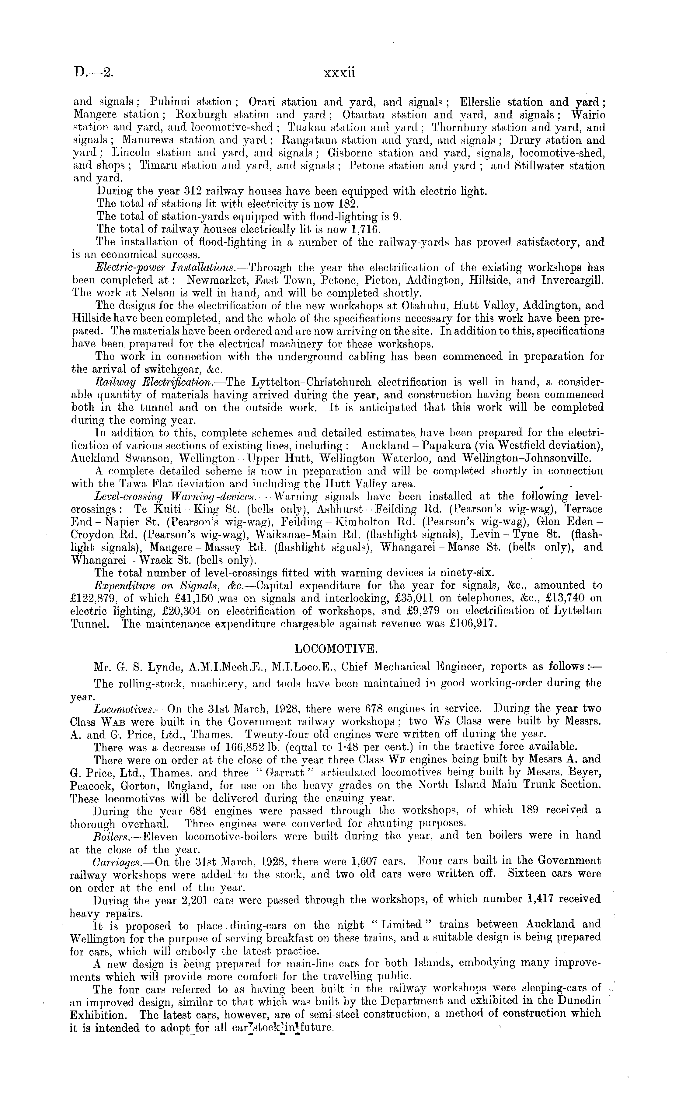 and signals ; Puhinui station ; Orari station and yard, and signals ; Ellerslie station and yard ; Mangere station ; Roxburgh station and yard.; Otautau station and yard, and signals ; Wairio station and yard, and locomotive-shed ; Tuakau station and yard.; Thornbury station and yard, and signals ; Man urewa station and yard ; Rangataua station and yard, and signals ; Drury station and yard; Lincoln, station and yard, and signals; Gisborne station and yard, signals, locomotive-shed, and shops ; Timaru station and yard, and signals ; Petone station and yard ; and Stillwater station and yard. During the year 312 railway houses have been equipped with electric light. Tho total of stations lit with electricity is now 182. The total of station-yards equipped, with flood-lighting is 9. The total of railway houses electrically lit is now 1,716. The installation of flood-lighting in a number of the railway-yards has proved satisfactory, and is an economical success. Electric-power Installations. —Through the year the electrification of the existing workshops has been completed at: Newmarket, East Town, Petone, Picton, Addington, Hillside, and Invercargill. The work at Nelson, is well in hand, and will be completed, shortly. The designs for the electrification of tho new workshops at Otahuhu, Hutt Valley, Addington, and Hillside have been completed, and the whole of the specifications necessary for this work have been prepared. The materials have been ordered and are now arriving on the site. In addition to this, specifications have been prepared for the electrical machinery for these workshops. The work in connection with the underground cabling has been commenced in preparation for the arrival of switchgear, &c. Railway Electrification. —The Lyttelton-Christchurch electrification is well in hand, a considerable quantity of materials having arrived during the year, and construction having been commenced both in the tunnel and on the outside work. It is anticipated that this work will be completed during the coming year. In addition to this, complete schemes and detailed estimates have been prepared for the electrification of various sections of existing lines, including : Auckland - Papakura (via Westfield deviation), Auckland-Swanson, Wellington - Upper Hutt, Wellington-Waterloo, and Wellington-Johnsonville. A complete detailed scheme is now in preparation and will be completed shortly in connection with the Tawa, Flat deviation and including the Hutt Valley area. Level-crossing Warning-devices. — Warning signals have been installed at the following levelcrossings : Te Kuiti - King St. (bells only), Ashhurst - Feilding Rd. (Pearson's wig-wag), Terrace End-Napier St. (Pearson's wig-wag), Feilding - Kimbolton Rd. (Pearson's wig-wag), Glen EdenCroydon Rd. (Pearson's wig-wag), Waikanae-Main Rd. (flashlight signals), Levin - Tyne St. (flashlight signals), Mangere - Massey Rd. (flashlight signals), Whangarei - Manse St. (bells only), and Whangarei -Wrack St. (bells only). The total number of level-crossings fitted with warning devices is ninety-six. Expenditure on Signals, &c. —Capital expenditure for the year for signals, &c, amounted to £122,879, of which £41,150 .was on signals and interlocking, £35,011 on telephones, &c, £13,740 on electric lighting, £20,304 on electrification of workshops, and £9,279 on electrification of Lyttelton Tunnel. The maintenance expenditure chargeable against revenue was £106,917. LOCOMOTIVE. Mr. G. S. Lynde, A.M.I.Mech.E., M.1.L0c0.E., Chief Mechanical Engineer, reports as follows:— The rolling-stock, machinery, and tools have been maintained in good working-order during the year. Locomotives. —On the 31st March, 1928, there were 678 engines in service. During the year two Class Wab were built in the Government railway workshops ; two Ws Class were built by Messrs. A. and G. Price, Ltd., Thames. Twenty-four old engines were written off during the year. There was a decrease of 166,852 lb. (equal to 1-48 per cent.) in the tractive force available. There were on order at the close of the year three Class Wf engines being built by Messrs A. and G. Price, Ltd., Thames, and. three " Garratt " articulated locomotives being built by Messrs. Beyer, Peacock, Gorton, England, for use on the. heavy grades on the North Island Main Trunk Section. These locomotives will be delivered during the ensuing year. During the year 684 engines were passed through the workshops, of which 189 received a thorough overhaul. Throe engines were converted for shunting purposes. Boilers. —Eleven locomotive-boilers were built during the year, and ten boilers were in hand at the close of the year. Carriages. —On the 31st March, 1928, there were 1,607 cars. Four cars built in the Government railway workshops were added to the stock, and. two old cars were written offi. Sixteen cars were on order at the end of the year. During the year 2,201 cars were passed through the workshops, of which number 1,417 received heavy repairs. It is proposed to place. dining-cars on the night "Limited" trains between Auckland and Wellington for the purpose of serving breakfast on these trains, and a suitable design is being prepared for cars, which will embody the latest practice. A new design is being prepared for main-line cars for both Islands, embodying many improvements which will provide more comfort for the travelling public. The four cars referred to as having been built in the railway workshops were sleeping-cars of an improved design, similar to that which was built by the Department and exhibited in the Dunedin Exhibition. The latest cars, however, are of semi-steel construction, a method of construction which it is intended to adopt for all car'stockMnJfuture.