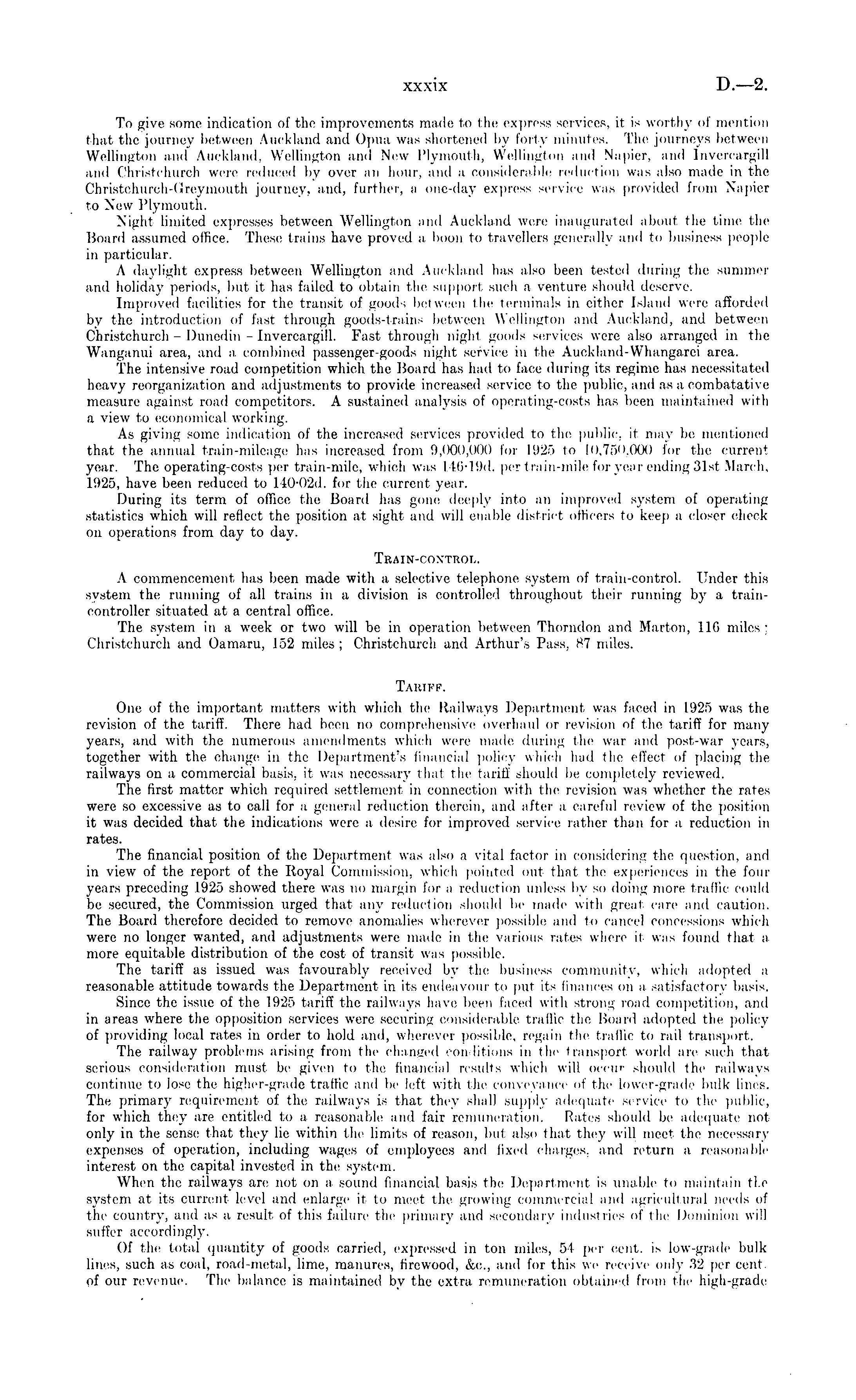 To give some indication of the improvements made to the express services, it is worthy of mention that the journey between Auckland and Opua was shortened by forty minutes. The journeys between Wellington and Auckland, Wellington and New Plymouth, Wellington and Napier, and Invercargill and Christchurch wore reduced by over an hour, and a considerable reduction was also made in the Christchurch-Greymouth journey, and, further, a. one-day express service was provided from Napier to New Plymouth. Night limited expresses between Wellington and Auckland were inaugurated about the time the Board assumed office. These trains have proved a boon to travellers generally and to business people in particular. A daylight express between Wellington and Auckland has also been tested during the summer and holiday periods, but it has failed to obtain the support such a venture should deserve. Improved facilities for the transit of goods between the terminals in either Island were afforded by the introduction of fast through goods-trains between Wellington and Auckland, and between Christchurch - Dunedin - Invercargill. Fast through night goods services were also arranged in the Wanganui area, and a combined passenger-goods night service in the Auckland-Whangarei area. The intensive road competition which the Board has had to face during its regime has necessitated heavy reorganization and adjustments to provide increased service to the public, and as a combatative measure against road competitors. A sustained analysis of operating-costs has been maintained with a view to economical working. As giving some indication of the increased services provided to the public, it may be mentioned that the annual train-mileage has increased from 9,000,000 for 1925 to 10,750,000 for the current year. The operating-costs per train-mile, which was 146-19 d. per train-mile for year ending 31st March, 1925, have been reduced to 140-02 d. for the current year. During its term of office the Board has gone deeply into an improved system of operating statistics which will reflect the position at sight and will enable district officers to keep a closer check on operations from day to day. Train-control. A commencement has been made with a selective telephone system of train-control. Under this system the running of all trains in a division is controlled throughout their running by a traincontroller situated at a central office. The system in a week or two will be in operation between Thorndon and Marton, 116 miles ; Christchurch and Oamaru, 152 miles ; Christchurch and Arthur's Pass, 87 miles. Tariff. One of the important matters with which the Railways Department was faced in 1925 was the revision of the tariff. There had been no comprehensive overhaul or revision of the tariff for many years, and with the numerous amendments which were made during the war and post-war years, together with the change in the Department's financial policy which had the effect of placing the railways on a commercial basis, it was necessary that the tariff should be completely reviewed. The first matter which required settlement in connection with the revision was whether the rates were so excessive as to call for a general reduction therein, and after a careful review of the position it was decided that the indications were a desire for improved service rather than for a reduction in rates. The financial position of the Department was also a vital factor in considering the question, and in view of the report of the Royal Commission, which pointed out that the experiences in the four years preceding 1925 showed there was no margin for a reduction unless by so doing more traffic could be secured, the Commission urged that any reduction should be made with great care and caution. The Board therefore decided to remove anomalies wherever possible and to cancel concessions which were no longer wanted, and adjustments were made in the various rates where it was found that a. more equitable distribution of the cost of transit was possible. The tariff as issued was favourably received by the business community, which adopted a reasonable attitude towards the Department in its endeavour to put its finances on a satisfactory basis. Since the issue of the 1925 tariff the railways have been faced with strong road competition, and in areas where the opposition services were securing considerable traffic the Board adopted the policy of providing local rates in order to hold and, wherever possible, regain the traffic to rail transport. The railway problems arising from the changed conditions in the transport world are such that serious consideration must be given to the financial results which will occur should the railways continue to lose the higher-grade traffic and be left with the conveyance of the lower-grade bulk lines. The primary requirement of the railways is that they shall supply adequate service to the public, for which they are entitled to a reasonable and fair remuneration. Rates should be adequate not only in the sense that they lie within the limits of reason, but also that they will meet the necessary expenses of operation, including wages of employees and fixed charges, and return a reasonable interest on the capital invested in the system. When the railways are not on a sound financial basis the Department is unable to maintain the system at its current level and enlarge it to meet the growing commercial and agricultural needs of the country, and as a result of this failure the primary and secondary industries of the Dominion will suffer accordingly. Of the total quantity of goods carried, expressed in ton miles, 54 per cent, is low-grade bulk lines, such as coal, road-metal, lime, manures, firewood, &c., and for this we receive only 32 per cent, pf our revenue. The balance is maintained by the extra remuneration obtained from the high-grade
