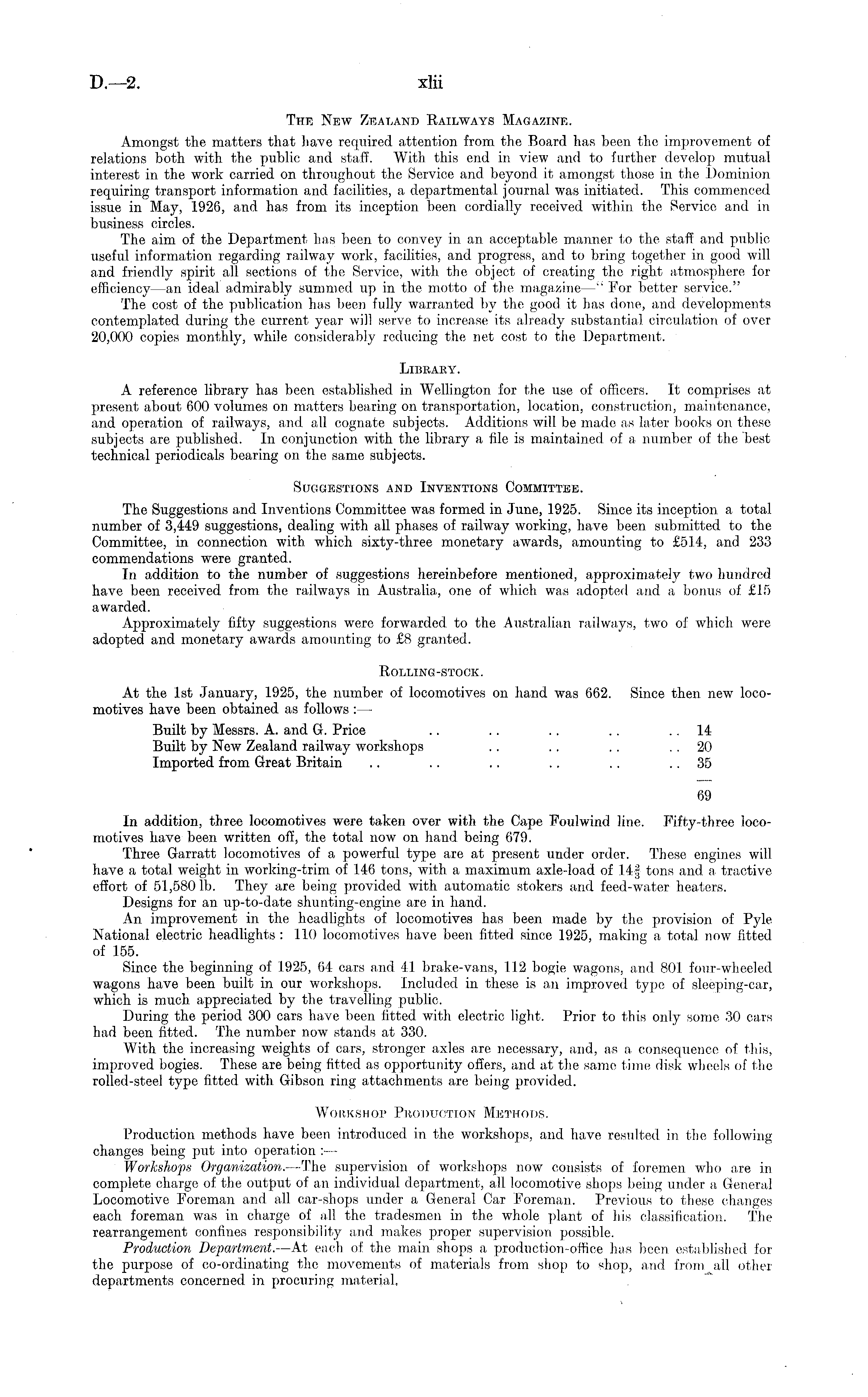 The New Zealand Railways Magazine. Amongst the matters that have required attention from the Board has been tho improvement of relations both with the public and staff. With this end in view and to further develop mutual interest in the work carried on throughout the Service and beyond it amongst those in the Dominion requiring transport information and facilities, a departmental journal was initiated. This commenced issue in May, 1926, and has from its inception been cordially received within the Service and in business circles. The aim of the Department has been to convey in an acceptable manner to the staff and public useful information regarding railway work, facilities, and progress, and to bring together in good will and friendly spirit all sections of the Service, with the object of creating the right atmosphere for efficiency—an ideal admirably summed up in the motto of the magazine—" For better service." The cost of the publication has been fully warranted by the good it has done, and developments contemplated during the current year will serve to increase its already substantial circulation of over 20,000 copies monthly, while considerably reducing the net cost to the Department. Library. A reference library has been, established in Wellington for the use of officers. It comprises at present about 600 volumes on matters bearing on transportation, location, construction, maintenance, and operation of railways, and all cognate subjects. Additions will be made as later books on these subjects are published. In conjunction with the library a file is maintained of a number of the best technical periodicals bearing on the same subjects. Suggestions and Inventions Committee. The Suggestions and Inventions Committee was formed in June, 1925. Since its inception a total number of 3,4-49 suggestions, dealing with all phases of railway working, have been submitted to the Committee, in connection with, which sixty-three monetary awards, amounting to £514, and 233 commendations were granted. In addition to the number of suggestions hereinbefore mentioned, approximately two hundred have been received from the railways in Australia, one of which was adopted and a bonus of £15 awarded. Approximately fifty suggestions were forwarded to the Australian railways, two of which were adopted and monetary awards amounting to £8 granted. Rolling-stock. At the Ist January, 1925, the number of locomotives on hand was 662. Since then new locomotives have been obtained as follows :— Built by Messrs. A. and G. Price .. .. .. .. 14 Built by New Zealand railway workshops .. . . . . 20 Imported from Great Britain .. .. .. .. .. .. 35 69 In addition, three locomotives were taken over with the Cape Foulwind line. Fifty-three locomotives have been written off, the total now on hand being 679. Three Garratt locomotives of a powerful type are at present under order. These engines will have a total weight in working-trim of 146 tons, with a maximum axle-load of 14| tons and. a tractive effort of 51,580 lb. They are being provided with automatic stokers and feed-water heaters. Designs for an up-to-date shunting-engine are in hand. An improvement in the headlights of locomotives has been made by the provision of Pyle National electric headlights : 110 locomotives have been fitted since 1925, making a total now fitted of 155. Since the beginning of 1925, 64 oars and 41 brake-vans, 112 bogie wagons, and 801 four-wheeled wagons have been built in our workshops. Included in these is an improved type of sleeping-car, which is much appreciated by the travelling public. During the period 300 cars have been fitted with electric light. Prior to this only some 30 cars had been fitted. The number now stands at 330. With the increasing weights of cars, stronger axles are necessary, and, as a consequence of this, improved bogies. These are being fitted as opportunity offers, and at the same time disk wheels of the rolled-steel type fitted with Gibson ring attachments are being provided. WOEKSHOP PRODUCTION METHODS. Production methods have been introduced in the workshops, and have resulted in the following changes being put into operation : — Workshops Organization. —The supervision of workshops now consists of foremen who are in complete charge of the output of an individual department, all. locomotive shops being under a General Locomotive Foreman and all car-shops under a General Car Foreman. Previous to these changes each foreman was in charge of all the tradesmen in the whole plant of his classification. The rearrangement confines responsibility and makes proper supervision possible. Production Department. —At each of the main shops a production-office has been established for the purpose of co-ordinating the movements of materials from shop to shop, and from all other departments concerned in procuring material.