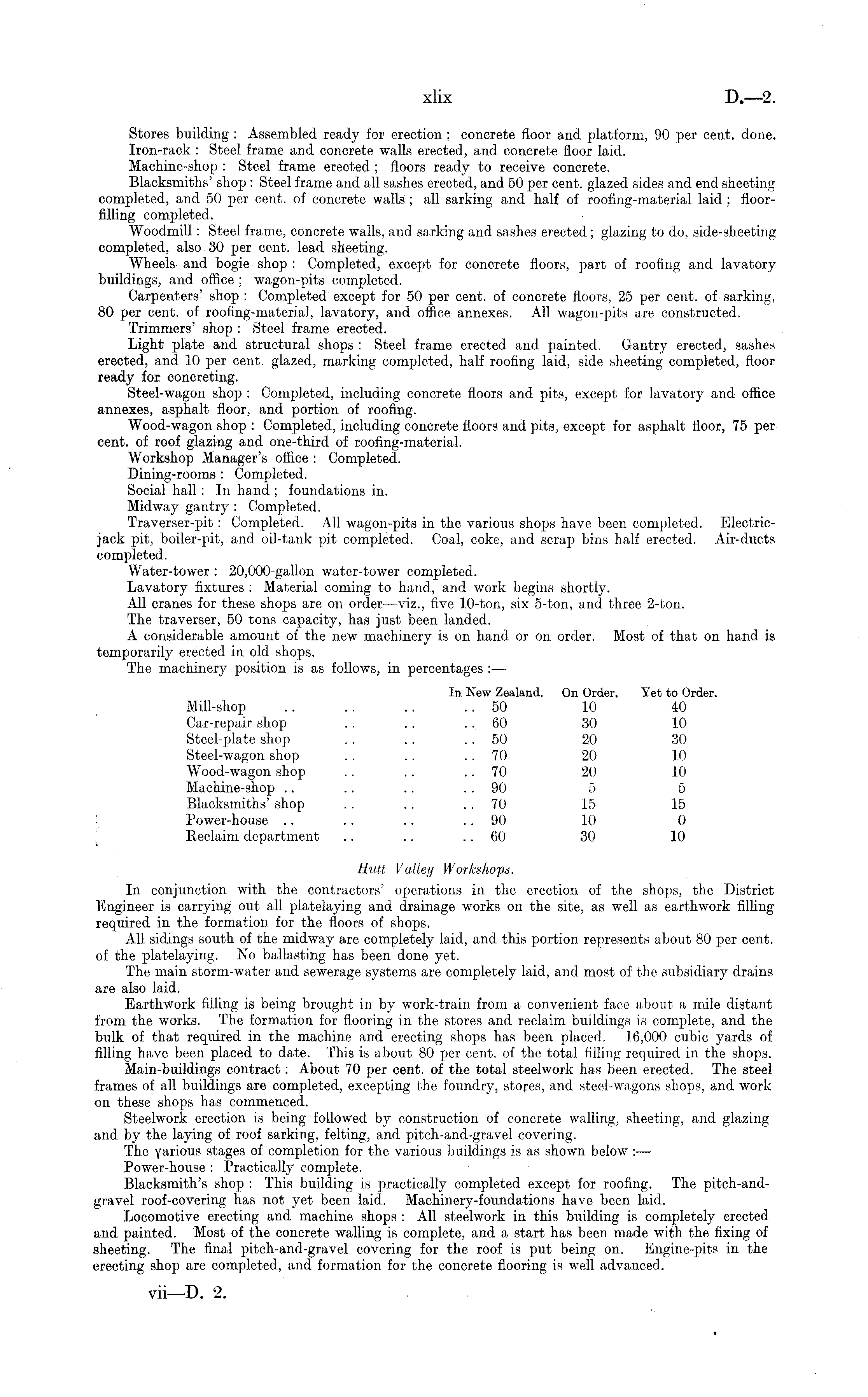Stores building : Assembled ready for erection ; concrete floor and platform, 90 per cent. done. Iron-rack : Steel frame and concrete walls erected, and concrete floor laid. Machine-shop : Steel frame erected ; floors ready to receive concrete. Blacksmiths' shop : Steel frame and all sashes erected, and 50 per cent, glazed sides and end sheeting completed, and 50 per cent, of concrete walls ; all sarking and half of roofing-material laid ; floorfilling completed. Woodmill: Steel frame, concrete walls, and sarking and sashes erected ; glazing to do, side-sheeting completed, also 30 per cent, lead sheeting. Wheels and bogie shop : Completed, except for concrete floors, part of roofing and lavatory buildings, and office ; wagon-pits completed. Carpenters' shop : Completed except for 50 per cent, of concrete floors, 25 per cent, of sarking, 80 per cent, of roofing-material, lavatory, and office annexes. All wagon-pits are constructed. Trimmers' shop : Steel frame erected. Light plate and. structural shops : Steel frame erected and painted. Gantry erected, sashes erected, and 10 per cent, glazed, marking completed, half roofing laid, side sheeting completed, floor ready for concreting. Steel-wagon shop : Completed, including concrete floors and pits, except for lavatory and office annexes, asphalt floor, and portion of roofing. Wood-wagon shop : Completed, including concrete floors and pits, except for asphalt floor, 75 per cent, of roof glazing and one-third of roofing-material. Workshop Manager's office : Completed. Dining-rooms : Completed. Social hall : In hand ; foundations in. Midway gantry : Completed. Traverser-pit : Completed. All wagon-pits in the various shops have been completed. Electricjack pit, boiler-pit, and oil-tank pit completed. Coal, coke, and scrap bins half erected. Air-ducts completed. Water-tower : 20,000-gallon water-tower completed. Lavatory fixtures : Material coming to hand, and work begins shortly. All cranes for these shops are on order—viz., five 10-ton, six 5-ton, and three 2-ton. The traverser, 50 tons capacity, has just been landed. A considerable amount of the new machinery is on hand or on order. Most of that on hand is temporarily erected in old shops. The machinery position is as follows, in percentages : — In New Zealand. On Order. Yet to Order. Mill-shop .. .. .. ..50 10 40 Car-repair shop .. . . . . 60 30 10 Steel-plate shop .. .. . . 50 20 30 Steel-wagon shop .. .. . . 70 20 10 Wood-wagon shop . . .. .. 70 20 10 Machine-shop .. . . .. .. 90 5 5 Blacksmiths' shop .. .. . . 70 15 15 Power-house .. .. .. ..90 10 0 Reclaim department .. .. . . 60 30 10 Hutt Valley Workshops. In conjunction with the contractors' operations in the erection of the shops, the District Engineer is carrying out all platelaying and drainage works on the site, as well as earthwork filling required in the formation for the floors of shops. All sidings south of the midway are completely laid, and this portion represents about 80 per cent, of the platelaying. No ballasting has been done yet. The main storm-water and sewerage systems are completely laid, and most of the subsidiary drains are also laid. Earthwork filling is being brought in by work-train from a convenient face about a mile distant from the works. The formation for flooring in the stores and reclaim buildings is complete, and the bulk of that required in the machine and erecting shops has been placed. 16,000 cubic yards of filling have been placed to date. This is about 80 per cent, of the total filling required in the shops. Main-buildings contract : About 70 per cent, of the total steelwork has been erected. The steel frames of all buildings are completed, excepting the foundry, stores, and steel-wagons shops, and work on these shops has commenced. Steelwork erection is being followed by construction of concrete walling, sheeting, and glazing and by the laying of roof sarking, felting, and pitch-and-gravel covering. The yarious stages of completion for the various buildings is as shown below : — Power-house : Practically complete. Blacksmith's shop : This building is practically completed except for roofing. The pitch-and-gravel roof-covering has not yet been laid. Machinery-foundations have been laid. Locomotive erecting and machine shops : All steelwork in this building is completely erected and painted. Most of the concrete walling is complete, and a start has been made with the fixing of sheeting. The final pitch-and-gravel covering for the roof is put being on. Engine-pits in the erecting shop are completed, and formation for the concrete flooring is well advanced.