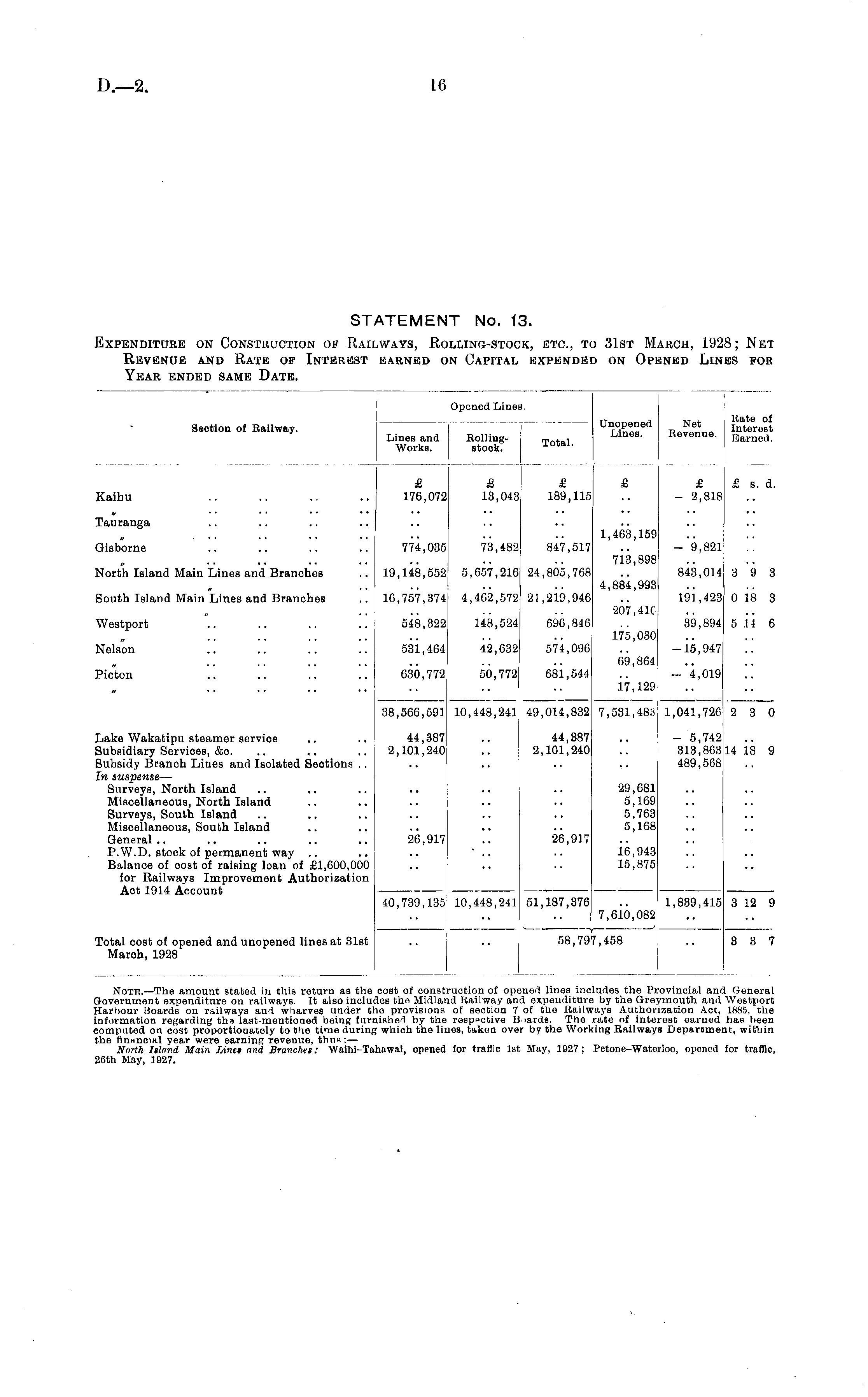 STATEMENT No. 13. Expenditure on Construction of Railways, Rolling-stock, etc., to 31st March, 1928; Net Revenue and Rate of Interest earned on Capital expended on Opened Lines for Year ended same Date.