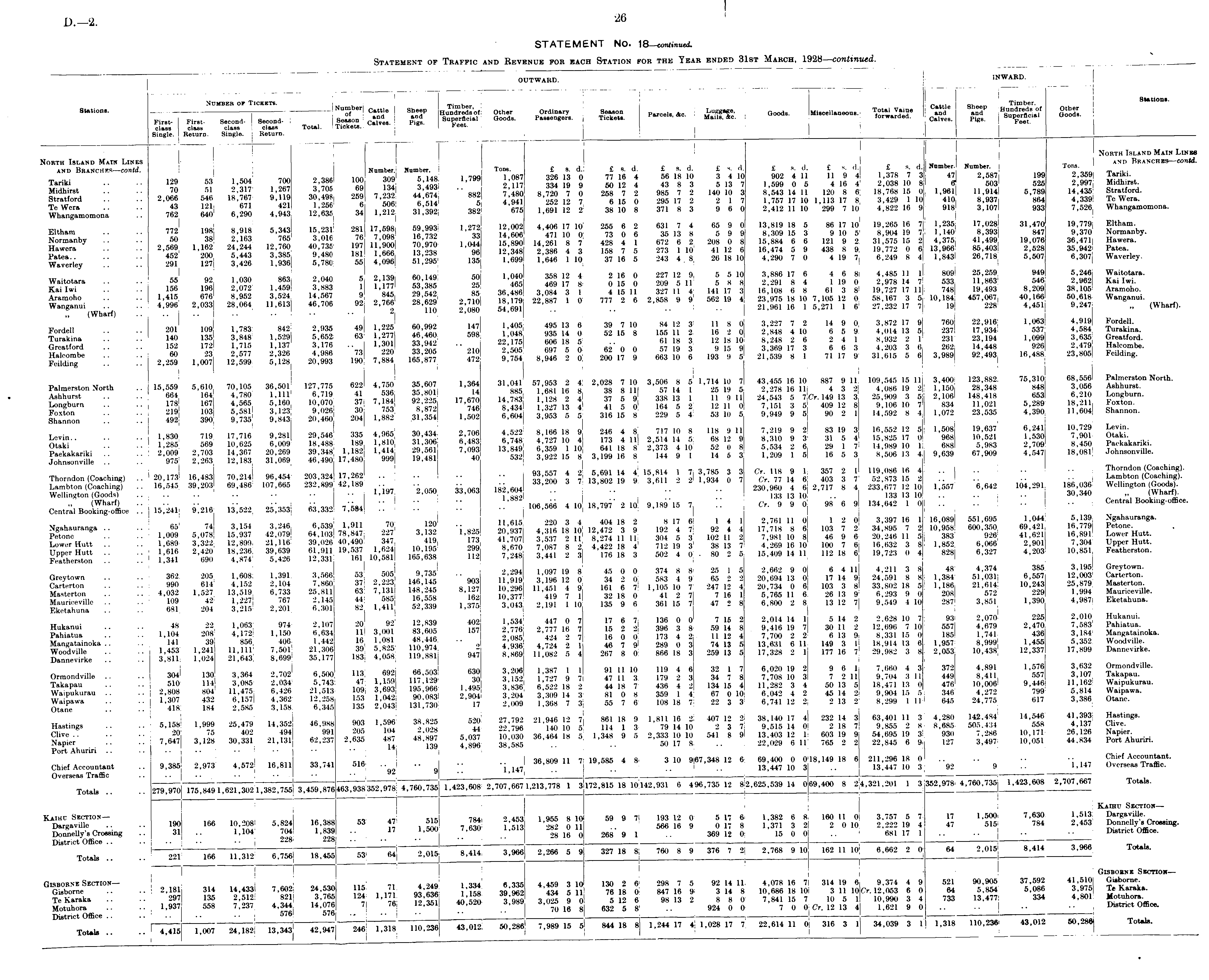 OUTWARD. ; INWAED. Number of Tickets. , ay,,..-, Timber, Stations. Stations. * er Cattle Sheep Hundreds'of Other Ordinary Season Parcels See LuR g aee, Goods. Miscellaneous. * nd and Goods First- First- Second- | Second- Season <£{£,. Superficial Goods. Passengers. Tickets. Parcels, &c. Malls> &c . forwarded. Calye8 pig6 Buccal G0 ° dB - class class class class Total. Tickets. Single. | Return. Single, j Return. j | | I I I | North Island Main Lines North Island Main Lines and Branches —contd. and Branches—contd. NumberJ Number. Tons. £ s. d. £ s. d. £ s. d. £ s. d. £ 8. d. £ s. d. £ s. f l_ • u e '" TnriVi m ... ' , Kn , 7nn 9 o 8fi ion 309 5 148 1 799 1,087 326 13 0 77 16 4 56 18 10 3 4 10 902 4 11 11 9 4 1,378 7 3 47 2,587 199 2,359 Tariii. Tariki .. .. 129 531 1,504 700 2,386 100 309, 5,148 1,1 , 334 I0 9 50 12 4 43 8 3 5 13 7 1,599 0 5 4 16 4 2,038 10 8 <? 503 525 2,997 Midhirst. Midhirst .. .. 70 51 2,317 1,267 3,705 69 134 3,49J .. , 258 7 2 985 7 2 140 10 3 8,543 14 11 120 8 6 18,768 15 0 1,961 11,914 5,789 14,435 Stratford. Stratford .. .. 2,066 546 18,767 9,119 30,49 259 7,232 44,6 4 882 7 480 0 258 J 2 985 „ w „ g 3 ; 429 1 10 4IO 8>937 ' 8 64 4,339 Te Wera. " 762 6,290 4,943 12! 635 34 1, 31 >2 382 675 1,691 12 2 38 10 8 371 8 3 9 6 0 2,412 11 10 299 7 10 4,822 16 9 918 3,107 933 7,526 Whangamomona. „J ,J a mo _ 1K 9 „i 981 17 500 59 093 x 272 12,002 4,406 17 10 255 6 2 631 7 4 65 9 0 13,819 18 5 86 17 10 19,265 16 7 1,235 17,028 31,470 19,779| Eltham. Eltham •• •• 7 aqq 16732 1 '33 14 606 471 10 0 73 0 6 35 13 8; 5 9 9 8,309 15 3 9 10 5 8,904 19 7 1,140 8,393 847 9,370 Normanby. Normanby .. .. 50 38 2,163 765 ™ 11 qoo 7()'<)70 1 044 15 890 14 261 8 7 428 4 1 672 6 2! 208 0 8 15,884 6 6 121 9 2 31,575 15 2 4,375 41,499, 19,076 36,471 Hawera. Hawera .. .. 2,569, 1,162 24,244 !2,760 ' 96 l"'s48 2'386 4 3 158 7 5 273 1 10 41 12 6 16,474 5 9 438 8 9 19,772 0 6 13,966 85,403 2,528 35,942 Patea. y*.- ;; ;; £ Jg |;g };gj !;S 5 3 SS m 110 ' m «,«| » »1. «>. t ♦ '» *-'» «•«" „ CO 100 sn 1J.Q ka 1 040 358 12 4 2 16 0 227 12 9 5 5 10 3,886 17 6 4 6 8 4,485 11 1 809 25,259 949 5,246 Waitotara. Waitotara .. .. 55 92 1,030 863 2,040 5 -,139 60, ' 46g 469 17 8 0 15 0 209 5 11 5 8 8 2,291 8 4 1 19 0 2,978 14 7 533 11,863 546 2,962 Kai Iwi. Kailwi .. .. 156 196 2,072 1,459 ,®' 8^ 3 I 'l[l 85 36 486 3 0S4 3 1 4 15 11 327 11 4 141 17 3 16,108 6 8 61 3 8 19,727 17 11 748 19,493 8,209 38,105 Aramoho. Aramoho .. .. 1,415 676 8.952 3,524 „ ntl 2 8 '6">9 2 710 is' 179 22' 8 87 1 0 777 2 6 2,858 9 9 562 19 4 23,975 18 10 7,105 12 0 58,167 3 5 10,184 457,067 40,166 50,618 Wanganui. Wanganui .. .. 4,996 2,033 28,064 11,613 46,706 92 2,766 28,629 2,710 18,179 22,8S7 10 - 21 961 16 1 5 271 1 6 27,232 17 7 19 228 4,451 9,247 „ (Wharf). (Wharf) .. .. .. .. • • .. .. 2 110 2,080 04,o»i .. .. " ' ! oon AO QQ.> 1J.-7 1 405 495 13 6 39 7 10 84 12 3 11 8 0 3,227 7 2 14 9 0, 3,872 17 9 760 22,916: 1,063 4,919 Fordell. Fordell .. .. 201 109 1,783 842 2,935 49 1,225 60,992 147 1,405 495 13 b 39 I 1U a* 16 2 0 2 848 4 10 6 5 9 4 014 13 5 237 17,934 537 4,584 Turakina. Turakina . .. 140 135 3 848 1,529 5,652 63 1,277 46,460 598 1,048 935 4 0 52 15 8 155 1 2 6 2 0 2 848 4 10 6 5 9, 4 014 13 5 237 3,63.5 Greatford. Greatford .. .. 152 172 1,715 1,137 3,176 .. 1,301 33,942 .. 22,175 606 18 5 "• * ! 9 ° 9 3 369 17 3 6 6 3 4 203 3 6 262 14,448 926 2,479 Halcombe. SaSSf :: :: 2,259 1,™ 1 IS IS 187.2 iftffl S •$ *,% I 8 £1? I «SS i «£ 1 I «':«• 8 1 7m « u :«« 5 • ...» 92,493 u .«» 23,805 **** Palmerston North .. 15,559 5,610 70,105 36,501 127,7751 622 4,750 35,607 1,364 31,041 57,953 2 J 2,028 7 loj 3.506 8 J 1.714 10 7 43 455 16 10 887 9 11 >09 545 15 1J 3 400 123 882 75,310 68,556 North. Ashhurst .. .. 664[ 164 4,780 1,111 6,719 41 536 35,801 14 885 ,681 16 8 38 8 llj 57 4 25 19 a 2 2£ 25 909 3 5 21(|6 14 8,41 8 653 6,210 Longburn. Longburn .. .. 178 167 4,565 5,160 10,070 37 7,184 92,225 17,670 14,783 ,128 2 4 37 5 9, 338 13 1 11 ? « s & g Q J u 5>2g9 18,211 Foxton. Shannon " !! 492 390 9 J35 2IM60 1 204 1.882 31! 354 1,502 6 >04 3',953 5 5j 316 15 8 229 5 4, 53 10 5 9,949 9 5 90 2 1 14,592 8 4 1.072 23,535 4,390 11,604 Shannon. Lei. 0 " •• 1.H 719 17 ' 716 9 ' 281 29 ' 546 ' SS i-25 31' 306 S'S tS 2*«5 10 4 1 « 12 'I S 9 3 4 S" o| US S oS£j Otaki .. .. 1,285 569 10,625 6,009 18,488 189 1,810 31,306 6,483 6,748 4,727 10 4 3 | , 2 6 29 1 7 14,989 10 1! 688 5,983 2,709 8,450 Paekakariki. :: :: 2 'S IS S;X "« S:S *•» IS 5;S»'« ...»■! « » ■ « . > >.*»>» « » » » ♦! ».«• *•"> 18 - 081 [ Thorndon (Coaching) .. 20.173' 16.483] 70,214 96,454 203.324 17,262 .. ■■ jj3,557 4 2 14 4 15,814 . 7 3,735 3 3 Cr. H8 9 1 357 2 1 '19.086 16 4 .. .. ■■ (Coachingi! Lambton (Coaching) .. 16,545 39,203 69,486 107,665 232,899 42,189 .. •• •• 33,-00 3 7 13,802 19 9 3,bl U 230 960 4 6 2,717 8 4 233,677 12 10 1,557 6,642 104,291 186,036 Wellington Goods). Wellington (Goods) .. ..I 2 > 050 33 ' 0bJ | .. 133 13 10 .. 133 13 10 .. .. .. 30,340 „ Wharf). (Wharf) .. • • •• •• •• •• 1 ' S8 ' 2 .06 566 4 10 18 797' 2 10 9 189 15 7 .. Cr. 9 9 0 98 6 9 134,642 1 0 .. .. •• •• Central Booking-office. Central Booking-office .. 15,241 9,216 13,522 25,353 63,332 ',584 .. . - • • • • > ' ' , „„ - ft ion 11 615 220 3 4 404 18 2 8 17 6 1 4 1 2,761 11 0 1 2 0 3,397 16 II 16,089 551,695 1,044 ®> 13 9 Ngahauranga. Ngahauranga .. .. 65 74 3,154 3,246 6,539 J'911 ® " "j s2 _ 00 937 4 316 18 10 12 47 9 3 9 192 4 7 92 4 4 17,718 8 6 103 7 2 34,895 7 2 10,958 600,350 69,421 16,779 Petone. Petone .. .. 1,009 5,078 15,937 42,079 78,847 227 3,132 1,825 20,937 4,316 18 10 12,472 3 9 192 4 7 VZ * 7 981 10 8 46 9 6 20 246 11 5| 383 926 41,621 16,891 Lower Hutt. Lower Hutt .. .. 1,689 3,322 12,899 21,116 39,026 40,490 347 419 173 41,707 3,537 - 11 8,274 11 11 38 13 7 16 10 100 7 6 16,632 3 8 1,852 6,06