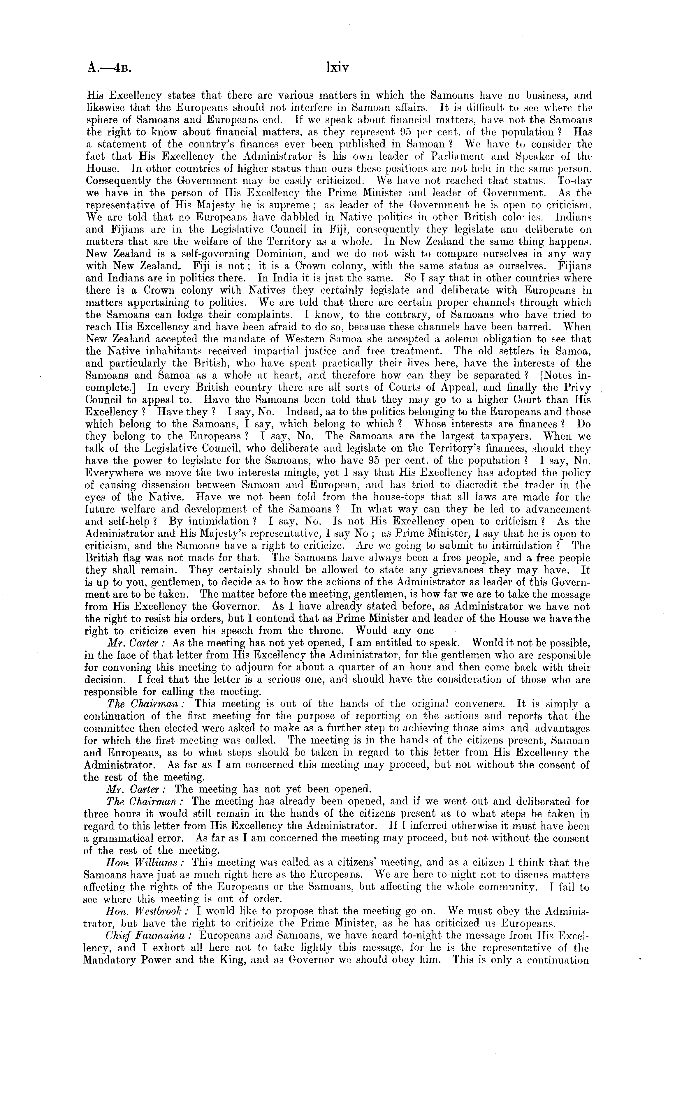 His Excellency states that there are various matters in which the Samoans have no business, and likewise that the Europeans should not interfere in Samoan affairs. It is difficult to see where the sphere of Samoans and Europeans end. If we speak about financial matters, have not the Samoans the right to know about financial matters, as they represent 95 per cent, of the population ? Has a statement of the country's finances ever been published in Samoan ? We have to consider the fact that His Excellency the Administrator is his own leader of Parliament and Speaker of the House. In other countries of higher status than ours these positions are not held in the same person. Consequently the Government may be easily criticized. We have not reached that status. To-day we have in the person of His Excellency the Prime Minister and leader of Government. As the representative of His Majesty he is supreme ; as leader of the Government he is open to criticism. We are told that no Europeans have dabbled in Native politics in other British colo' ies. Indians and Fijians are in the Legislative Council in Fiji, consequently they legislate anu deliberate on matters that are the welfare of the Territory as a whole. In New Zealand the same thing happens. New Zealand is a self-governing Dominion, and we do not wish to compare ourselves in any way with New Zealand. Fiji is not; it is a Crown colony, with the same status as ourselves. Fijians and Indians are in politics there. In India it is just the same. So I say that in other countries where there is a Crown colony with Natives they certainly legislate and deliberate with Europeans in matters appertaining to politics. We are told that there are certain proper channels through which the Samoans can lodge their complaints. I know, to the contrary, of Samoans who have tried to reach His Excellency and have been afraid to do so, because these channels have been barred. When New Zealand accepted the mandate of Western Samoa she accepted a solemn obligation to see that the Native inhabitants received impartial justice and free treatment. The old settlers in Samoa, and particularly the British, who have spent practically their lives here, have the interests of the Samoans and Samoa as a whole at heart, and therefore how can they be separated ? [Notes incomplete.] In every British country there are all sorts of Courts of Appeal, and finally the Privy Council to appeal to. Have the Samoans been told that they may go to a higher Court than His Excellency ? Have they ? I say, No. Indeed, as to the politics belonging to the Europeans and those which belong to the Samoans, I say, which belong to which ? Whose interests are finances ? Do they belong to the Europeans ? I say, No. The Samoans are the largest taxpayers. When we talk of the Legislative Council, who deliberate and legislate on the Territory's finances, should they have the power to legislate for the Samoans, who have 95 per cent, of the population ? I say, No. Everywhere we move the two interests mingle, yet I say that His Excellency has adopted the policy of causing dissension between Samoan and European, and has tried to discredit the trader in the eyes of the Native. Have we not been told from the house-tops that all laws are made for the future welfare and development of the Samoans ? In what way can they be led to advancement and self-help ? By intimidation ? I say, No. Is not His Excellency open to criticism ? As the Administrator and His Majesty's representative, I say No ; as Prime Minister, I say that he is open to criticism, and the Samoans have a right to criticize. Are we going to submit to intimidation ? The British flag was not made for that. The Samoans have always been a free people, and a free people they shall remain. They certainly should be allowed to state any grievances they may have. It is up to you, gentlemen, to decide as to how the actions of the Administrator as leader of this Government are to be taken. The matter before the meeting, gentlemen, is how far we are to take the message from His Excellency the Governor. As I have already stated before, as Administrator we have not the right to resist his orders, but I contend that as Prime Minister and leader of the House we have the right to criticize even his speech from the throne. Would any one Mr. Garter : As the meeting has not yet opened, lam entitled to speak. Would it not be possible, in the face of that letter from His Excellency the Administrator, for the gentlemen who are responsible for convening this meeting to adjourn for about a quarter of an hour and then come back with their decision. I feel that the letter is a serious one, and should have the consideration of those who are responsible for calling the meeting. The Chairman : This meeting is out of the hands of the original conveners. It is simply a continuation of the first meeting for the purpose of reporting on the actions and reports that the committee then elected were asked to make as a further step to achieving those aims and advantages for which the first meeting was called. The meeting is in the hands of the citizens present, Sarnoan and Europeans, as to what steps should be taken in regard to this letter from His Excellency the Administrator. As far as lam concerned this meeting may proceed, but not without the consent of the rest of the meeting. Mr. Carter: The meeting has not yet been opened. The Chairman : The meeting has already been opened, and if we went out and deliberated for three hours it would still remain in the hands of the citizens present as to what steps be taken in regard to this letter from His Excellency the Administrator. If I inferred otherwise it must have been a grammatical error. As far as lam concerned the meeting may proceed, but not without the consent of the rest of the meeting. Hot)'. Williams : This meeting was called as a citizens' meeting, and as a citizen I think that the Samoans have just as much right here as the European