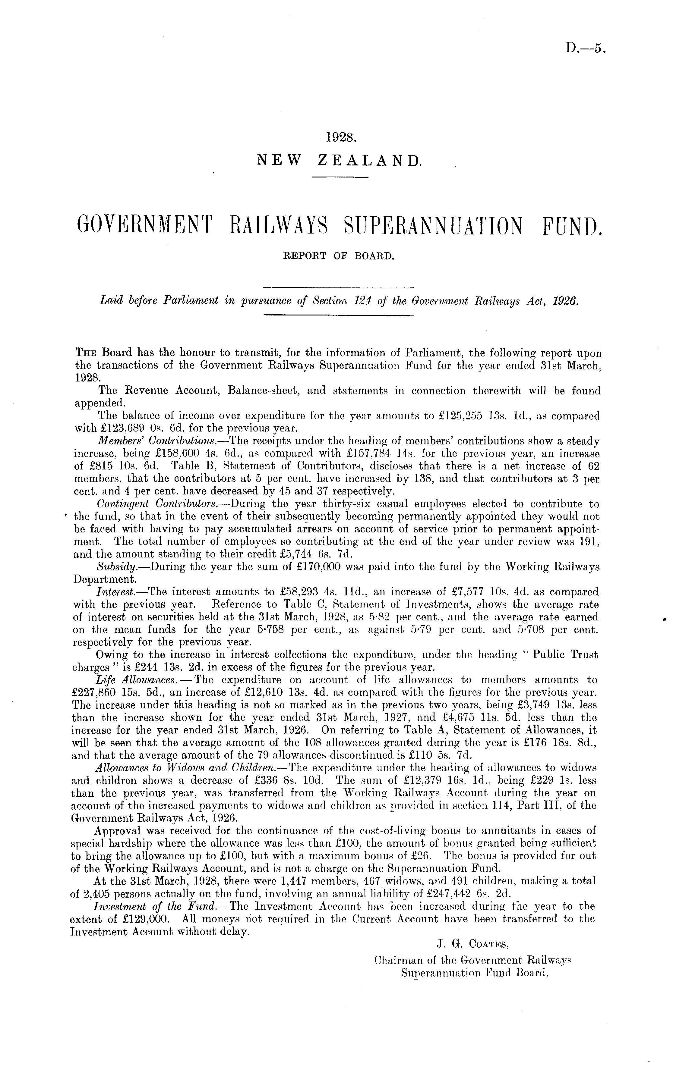 The Board has the honour to transmit, for the information of Parliament, the following report upon the transactions of the Government Railways Superannuation Fund for the year ended 31st March. 1928. The Revenue Account, Balance-sheet, and statements in connection therewith will bo found appended. The balance of income over expenditure for the year amounts to £125,255 13s. Id., as compared with £123,689 Os. 6d. for the previous year. Members' Contributions. —The receipts under the heading of members' contributions show a steady increase, being £158,600 4s. 6d., as compared with £157,784 lis, for the previous year, an increase of £81.5 10s. 6d. Table B, Statement of Contributors, discloses that there is a net increase of 62 members, that the contributors at 5 per cent, have increased by 138, and that contributors at 3 per cent, and 4 per cent, have decreased by 45 and 37 respectively. Contingent Contributors. —During the year thirty-six casual employees elected to contribute to the fund, so that in the event of their subsequently becoming permanently appointed they would not be faced with having to pay accumulated arrears on account of service prior to permanent appointment. The total number of employees so contributing at the end of the year under review was 191, and the amount standing to their credit £5,744 6s. 7d. Subsidy. —During the year the sum of £170,000 was paid into the fund by the Working Railways Department. Interest. —The interest amounts to £58,293 4s. lid., an increase of £7,577 10s. 4d. as compared with the previous year. Reference to Table C, Statement of Investments, shows the average rate of interest on securities held at the 31st March, 1928, as 5-82 per cent., and the average rate earned on the mean funds for the year 5-758 per cent., as against 5-79 per cent, and 5-708 per cent, respectively for the previous year. Owing to the increase in interest collections the expenditure, under the heading " Public Trust charges " is £244 13s. 2d. in excess of the figures for the previous year. Life Allowances. — The expenditure on account of life allowances to members amounts to £227,860 15s. 5d., an increase of £12,610 13s. 4d. as compared with the figures for the previous year. The increase under this heading is not so marked as in the previous two years, being £3,749 13s. less than the increa.se shown for the year ended 31st March, 1927, and £4,675 lis. sd. less than the increase for the year ended 31st March, 1926. On referring to Table A, Statement of Allowances, it will be seen that the average amount of the 108 allowances granted during the year is £176 18s. Bd., and that the average amount of the 79 allowances discontinued is £110 ss. 7d. Allowances to Widows and Children. —The expenditure under the heading of allowances to widows and children shows a decrease of £336 Bs. lOd. The sum of £12,379 16s. Id., being £229 Is. less than the previous year, was transferred from the Working Railways Account during the year on account of the increased payments to widows and children as provided in section 114, Part 111, of the Government Railways Act, 1926. Approval was received for the continuance of the cost-of-living bonus to annuitants in cases of special hardship where the allowance was less than £100, the amount of bonus granted being sufficient to bring the allowance up to £100, but with a maximum bonus of £26. The bonus is provided, for out of the Working Railways Account, and is not a charge on the Superannuation Fund. At the 31st March, 1928, there were 1,447 members, 467 widows, and 491 children, making a total of 2,405 persons actually on the fund, involving an annual liability of £247,442 6s. 2d. Investment of the Fund. —The Investment Account has been increased during the year to the extent of £129,000. All moneys not required in the Current Account have been transferred to the Investment Account without delay. J. G. Coates, Chairman of the Government Railways Superannuation Fund Board.