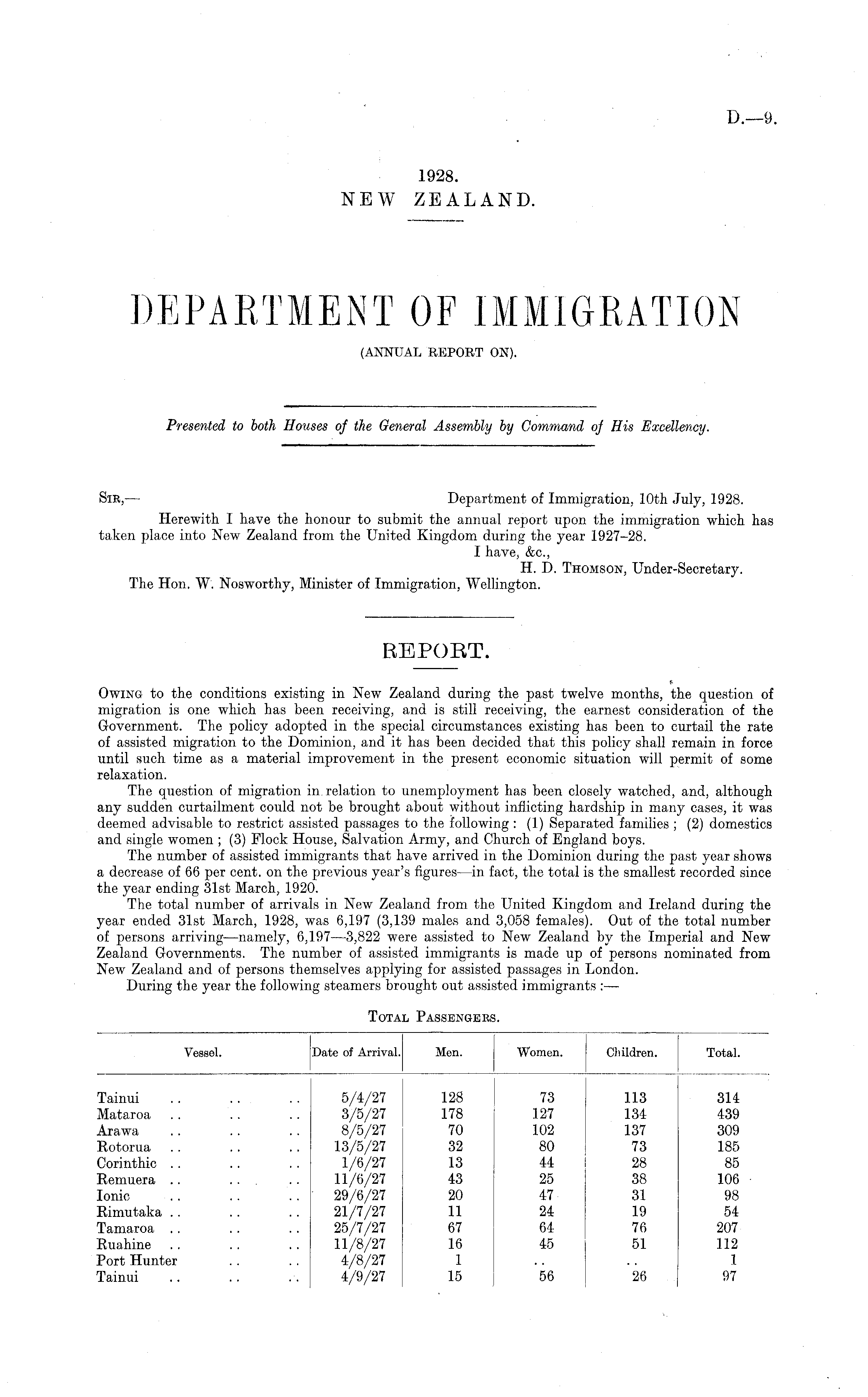 Sir, — Department of Immigration, 10th July, 1928. Herewith I have the honour to submit the annual report upon the immigration which has taken place into New Zealand from the United Kingdom during the year 1927-28. I have, &c, H. D. Thomson, Under-Secretary. The Hon. W. Nosworthy, Minister of Immigration, Wellington.