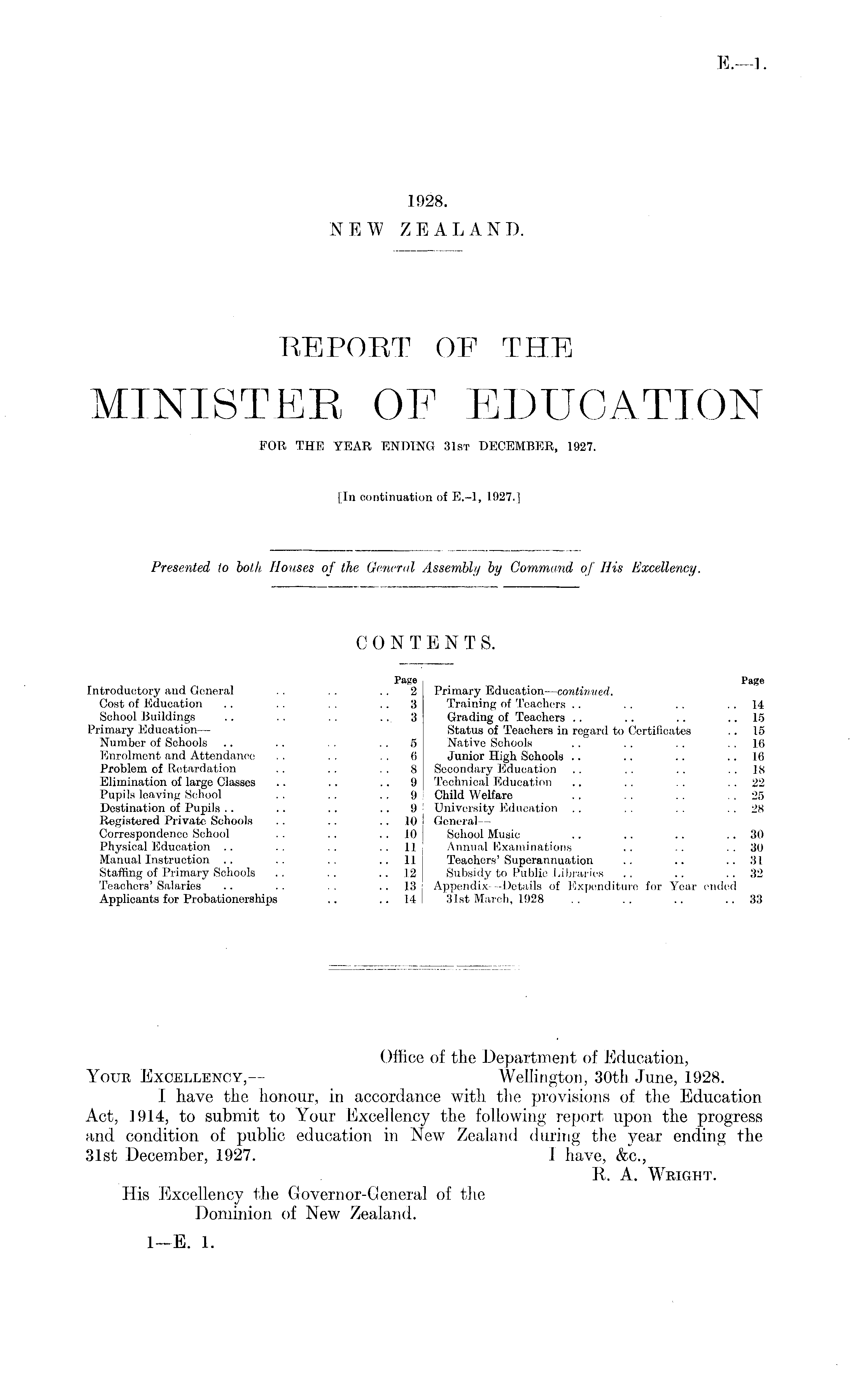 Office of the Department of Education, Your Excellency,— Wellington, 30th June, 1928. I have the honour, in accordance with the provisions of the Education Act, 1914, to submit to Your Excellency the following report upon the progress and condition of public education in New Zealand during the year ending the 31st December, 1927. I have, &c, R, A. Wright. His Excellency the Governor-Oencral of the Dominion of New Zealand.