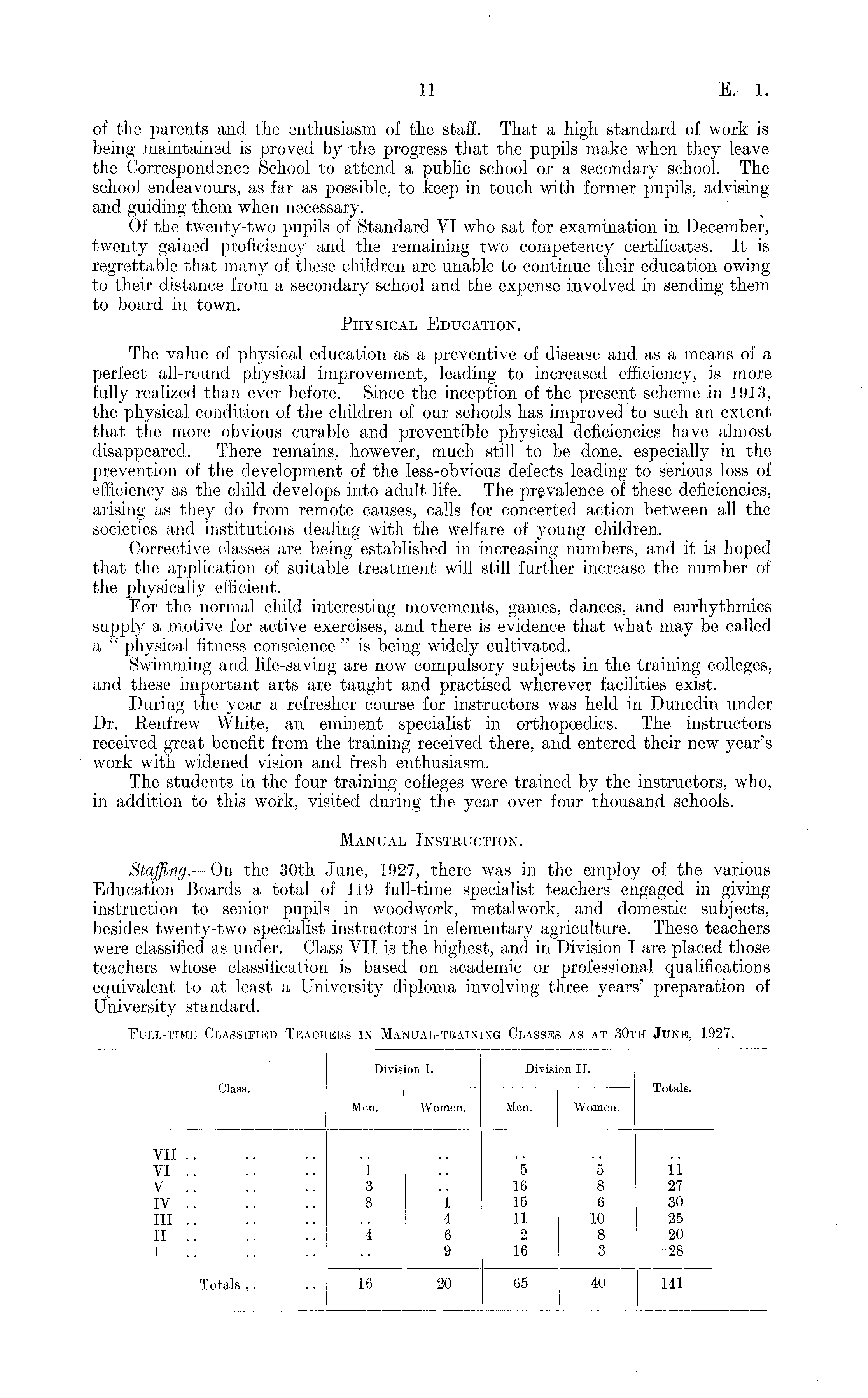 of the parents and the enthusiasm of the staff. That a high standard of work is being maintained is proved by the progress that the pupils make when they leave the Correspondence School to attend a public school or a secondary school. The school endeavours, as far as possible, to keep in touch with former pupils, advising and guiding them when necessary. Of the twenty-two pupils of Standard. VI who sat for examination in December, twenty gained proficiency and the remaining two competency certificates. It is regrettable that many of these children are unable to continue their education owing to their distance from a secondary school and the expense involved in sending them to board in town. Physical Education . The value of physical education, as a preventive of disease and as a means of a perfect all-round physical improvement, leading to increased efficiency, is more fully realized than ever before. Since the inception of the present scheme in 1913, the physical condition of the children of our schools has improved to such an extent that the more obvious curable and preventible physical deficiencies have almost disappeared.. There remains, however, much still to be done, especially in the prevention of the development of the less-obvious defects leading to serious loss of efficiency as the child develops into adult life. The prevalence of these deficiencies, arising as they do from remote causes, calls for concerted action between all the societies and institutions dealing with the welfare of young children. Corrective classes are being established in increasing numbers, and it is hoped that the application of suitable treatment will still further increase the number of the physically efficient. For the normal child interesting movements, games, dances, and eurhythmies supply a motive for active exercises, and there is evidence that what may be called a " physical fitness conscience " is being widely cultivated. Swimming and life-saving are now compulsory subjects in the training colleges, and these important arts are taught and practised wherever facilities exist. During the year a refresher course for instructors was held in Dunedin under Dr. Renfrew White, an eminent specialist in orthopcedics. The instructors received great benefit from the training received there, and entered their new year's work with widened vision and fresh enthusiasm. The students in. the four training colleges were trained by the instructors, who, in addition to this work, visited during the year over four thousand schools. Manual Instruction. Staffing. —On the 30th June, .1.927, there was in the employ of the various Education Boards a total of 119 full-time specialist teachers engaged in giving instruction to senior pupils in woodwork, metalwork, and domestic subjects, besides twenty-two specialist instructors in elementary agriculture. These teachers were classified as under. Class VII is the highest, and in Division I are placed those teachers whose classification is based on academic or professional qualifications equivalent to at least a University diploma involving three years' preparation of University standard.