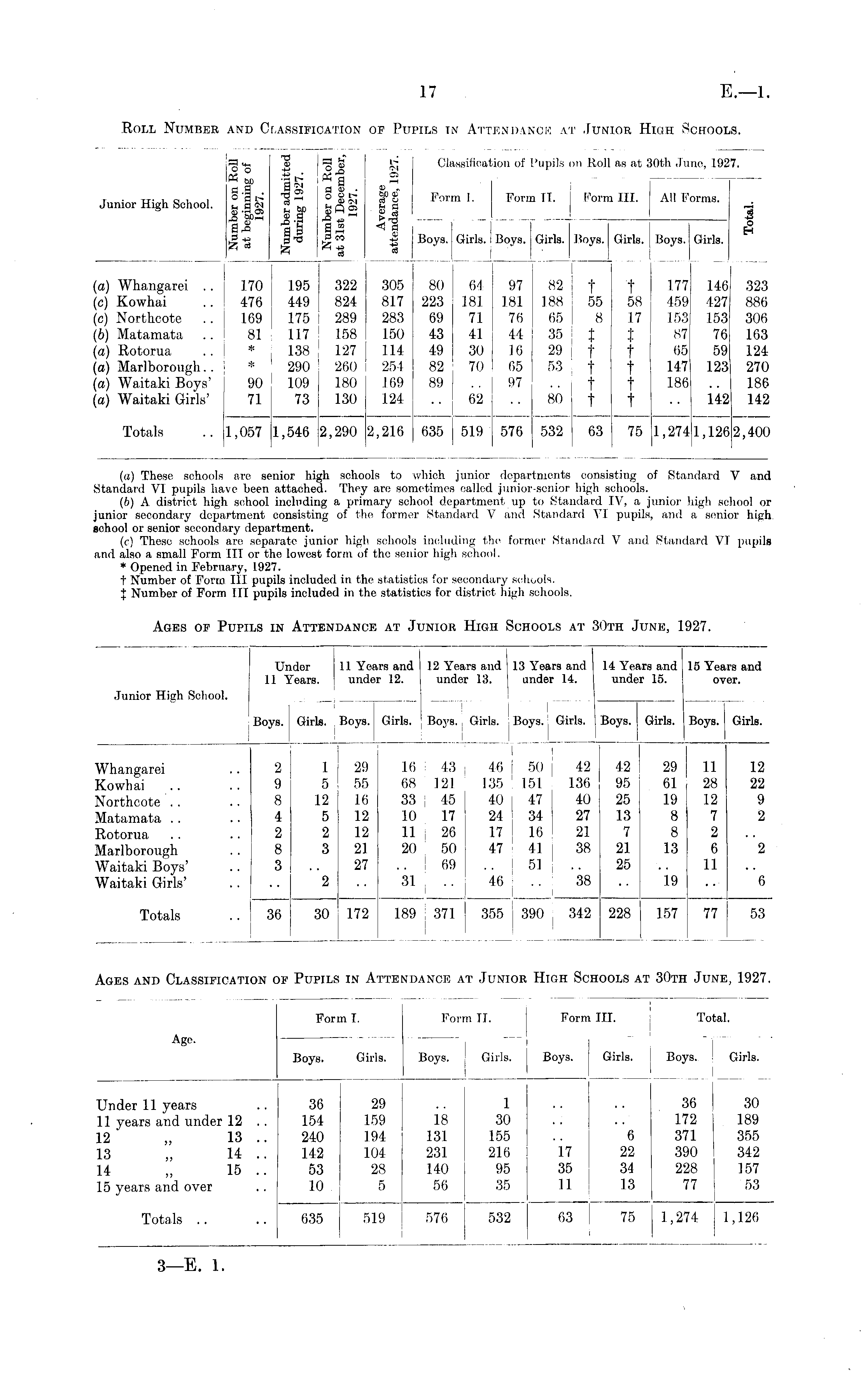 Ages and Classification of Pupils in Attendance at Junior High Schools at 30th June, 1927.