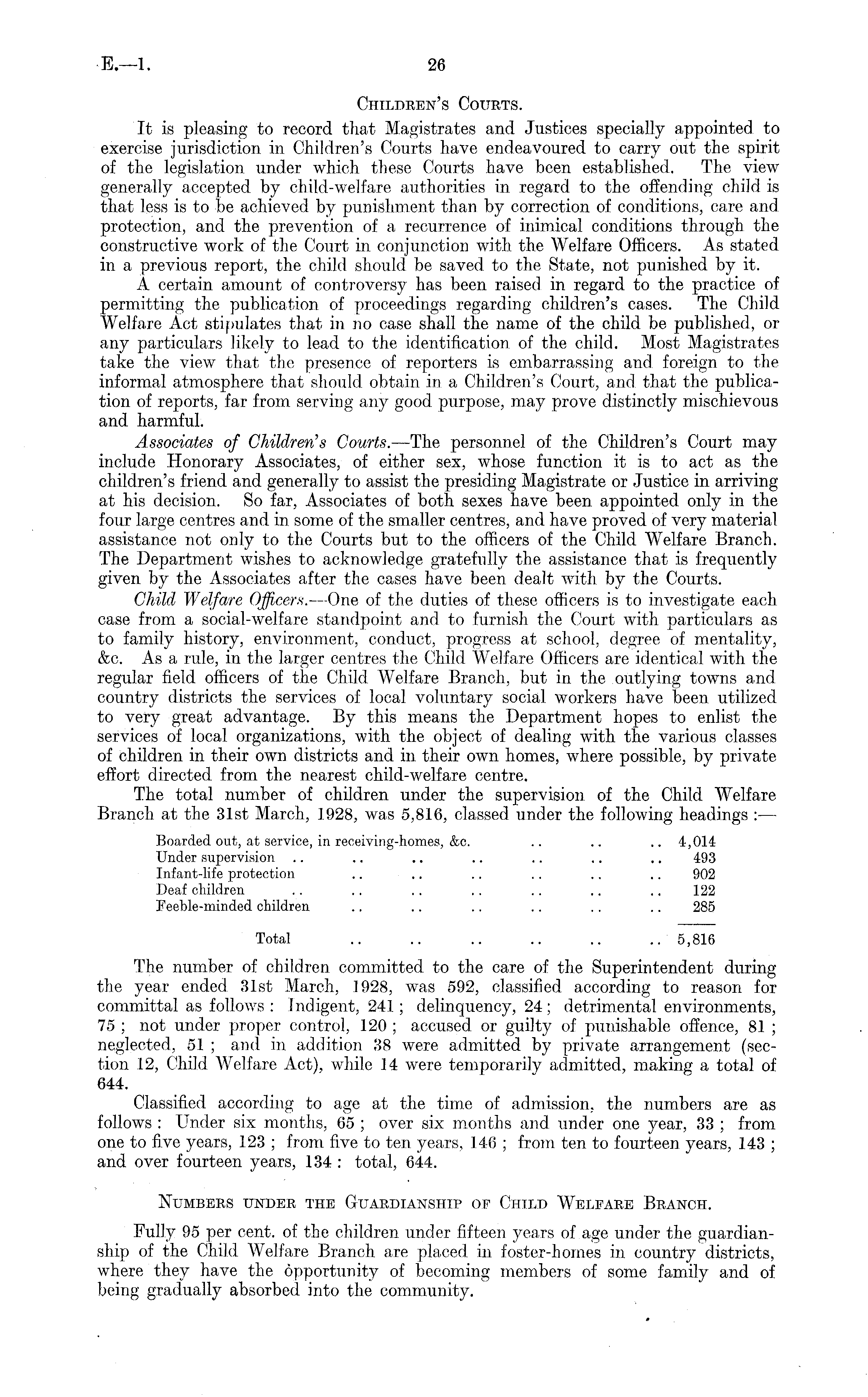Children's Courts. It is pleasing to record that Magistrates and Justices specially appointed to exercise jurisdiction in Children's Courts have endeavoured to carry out the spirit of the legislation under which these Courts have been established. The view generally accepted by child-welfare authorities in regard to the offending child is that less is to be achieved by punishment than by correction of conditions, care and protection, and the prevention of a recurrence of inimical conditions through the constructive work of the Court in. conjunction with the Welfare Officers. As stated in a previous report, the child should be saved to the State, not punished by it. A certain amount of controversy has been raised in regard to the practice of permitting the publication of proceedings regarding children's cases. The Child Welfare Act stipulates that in no case shall the name of the child be published, or any particulars likely to lead to the identification of the child. Most Magistrates take the view that the presence of reporters is embarrassing and foreign to the informal atmosphere that should obtain in a Children's Court, and that the publication of reports, far from serving any good purpose, may prove distinctly mischievous and harmful. Associates of Children's Courts. —The personnel of the Children's Court may include Honorary Associates, of either sex, whose function it is to act as the children's friend and generally to assist the presiding Magistrate or Justice in arriving at his decision. So far, Associates of both sexes have been appointed only in the four large centres and in some of the smaller centres, and have proved of very material assistance not only to the Courts but to the officers of the Child Welfare Branch. The Department wishes to acknowledge gratefully the assistance that is frequently given by the Associates after the cases have been dealt with by the Courts. Child Welfare Officers. —One of the duties of these officers is to investigate each case from a social-welfare standpoint and to furnish the Court with particulars as to family history, environment, conduct, progress at school, degree of mentality, &c. As a rule, in the larger centres the Child Welfare Officers are identical with the regular field officers of the Child Welfare Branch, but in the outlying towns and country districts the services of local voluntary social workers have been utilized to very great advantage. By this means the Department hopes to enlist the services of local organizations, with the object of dealing with the various classes of children in their own districts and in their own homes, where possible, by private effort directed from the nearest child-welfare centre. The total number of children under the supervision of the Child Welfare Branch at the 31st March, 1928, was 5,816, classed under the following headings : — Boarded out, at service, in receiving-homes, &c. .. .. .. 4,014 Under supervision .. .. .. .. .. .. .. 493 Infant-life protection .. .. .. .. .. .. 902 Deaf children .. .. .. . . .. .. .. 122 Feeble-minded children .. .. .. .. .. .. 285 Total .. .. .. .. .. .. 5,816 The number of children committed to the care of the Superintendent during the year ended 31st March, .1928, was 592, classified according to reason for committal as follows: Indigent, 241; delinquency, 24; detrimental environments, 75 ; not under proper control, 120 ; accused or guilty of punishable offence, 81 ; neglected, 51 ; and in addition 38 were admitted by private arrangement (section 12, Child Welfare Act), while 14 were temporarily admitted, making a total of 644. Classified according to age at the time of admission, the numbers are as follows : Under six months, 65 ; over six months and under one year, 33 ; from one to five years, 123 ; from five to ten years, 146 ; from ten to fourteen years, 143 ; and over fourteen years, 134 : total, 644. Numbers under the Guardianship of Child Welfare Branch. Fully 95 per cent, of the children under fifteen years of age under the guardianship of the Child Welfare Branch are placed in foster-homes in country districts, where they have the opportunity of becoming members of some family and of being gradually absorbed into the community.