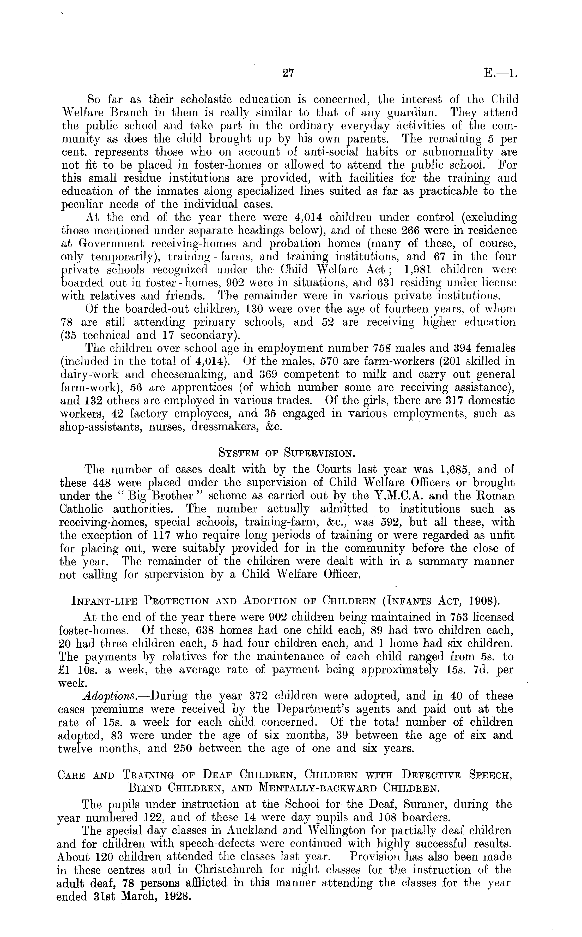 So far as their scholastic education is concerned, the interest of the Child Welfare Branch in them is really similar to that of any guardian. They attend the public school and take part in the ordinary everyday activities of the community as does the child brought up by his own parents. The remaining 5 per cent, represents those who on account of anti-social habits or subnormality are not fit to be placed in foster-homes or allowed to attend the public school. For this small residue institutions are provided, with facilities for the training and education of the inmates along specialized lines suited as far as practicable to the peculiar needs of the individual cases. At the end of the year there were 4,014 children, under control (excluding those mentioned under separate headings below), and of these 266 were in residence at Government receiving-homes and probation homes (many of these, of course, only temporarily), training - farms, and training institutions, and 67 in the four private schools recognized under the Child Welfare Act; 1,981 children were boarded out in foster - homes, 902 were in situations, and 631 residing under license with relatives and friends. The remainder were in various private institutions. Of the boarded-out children, 130 were over the age of fourteen years, of whom 78 are still attending primary schools, and 52 are receiving higher education (35 technical and 17 secondary). The children over school age in employment number 758 males and 394 females (included in the total of 4,014). Of the males, 570 are farm-workers (201 skilled in dairy-work and cheesemaking, and 369 competent to milk and carry out general farm-work), 56 are apprentices (of which number some are receiving assistance), and 132 others are employed in various trades. Of the girls, there are 317 domestic workers, 42 factory employees, and 35 engaged in various employments, such as shop-assistants, nurses, dressmakers, &c. System oe Supervision. The number of cases dealt with by the Courts last year was 1,685, and of these 448 were placed under the supervision of Child Welfare Officers or brought under the " Big Brother " scheme as carried out by the V.M.C.A. and the Roman Catholic authorities. The number actually admitted to institutions such as receiving-homes, special schools, training-farm, &c, was 592, but all these, with the exception of 117 who require long periods of training or were regarded as unfit for placing out, were suitably provided for in the community before the close of the year. The remainder of the children were dealt with in a summary manner not calling for supervision by a Child Welfare Officer. Infant-life Protection and Adoption of Children (Infants Act, 1908). At the end of the year there were 902 children being maintained in 753 licensed foster-homes. Of these, 638 homes had one child each, 89 had two children each, 20 had three children each, 5 had four children each, and 1 home had six children. The payments by relatives for the maintenance of each child ranged from ss. to £l 10s. a week, the average rate of payment being approximately 15s. 7d. per week. Adoptions. —During the year 372 children were adopted, and in 40 of these cases premiums were received by the Department's agents and paid out at the rate of 15s. a week for each child concerned. Of the total number of children adopted, 83 were under the age of six months, 39 between the age of six and twelve months, and 250 between the age of one and six years. Care and Training of Deaf Children, Children with Defective Speech, Blind Children, and Mentally-backward Children. The pupils under instruction at the School for the Deaf, Sumner, during the year numbered 122, and of these 14 were day pupils and 108 boarders. The special day classes in Auckland and Wellington for partially deaf children and for children with speech-defects were continued with highly successful results. About 120 children attended the classes last year. Provision has also been made in these centres and in Christchurch for night classes for the instruction of the adult deaf, 78 persons afflicted in this manner attending the classes for the year ended 31st March, 1928.