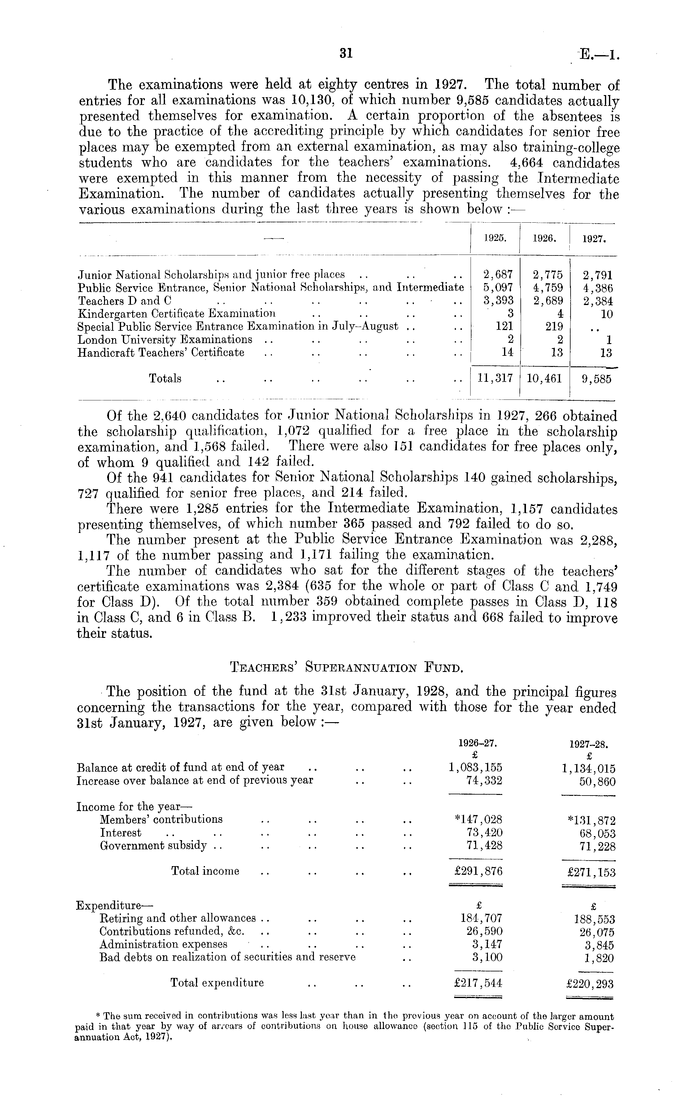 Of the 2,640 candidates for Junior National Scholarships in 1927, 266 obtained the scholarship qualification, 1,072 qualified for a free place in the scholarship examination, and 1,568 failed. There were also 151 candidates for free places only, of whom 9 qualified and 142 failed. Of the 941 candidates for Senior National Scholarships 140 gained scholarships, 727 qualified for senior free places, and 214 failed. There were 1,285 entries for the Intermediate Examination, .1,157 candidates presenting themselves, of which number 365 passed and 792 failed to do so. The number present at the Public Service Entrance Examination, was 2,288, 1,117 of the number passing and 1,171 failing the examination. The number of candidates who sat for the different stages of the teachers' certificate examinations was 2,384 (635 for the whole or part of Class C and. 1,749 for Class D). Of the total number 359 obtained complete passes in Class D, 118 in Class C, and 6in Class B. 1,233 improved their status and 668 failed to improve their status. Teachers' Superannuation Fund. The position of the fund at the 31st January, 1928, and the principal figures concerning the transactions for the year, compared with those for the year ended 31st January, 1927, are given below : — 1926-27. 1927-28. £ £ Balance at credit of fund at end of year .. .. .. 1,083,155 1,134,015 Increase over balance at end of previous year .. .. 74,332 50,860 Income for the year — Members'contributions .. .. .. .. *147,028 *131,872 Interest .. .. .. .. .. .. 73,420 68,053 Government subsidy .. .. .. .. .. 71,428 71,228 Total income .. .. .. .. £291,876 £271,153 Expenditure — £ £ Retiring and other allowances .. .. .. .. 184,707 188,553 Contributions refunded, &c. .. .. .. .. 26,590 26,075 Administration expenses .. .. .. .. 3,1.47 3,845 Bad debts on realization of securities and reserve .. 3,100 1,820 Total expenditure .. .. .. £217,544 £220,293 * The aum received in contribution was less last year than in the provious year on account ol the larger amount paid in that year by way of arrears of contributions on house allowanco (section 115 of tho Public Service Superannuation Act, 1927).
