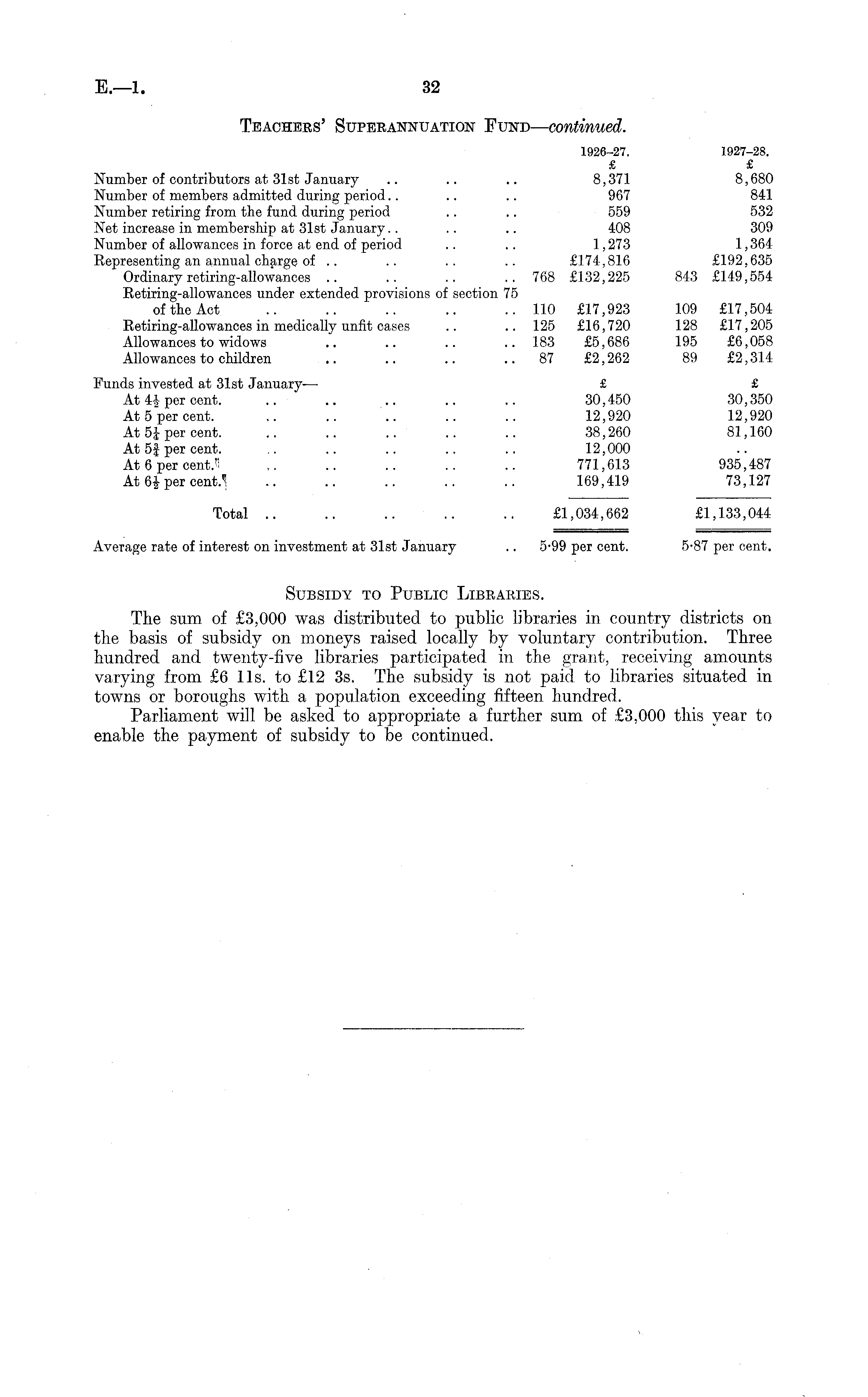 Teachers' Superannuation Fund— continued. 1926-27. 1927-28. £ £ Number of contributors at 31st January .. .. .. 8,371 8,680 Number of members admitted during period.. .. .. 967 841 Number retiring from the fund, during period .. .. 559 532 Net increase in membership at 31st January.. .. .. 408 309 Number of allowances in force at end of period .. .. 1,273 1,364 Representing an annual charge of .. .. .. .. £174,816 £192,635 Ordinary retiring-allowances .. .. .. ..768 £132,225 843 £149,554 Retiring-allowances under extended provisions of section 75 of the Act .. .. .. .. .. 110 £17,923 109 £17,504 Retiring-allowances in medically unfit cases .. .. 125 £16,720 128 £17,205 Allowances to widows .. .. .. ..183 £5,686 195 £6,058 Allowances to children .. .. .. ..87 £2,262 89 £2,314 Funds invested at 31st January — £ £ At 41per cent. .. .. .. .. .. 30,450 30,350 At 5 per cent. .. .. .. .. .. 12,920 12,920 At 5i per cent. .. .. .. .. .. 38,260 81,160 At 5J per cent. .. .. .. .. .. 12,000 At 6 per cent." ~ .. .. .. .. 771,613 935,487 At 6£per cent."! .. .. .. .. .. 169,419 73,127 Total .. .. .. .. .. £1,034,662 £1,133,044 Average rate of interest on investment at 31st January .. 5-99 per cent. 5-87 per cent. Subsidy to Public Libraries. The sum of £3,000 was distributed to public libraries in country districts on the basis of subsidy on moneys raised locally by voluntary contribution. Three hundred and twenty-five libraries participated in the grant, receiving amounts varying from £6 lis. to £.12 3s. The subsidy is not paid to libraries situated in towns or boroughs with a population exceeding fifteen hundred. Parliament will be asked to appropriate a further sum of £3,000 this year to enable the payment of subsidy to be continued.