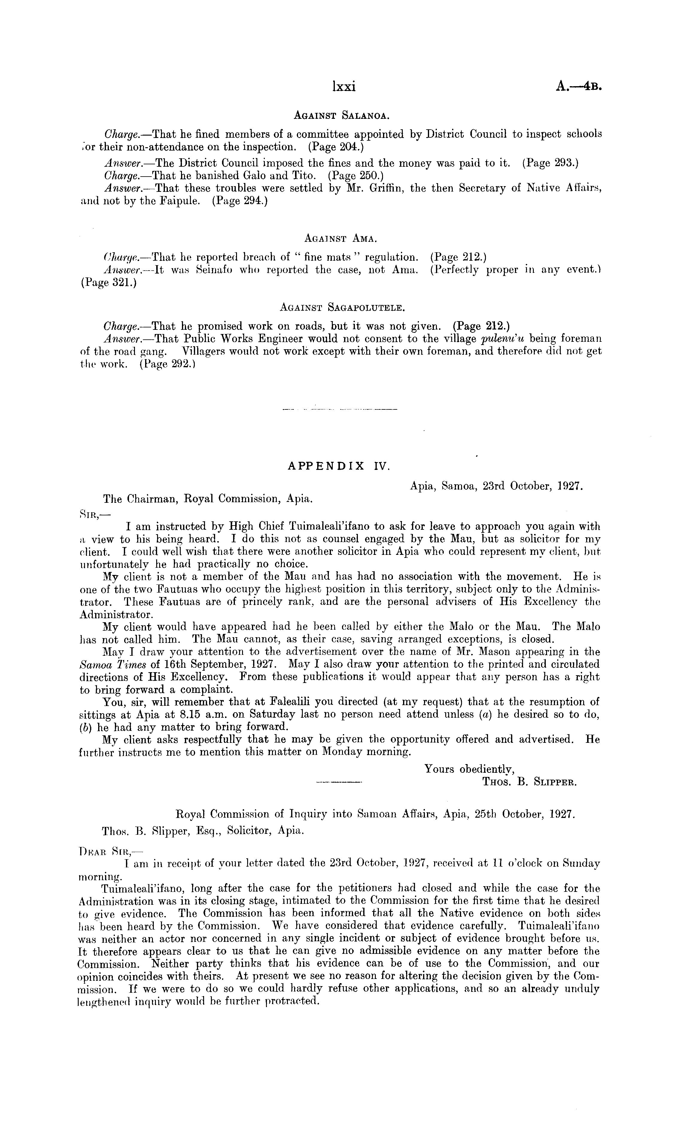 APPENDIX IV. Apia, Samoa, 23rd October, 1927. The Chairman, Royal Commission, Apia. Sir, — I am instructed by High Chief Tuimaleali'ifano to ask for leave to approach you again with a view to his being heard. I do this not as counsel engaged by the Mau, but as solicitor for my client. I could well wish that there were another solicitor in Apia who could represent my client, but unfortunately he had practically no choice. My client is not a member of the Mau and has had no association with the movement. He is one of the two Fautuas who occupy the highest position in this territory, subject only to the Administrator. These Fautuas are of princely rank, and are the personal advisers of His Excellency the Administrator. My client woitld have appeared had he been called by either the Malo or the Mau. The Malo has not called him. The Mau cannot, as their case, saving arranged exceptions, is closed. May I draw your attention to the advertisement over the name of Mr. Mason appearing in the Samoa Times of 16th September, 1927. May I also draw your attention to the printed and circulated directions of His Excellency. From these publications it would appear that any person has a right to bring forward a complaint. You, sir, will remember that at Falealili you directed (at my request) that at the resumption of sittings at Apia at 8.15 a.m. on Saturday last no person need attend unless (a) he desired so to do, (b) he had any matter to bring forward. My client asks respectfully that he may be given the opportunity offered and advertised. He further instructs me to mention this matter on Monday morning. Yours obediently, Thos. B. Slipper. Royal Commission of Inquiry into Samoan Affairs, Apia, 25th October, 1927. Thos. B. Slipper, Esq., Solicitor, Apia. Dear Sir, — I am in receipt of your letter dated the 23rd October, 1927, received at 11 o'clock on Sunday morning. Tuimaleali'ifano, long after the case for the petitioners had closed and while the case for the Administration was in its closing stage, intimated to the Commission for the first time that he desired to give evidence. The Commission has been informed that all the Native evidence on both sides has been heard by the Commission. We have considered that evidence carefully. Tuimaleali'ifano was neither an actor nor concerned in any single incident or subject of evidence brought before us. It therefore appears clear to us that he can give no admissible evidence on any matter before the Commission. Neither party thinks that his evidence can be of use to the Commission, and our opinion coincides with theirs. At present we see no reason for altering the decision given by the Commission. If we were to do so we could hardly refuse other applications, and so an already unduly lengthened inquiry would be further protracted.