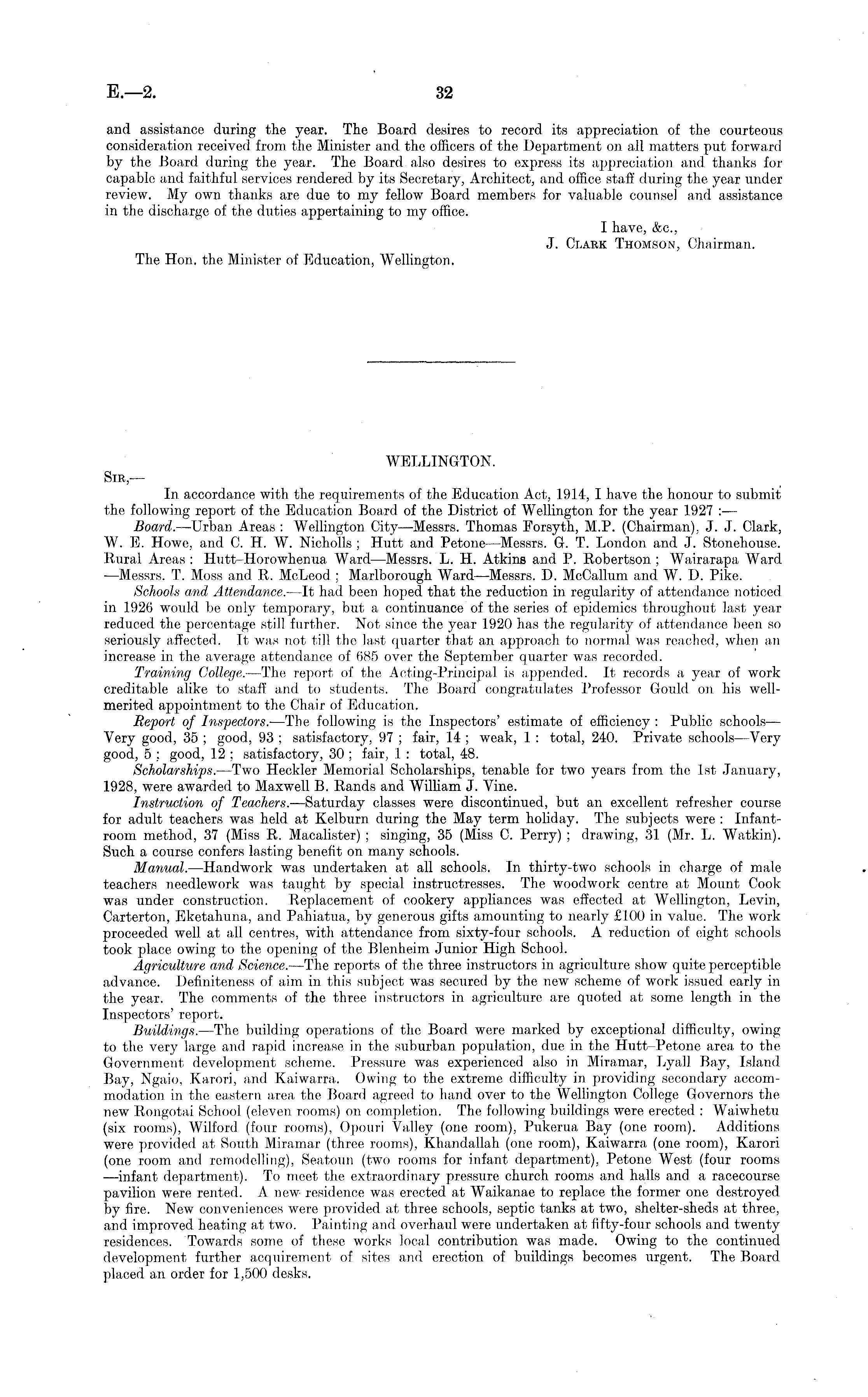 WELLINGTON. Sir, — In accordance with the requirements of the Education Act, 1914, I have the honour to submit the following report of the Education Board of the District of Wellington for the year 1927 : — Board. —Urban Areas : Wellington City —Messrs. Thomas Forsyth, M.P. (Chairman), J. J. Clark, W. E. Howe, and C. H. W. Nicholls ; Hutt and Petone —Messrs. G. T. London and J. Stonehouse. Rural Areas : Hutt-Horowhenua Ward —Messrs. L. H. Atkins and P. Robertson ; Wairarapa Ward —Messrs. T. Moss and R. McLeod ; Marlborough Ward—Messrs. D. McCallum and W. D. Pike. Schools and Attendance. —It had been hoped that the reduction in regularity of attendance noticed in 1926 would be only temporary, but a continuance of the series of epidemics throughout last year reduced the percentage still further. Not since the year 1920 has the regularity of attendance been so seriously affected. It was not till the last quarter that an approach to normal was reached, when, an increase in the average attendance of 685 over the September quarter was recorded. Training College. —The report of the Acting-Principal is appended. It records a year of work creditable alike to staff and to students. The Board congratulates Professor Gould on his wellmerited appointment to the Chair of Education. Report of Inspectors. —The following is the Inspectors' estimate of efficiency : Public schools — Very good, 35 ; good, 93 ; satisfactory, 97 ; fair, 14 ; weak, 1 : total, 240. Private schools —Very good, 5 ; good, 12 ; satisfactory, 30 ; fair, 1 : total, 48. Scholarships. —Two Heckler Memorial Scholarships, tenable for two years from the fst January, 1928, were awarded to Maxwell B. Rands and William J. Vine. Instruction of Teachers. —Saturday classes were discontinued, but an excellent refresher course for adult teachers was held at Kelburn during the May term holiday. The subjects were : Infantroom method, 37 (Miss R. Macalister) ; singing, 35 (Miss C. Perry) ; drawing, 31 (Mr. L. Watkin). Such a course confers lasting benefit on many schools. Manual. —Handwork was undertaken at all schools. In thirty-two schools in charge of male teachers needlework was taught by special instructresses. The woodwork centre at Mount Cook was under construction. Replacement of cookery appliances was effected at Wellington, Levin, Carterton, Eketahuna, and Pahiatua, by generous gifts amounting to nearly £100 in value. The work proceeded well at all centres, with attendance from sixty-four schools. A reduction of eight schools took place owing to the opening of the Blenheim Junior High School. Agriculture and Science. —The reports of the three instructors in agriculture show quite perceptible advance. Definiteness of aim in this subject was secured by the new scheme of work issued early in the year. The comments of the three instructors in agriculture are quoted at some length in the Inspectors' report. Buildings. —The building operations of the Board were marked by exceptional difficulty, owing to the very large and rapid increase in the suburban population, due in the Hutt-Petone area to the Government development scheme. Pressure was experienced also in Miramar, Lyall Bay, Island Bay, Ngaio, Karori, and Kaiwarra. Owing to the extreme difficulty in providing secondary accommodation in the eastern area the Board agreed to hand over to the Wellington College Governors the new Rongotai School (eleven rooms) on completion. The following buildings were erected : Waiwhetti (six rooms), Wilford (four rooms), Opouri Valley (one room), Pukerua Bay (one room). Additions were provided at South Miramar (three rooms), Khandallah (one room), Kaiwarra (one room), Karori (one room and remodelling), Seatoun (two rooms for infant department), Petone West (four rooms —infant department). To meet the extraordinary pressure church rooms and halls and a racecourse pavilion were rented. A new residence was erected at Waikanae to replace the former one destroyed by fire. New conveniences were provided at three schools, septic tanks at two, shelter-sheds at three, and improved heating at two. Painting and overhaul were undertaken at fifty-four schools and twenty residences. Towards some of these works local contribution was made. Owing to the continued development further acquirement of sites and erection of buildings becomes urgent. The Board placed an order for 1,500 desks.
