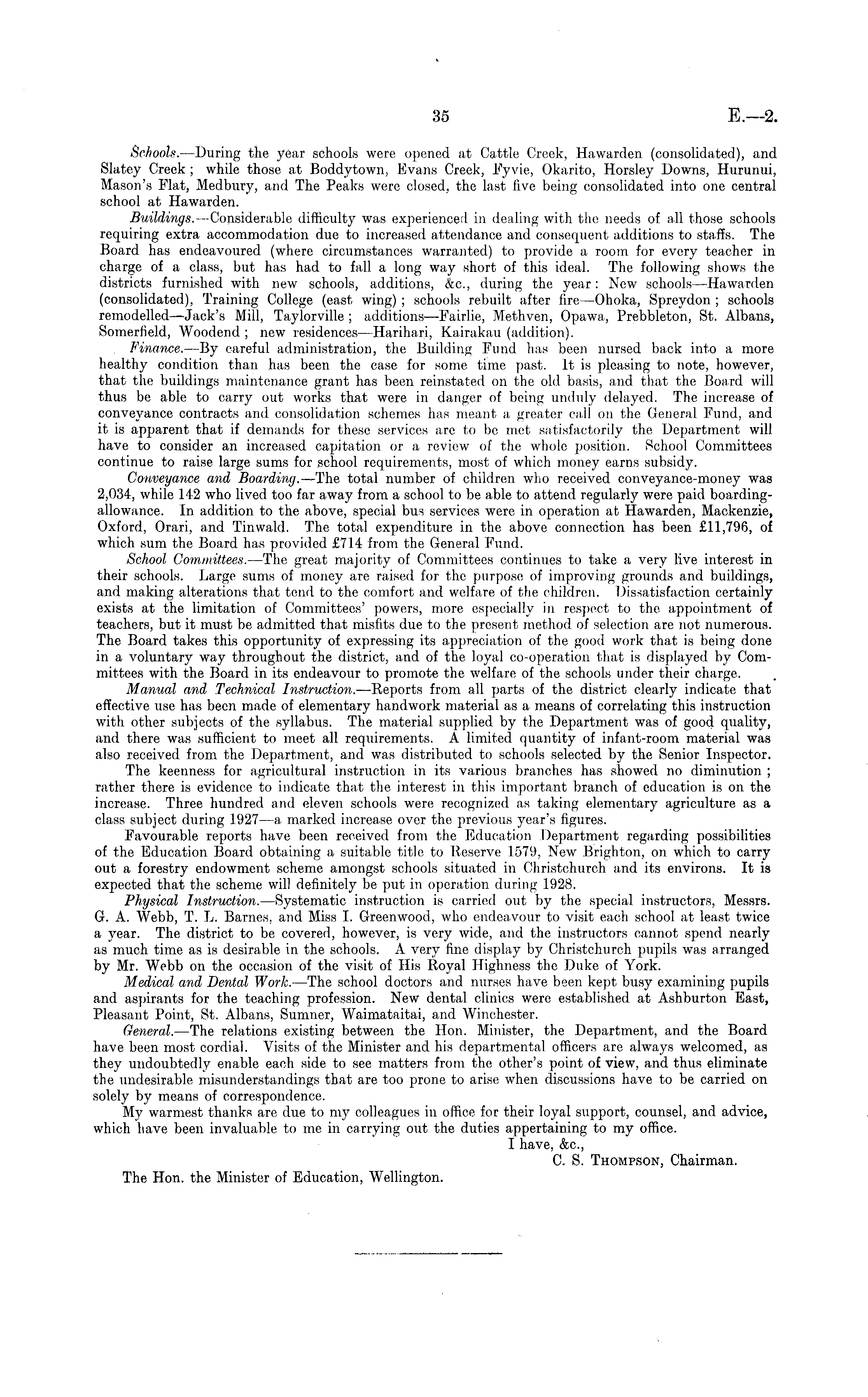 Schools. —During the year schools were opened at Cattle Creek, Hawarden (consolidated), and Slatey Creek ; while those at Boddytown, Evans Creek, Fyvie, Okarito, Horsley Downs, Hurunui, Mason's Flat, Medbury, and The Peaks were closed, the last five being consolidated into one central school at Hawarden. Buildings.--- Considerable difficulty was experienced in dealing with the needs of all those schools requiring extra accommodation due to increased attendance and consequent additions to staffs. The Board has endeavoured (where circumstances warranted) to provide a room for every teacher in charge of a class, but has had to fall a long way short of this ideal. The following shows the districts furnished with new schools, additions, &c, during the year: New schools —Hawarden (consolidated), Training College (east wing) ; schools rebuilt after fire —Ohoka, Spreydon ; schools remodelled—Jack's Mill, Taylorville ; additions —Fairlie, Methven, Opawa, Prebbleton, St. Albans, Somerlield, Wooderrd ; new residences —Harihari, Kairakau (addition). Finance. —By careful administration, the Building Fund has been nursed back into a more healthy condition than has been the case for some time past. It is pleasing to note, however, that the buildings maintenance grant has been reinstated on the old basis, and that the Board will thus be able to carry out works that were in danger of being unduly delayed. The increase of conveyance contracts and consolidation schemes has meant a greater call on the General Fund, and it is apparent that if demands for these services are to be met satisfactorily the Department will have to consider an increased capitation or a review of the whole position. School Committees continue to raise large sums for school requirements, most of which money earns subsidy. Conveyance and Boarding .—-The total number of children who received conveyance-money was 2,034, while 142 who lived too far away from a school to be able to attend regularly were paid boardingallowance. In addition to the above, special bus services were in operation at Hawarden, Mackenzie, Oxford, Orari, and Tinwald. The total expenditure in the above connection has been £11,796, of which sum the Board has provided £714 from the General Fund. School Committees. —The great majority of Committees continues to take a very live interest in their schools. Large sums of money are raised for the purpose of improving grounds and buildings, and making alterations that tend to the comfort and welfare of the children. Dissatisfaction certainly exists at the limitation of Committees' powers, more especially in respect to the appointment of teachers, but it must be admitted that misfits due to the present method of selection are not numerous. The Board takes this opportunity of expressing its appreciation of the good work that is being done in a voluntary way throughout the district, and of the loyal co-operation that is displayed by Committees with the Board in its endeavour to promote the welfare of the schools under their charge. Manual and Technical Instruction. —Reports from all parts of the district clearly indicate that effective use has been made of elementary handwork material as a means of correlating this instruction with other subjects of the syllabus. The material supplied by the Department was of good quality, and there was sufficient to meet all requirements. A limited quantity of infant-room material was also received from the Department, and was distributed to schools selected by the Senior Inspector. The keenness for agricultural instruction in its various branches has showed no diminution ; rather there is evidence to indicate that the interest in this important branch of education is on the increase. Three hundred and eleven schools were recognized as taking elementary agriculture as a class subject during 1927 —a marked increase over the previous year's figures. Favourable reports have been received from the Education Department regarding possibilities of the Education Board obtaining a suitable title to Reserve 1579, New Brighton, on which to carry out a forestry endowment scheme amongst schools situated in Christchurch and its environs. It is expected that the scheme will definitely be put in operation during 1928. Physical Instruction. —Systematic instruction is carried out by the special instructors, Messrs. G. A. Webb, T. L. Barnes, and Miss I. Greenwood, who endeavour to visit each school at least twice a year. The district to be covered, however, is very wide, and the instructors cannot spend nearly as much time as is desirable in the schools. A very fine display by Christchurch pupils was arranged by Mr. Webb on the occasion of the visit of His Royal Highness the Duke of York. Medical and Dental Work. —The school doctors and nurses have been kept busy examining pupils and aspirants for the teaching profession. New dental clinics were established at Ashburton East, Pleasant Point, St. Albans, Sumner, Waimataitai, and Winchester. General. —The relations existing between the Hon. Minister, the Department, and the Board have been most cordial. Visits of the Minister and his departmental officers are always welcomed, as they undoubtedly enable each side to see matters from the other's point of view, and thus eliminate the undesirable misunderstandings that are too prone to arise when discussions have to be carried on solely by means of correspondence. My warmest thanks are due to my colleagues in office for their loyal support, counsel, and advice, which have been invaluable to me in carrying out the duties appertaining to my office. I have, &c, C. S. Thompson, Chairman. The Hon. the Minister of Education, Wellington.