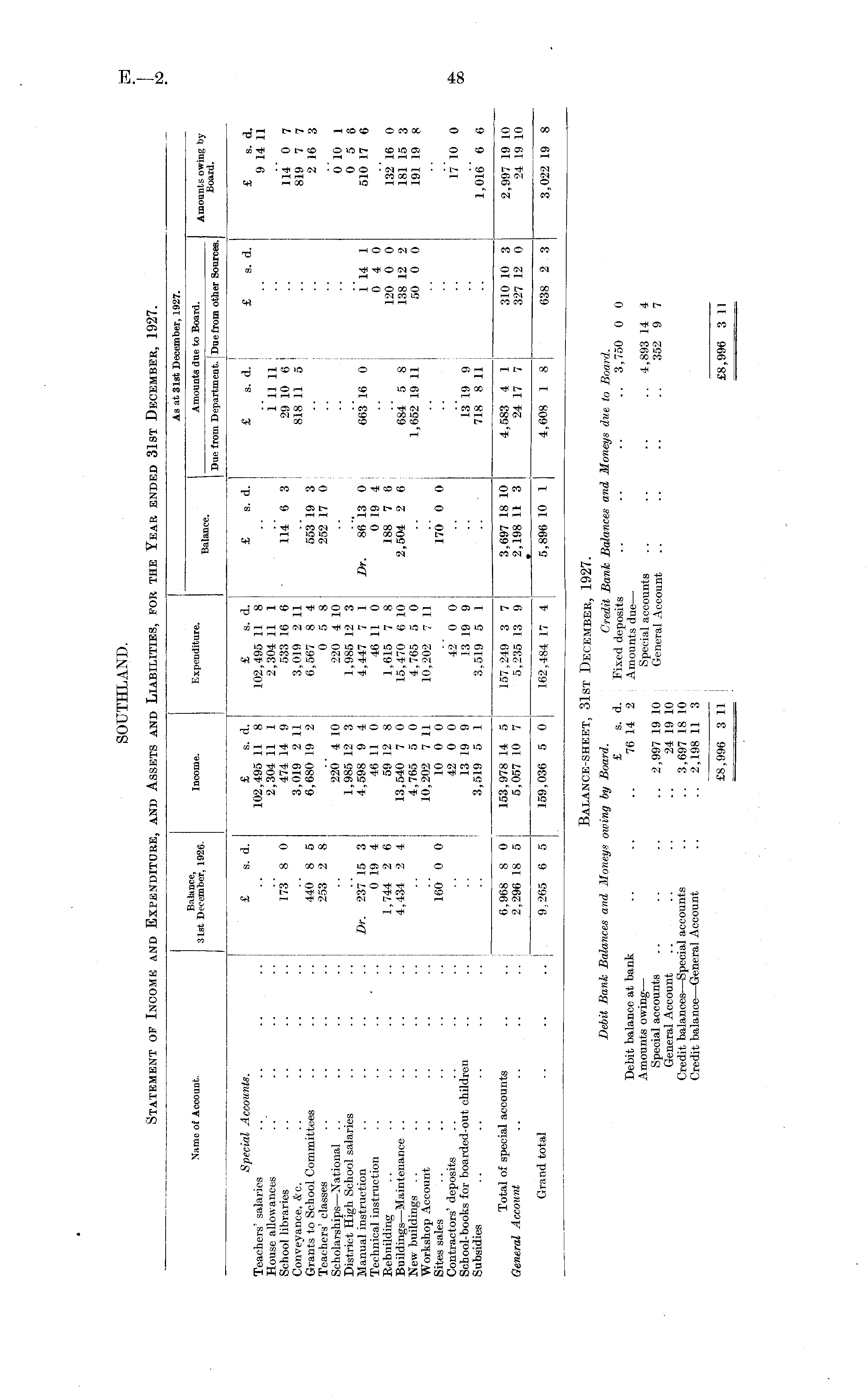 Name of Account. Balance, 31st December, 1926. Income. Expenditure. Balance. Amounts due to Board. ( Due from Department. I Due from other Sources. As at 31st December, 1927. Amounts due to Board. Board. Special Accounts. Teachers' salaries House allowances School libraries Conveyance, &e. Grants to School Committees Teachers' classes Scholarships —National District High School salaries Manual instruction Technical instruction Rebuilding Buildings —Maintenance New buildings Workshop Account Sites sales Contractors' deposits School-books for boarded-out children Subsidies Dr. £ s. d. 173 8 0 440 8 5 253 2 8 . 237 15 3 0 19 4 1,744 2 6 4,434 2 4 160 0 0 £ s. d. 102,495 11 8 2,304 11 1 474 14 9 3,019 2 11 6,680 19 2 220 4 10 1,985 12 3 4,598 9 4 46 11 0 59 12 8 13,540 7 0 4,765 5 0 ! 10,202 7 11 10 0 0 42 0 0 13 19 9 3,519 5 1 £ s. d. 102,495 11 8 2,304 11 1 533 16 6 3,019 2 11 6,567 8 4 0 5 8 220 4 10 1,985 12 3 4,447 7 1 46 11 0 1,615 7 8 15,470 6 10 4,765 5 0 10,202 7 11 42 0 0 13 19 9 3.519 5 1 I £ s. d. 114 6 3 553 19 3 252 17 0 £ s. d. i ii ii 29 10 6 818 11 5 ! £ s. d. £ s. d. 9 14 11 114 0 7 819 7 7 2 16 3 0 10 1 0 5 6 510 17 6 Dr. , 86 13 0 0 19 4 188 7 6 2,504 2 6 663 16 0 684 5 8 1,652 19 11 1 14 1 0 4 0 120 0 0 138 12 2 50 0 0 132 16 0 181 15 3 191 19 8 170 0 0 17 10 0 13 19 9 718 8 11 ! 1,016 6 6 Total of special accounts General Account 6,968 8 0 2,296 18 5 I 6,968 8 0 2,296 18 5 153,978 14 5 5,057 10 7 I 153,978 14 5 5,057 10 7 I 157,249 3 7 5,235 13 9 157,249 3 7 5,235 13 9 3,697 18 10 2,198 11 3 4,583 4 1 24 17 7 ! 310 10 3 327 12 0 2,997 19 10 24 19 10 Grand total " I ■ 9,265 6 5 9,265 6 5 159,036 5 0 159,036 5 0 162,484 17 4 162,484 17 4 5,896 10 1 4,608 1 8 638 2 3 3,022 19 8