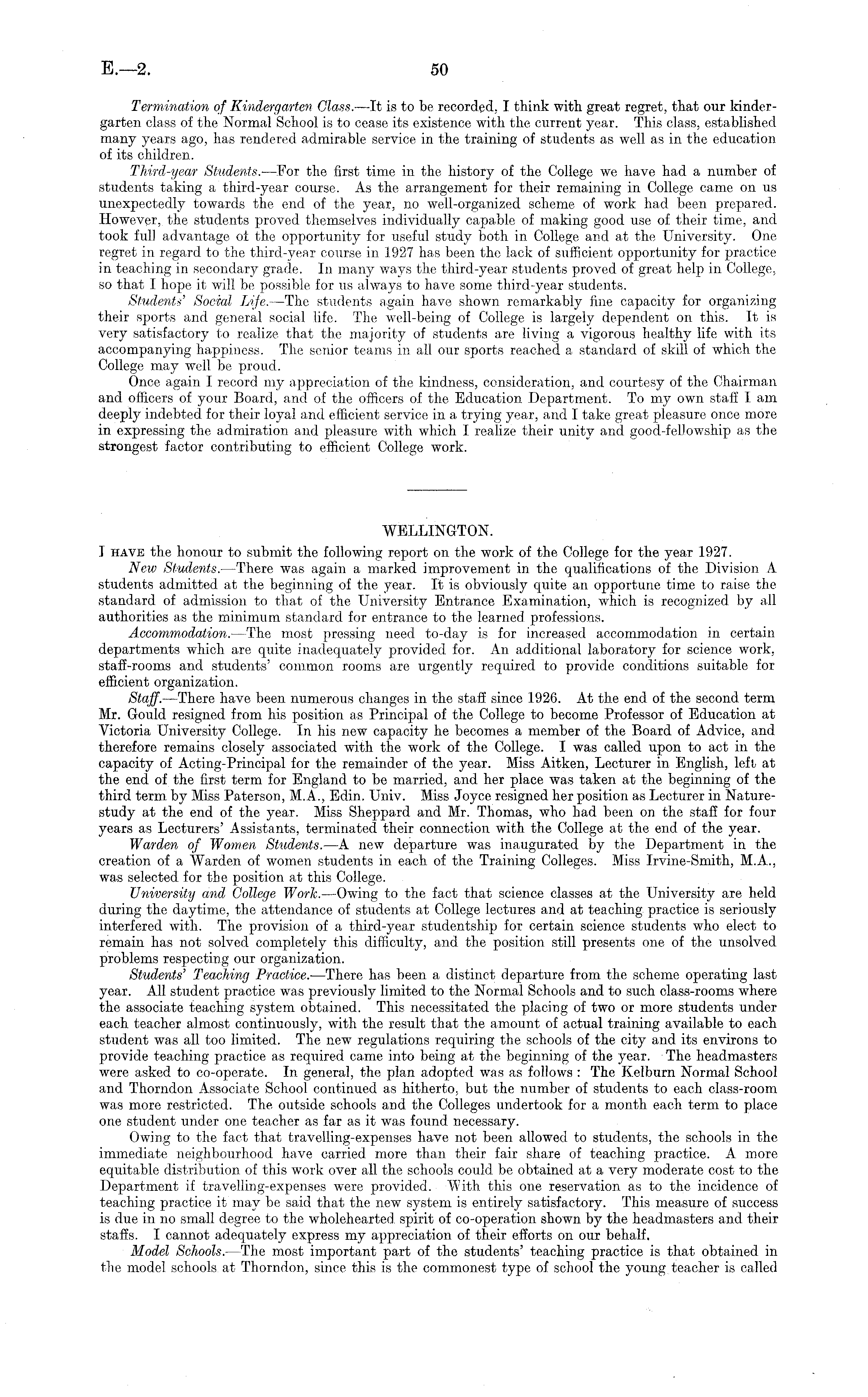 Termination of Kindergarten Class. —It is to be recorded. I think with great regret, that our kindergarten class of the Normal School is to cease its existence with the current year. This class, established many years ago, has rendered admirable service in the training of students as well as in the education of its children. Third-year Students. —For the first time in the history of the College we have had a number of students taking a third-year course. As the arrangement for their remaining in College came on us unexpectedly towards the end of the year, no well-organized scheme of work had been prepared. However, the students proved themselves individually capable of making good use of their time, and took full advantage ot the opportunity for useful study both in College and at the University. One regret in regard to the third-year course in 1927 has been the lack of sufficient opportunity for practice in teaching in secondary grade. In many ways the third-year students proved of great help in College, so that I hope it will be possible for us always to have some third-year students. Students' Social Life. —The students again have shown remarkably fine capacity for organizing their sports and general social life. The well-being of College is largely dependent on this. It is very satisfactory to realize that the majority of students are living a vigorous healthy life with its accompanying happiness. The senior teams in all our sports reached a standard of skill of which the College may well be proud. Once again I record my appreciation of the kindness, consideration, and courtesy of the Chairman and officers of your Board, and of the officers of the Education Department. To my own staff lam deeply indebted for their loyal and efficient service in a trying year, and I take great pleasure once more in expressing the admiration and pleasure with which I realize their unity and good-fellowship as the strongest factor contributing to efficient College work. WELLINGTON. I have the honour to submit the following report on the work of the College for the year 1927. New Students. —There was again a marked improvement in the qualifications of the Division A students admitted at the beginning of the year. Tt is obviously quite an opportune time to raise the standard of admission to that of the University Entrance Examination, which is recognized by all authorities as the minimum standard for entrance to the learned professions. Accommodation. —The most pressing need to-day is for increased accommodation in certain departments which are quite inadequately provided for. An additional laboratory for science work, staff-rooms and students' common rooms are urgently required to provide conditions suitable for efficient organization. Staff. —There have been numerous changes in the staff since 1926. At the end of the second term Mr. Gould resigned from his position as Principal of the College to become Professor of Education at Victoria University College. In his new capacity he becomes a member of the Board of Advice, and therefore remains closely associated with the work of the College. I was called upon to act in the capacity of Acting-Principal for the remainder of the year. Miss Aitken, Lecturer in English, left at the end of the first term for England to be married, and her place was taken at the beginning of the third term by Miss Paterson, M.A., Edin. Univ. Miss Joyce resigned her position as Lecturer in Naturestudy at the end of the year. Miss Sheppard and Mr. Thomas, who had been on the staff for four years as Lecturers' Assistants, terminated their connection with the College at the end of the year. Warden of Women Students. —A new departure was inaugurated by the Department in the creation of a Warden of women students in each of the Training Colleges. Miss Irvine-Smith, M.A., was selected for the position at this College. University and College Work. —Owing to the fact that science classes at the University are held during the daytime, the attendance of students at College lectures and at teaching practice is seriously interfered with. The provision of a thixd-year studentship for certain science students who elect to remain has not solved completely this difficulty, and the position still presents one of the unsolved, problems respecting our organization. Students' Teaching Practice. —There has been a distinct departure from the scheme operating last year. All student practice was previously limited to the Normal Schools and to such class-rooms where the associate teaching system obtained. This necessitated the placing of two or more students under each teacher almost continuously, with the result that the amount of actual training available to each student was all too limited. The new regulations requiring the schools of the city and its environs to provide teaching practice as required came into being at the beginning of the year. • The headmasters were asked to co-operate. In general, the plan adopted was as follows : The Kelburn Normal School and Thorndon Associate School continued as hitherto, but the number of students to each class-room was more restricted. The outside schools and the Colleges undertook for a month each term to place one student under one teacher as far as it was found necessary. Owing to the fact that travelling-expenses have not been allowed to students, the schools in the immediate neighbourhood have carried more than their fair share of teaching practice. A more equitable distribution of this work over all the schools could, be obtained at a very moderate cost to the Department if travelling-expenses were provided. With this one reservation as to the incidence of teaching practice it may be said that the new system is entirely satisfactory. This measure of success is due in no small degree to the wholehearted spirit of co-operation shown by the headmasters and their staffs. I cannot adequately express my appreciation of their efforts on our b