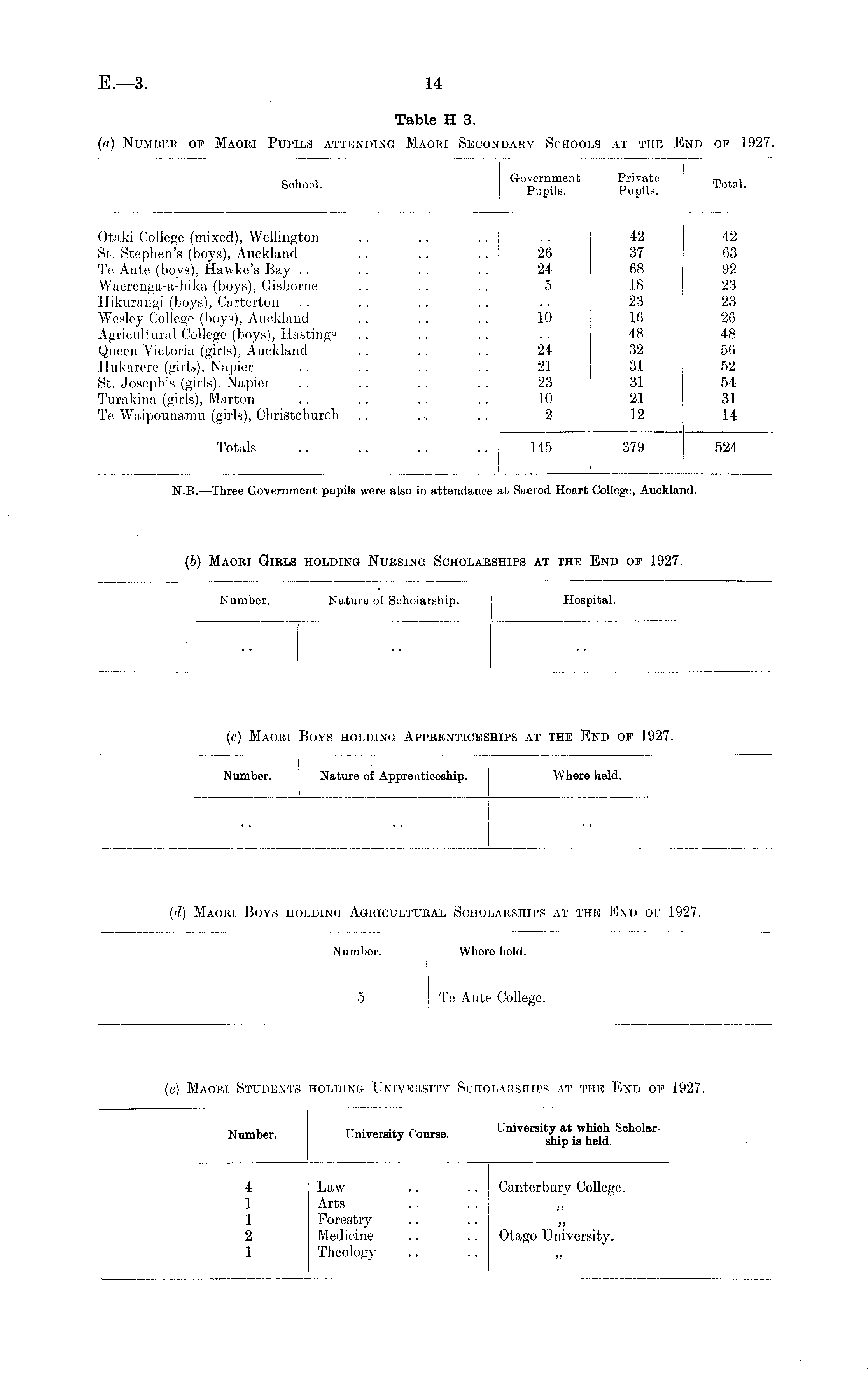 Table H3. (a) Number of Maori Pupils attending Maori Secondary Schools at the End of 1927.