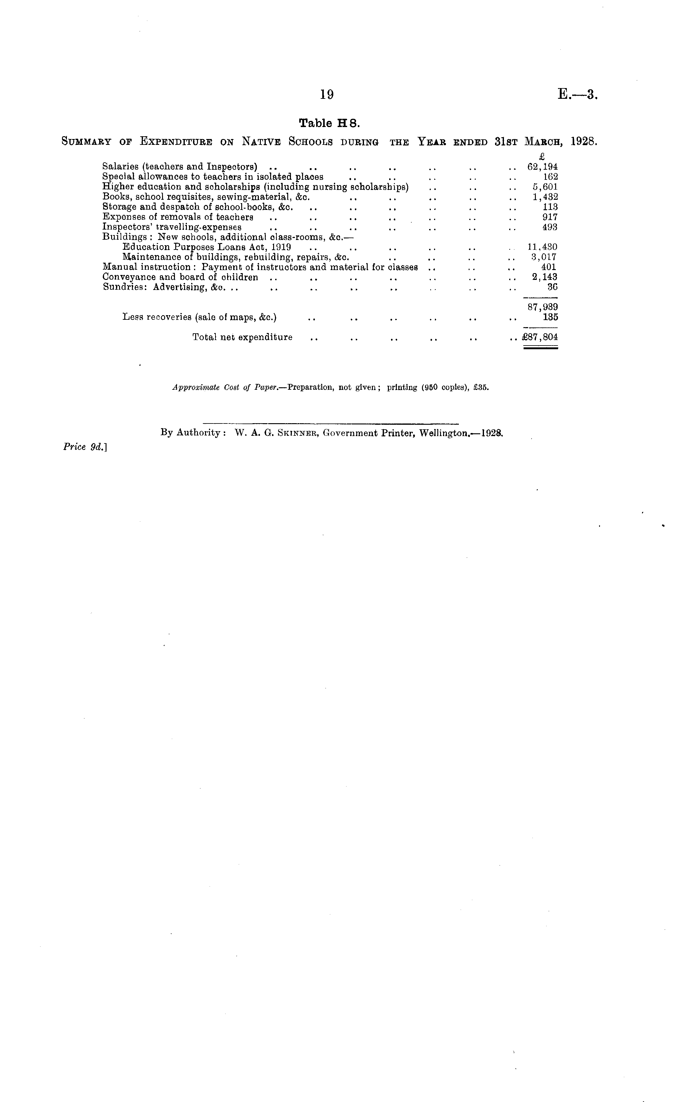Table H 8. Summary of Expenditure on Native Schools during the Year ended 31st March, 1928 £ Salaries (teachors and Inspectors) .. .. .. .. .. .. .. 62,194 Speoial allowances to teachers in isolated places .. .. .. .. .. 162 Higher education and scholarships (inoluding nursing scholarships) .. .. .. 5,601 Books, school requisites, sewing-material, &o. .. .. .. .. .. 1,432 Storage and despatch of school-books, &c. .. .. .. .. .. .. 113 Expenses of removals of teachers .. .. .. .. .. .. .. 917 Inspectors' travelling-oxpenses .. .. .. .. .. .. .. 493 Buildings : New schools, additional class-rooms, &o. — Education Purposes Loans Act, 1919 .. .. .. .. .. 11,430 Maintenance of buildings, rebuilding, repairs, &c. .. .. .. .. 3,017 Manual instruction : Payment of instructors and material for classes .. .. .. 401 Conveyance and board of children .. .. .. .. .. .. .. 2,143 Sundries: Advertising, &o. .. .. .. .. .. .. .. .. 30 87,939 Less recoveries (sale of maps, &c.) .. .. .. .. .. .. 135 Total net expenditure .. .. .. .. .. ..£87,804