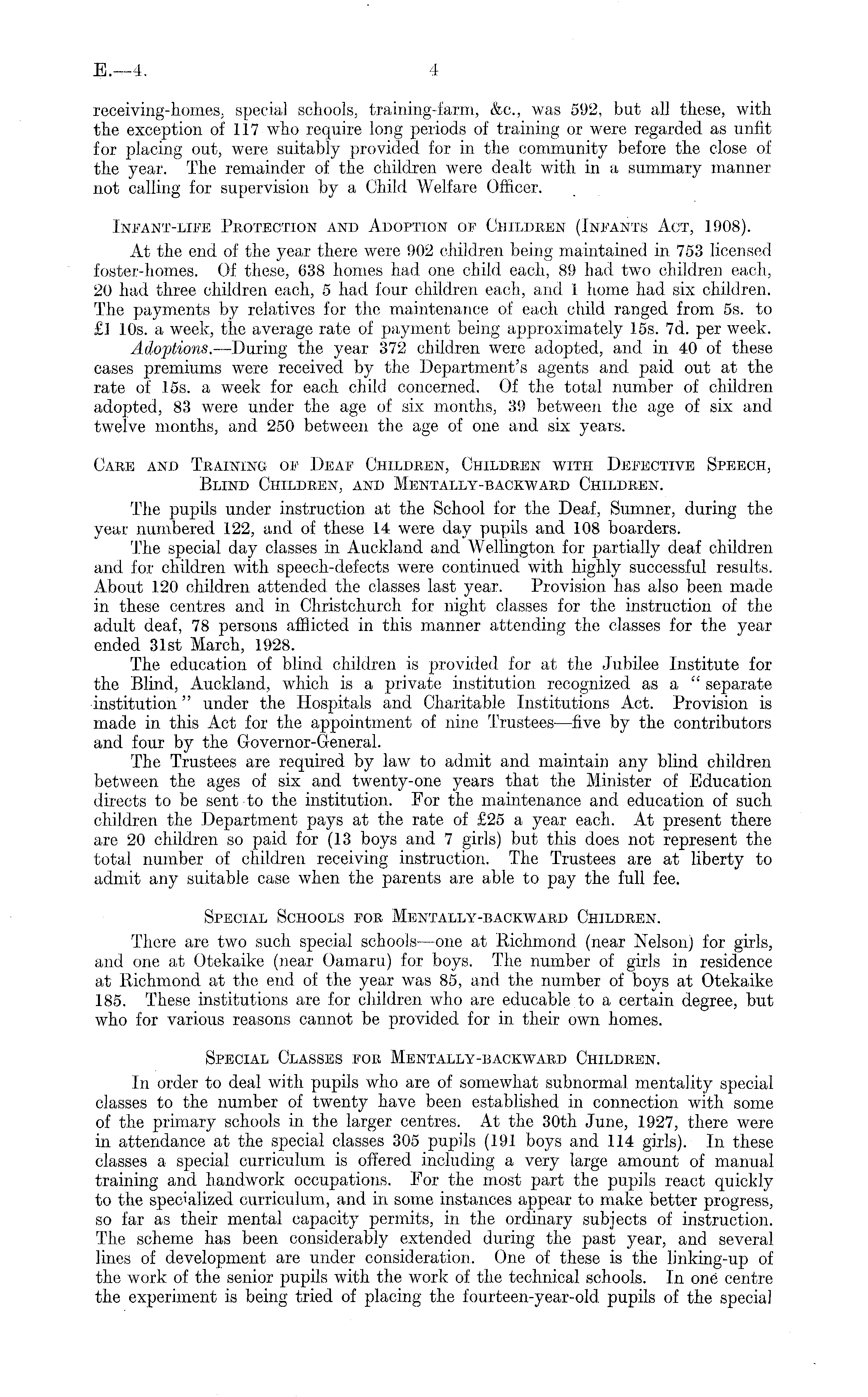 receiving-homes, special schools, training-farm, &c, was 592, but all these, with the exception of 117 who require long periods of training or were regarded as unfit for placing out, were suitably provided for in the community before the close of the year. The remainder of the children were dealt with in a summary manner not calling for supervision by a Child Welfare Officer. Infant-life Protection and Adoption of Children (Infants Act, 1908). At the end of the year there were 902 children being maintained in 753 licensed foster-homes. Of these, 638 homes had one child each, 89 had tw r o children each, 20 had three children each, 5 had four children each, and 1 home had six children. The payments by relatives for the maintenance of each child ranged from ss. to £] 10s. a week, the average rate of payment being approximately 15s. 7d. per week. Adoptions. —During the year 372 children were adopted, and. in 40 of these cases premiums were received by the Department's agents and paid out at the rate of 15s. a week for each child concerned. Of the total number of children adopted, 83 were under the age of six months, 39 between the age of six and twelve months, and 250 between the age of one and six years. Care and Training of Deaf Children, Children with Defective Speech, Blind Children, and Mentally-backward Children. The pupils under instruction at the School for the Deaf, Sumner, during the year numbered 122, and of these 14 were day pupils and 108 boarders. The special day classes in Auckland and Wellington for partially deaf children and for children with speech-defects were continued with highly successful results. About ,1.20 children attended, the classes last year. Provision has also been made in these centres and in Christchurch for night classes for the instruction of the adult deaf, 78 persons afflicted in this manner attending the classes for the year ended 31st March, 1928. The education of blind children is provided for at the Jubilee Institute for the Blind, Auckland, which is a private institution recognized as a " separate institution" under the Hospitals and Charitable Institutions Act. Provision, is made in this Act for the appointment of nine Trustees —five by the contributors and four by the Governor-General. The Trustees are required by law to admit and maintain any blind children between the ages of six and twenty-one years that the Minister of Education directs to be sent to the institution. For the maintenance and education of such children the Department pays at the rate of £25 a year each. At present there are 20 children so paid for (13 boys and 7 girls) but this does not represent the total number of children receiving instruction. The Trustees are at liberty to admit any suitable case when the parents are able to pay the full fee. Special Schools for Mentally-backward Children. There are two such special schools —one at Richmond (near Nelson) for girls, and one at Otekaike (near Oamaru) for boys. The number of girls in residence at Richmond at the end of the year was 85, and the number of boys at Otekaike 185. These institutions are for children who are educable to a certain degree, but who for various reasons cannot be provided for in their own homes. Special Classes for Mentally-backward Children. In order to deal with pupils who are of somewhat subnormal mentality special classes to the number of twenty have been established in connection with some of the primary schools in the larger centres. At the 30th June, 1927, there were in attendance at the special classes 305 pupils (191 boys and 114 girls). In these classes a special curriculum is offered including a very large amount of manual training and handwork occupations. For the most part the pupils react quickly to the specialized curriculum, and in some instances appear to make better progress, so far as their mental capacity permits, in the ordinary subjects of instruction. The scheme has been considerably extended during the past year, and several lines of development are under consideration. One of these is the linking-up of the work of the senior pupils with the work of the technical schools. In one centre the experiment is being tried of placing the fourteen-year-old pupils of the special