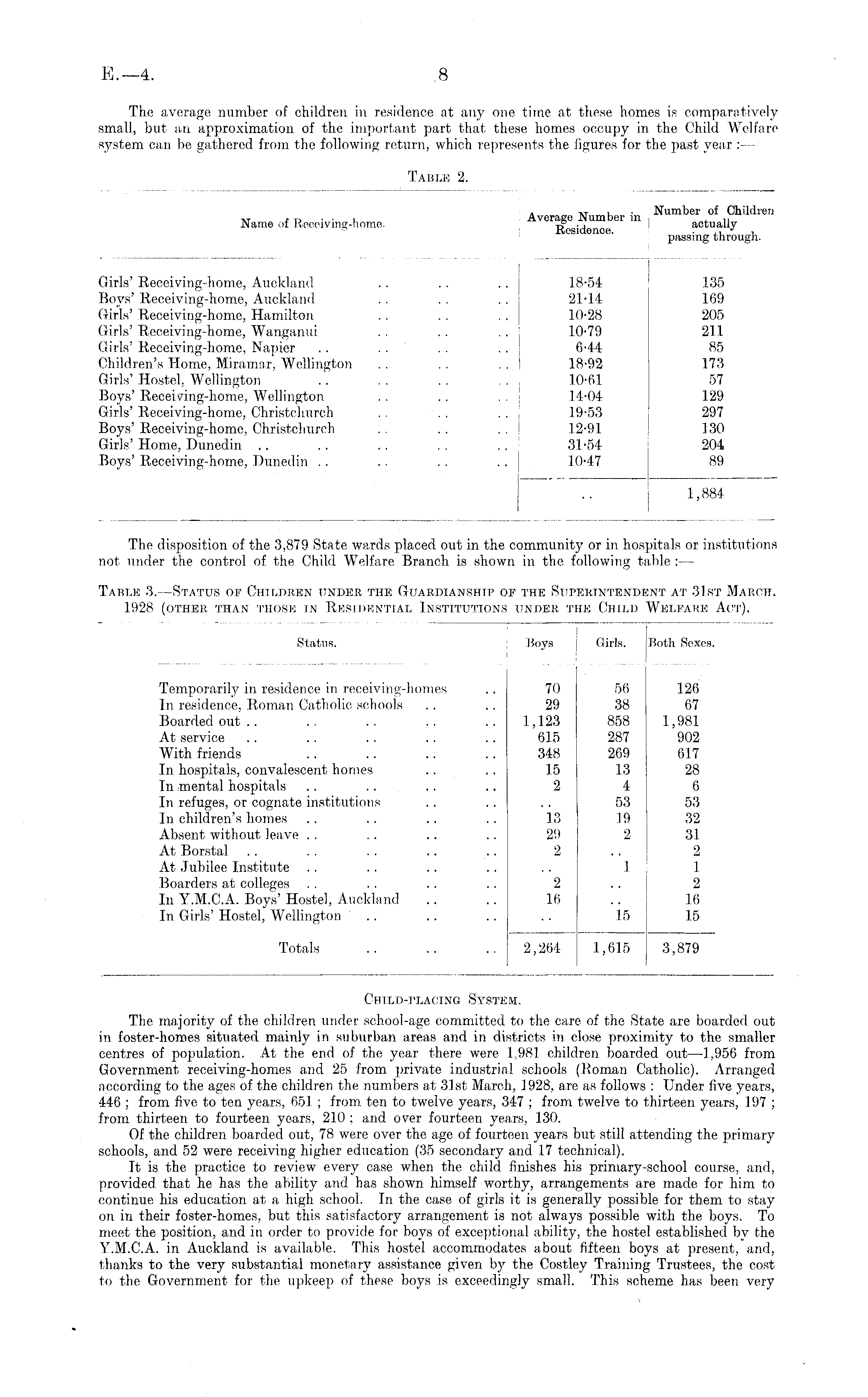 Child-placing System. The majority of the children under school-age committed to the care of the State are boarded out in foster-homes situated mainly in suburban areas and in districts in close proximity to the smaller centres of population. At the end of the year there were 1,981 children boarded out —1,956 from Government receiving-homes and 25 from private industrial schools (Roman Catholic). Arranged according to the ages of the children the numbers at 3.lst March, 1928, are as follows : Under five years, 446 ; from five to ten years, 651 ; from ten to twelve years, 34-7 ; from twelve to thirteen years, 197 ; from thirteen to fourteen years, 210 ; and over fourteen years, 130. Of the children boarded out, 78 were over the age of fourteen years but still attending the primary schools, and 52 were receiving higher education (35 secondary and 17 technical). It is the practice to review every case when the child finishes his primary-school course, and, provided that he has the ability and has shown himself worthy, arrangements arc made for him to continue his education at a high school. In the case of girls it is generally possible for them to stay on in their foster-homes, but this satisfactory arrangement is not always possible with the boys. To meet the position, and in order to provide for boys of exceptional ability, the hostel established by the V.M.C.A. in Auckland is available. This hostel accommodates about fifteen boys at present, and, thanks to the very substantial monetary assistance given by the Costley Training Trustees, the cost to the Government for the upkeep of these boys is exceedingly small. This scheme has been very