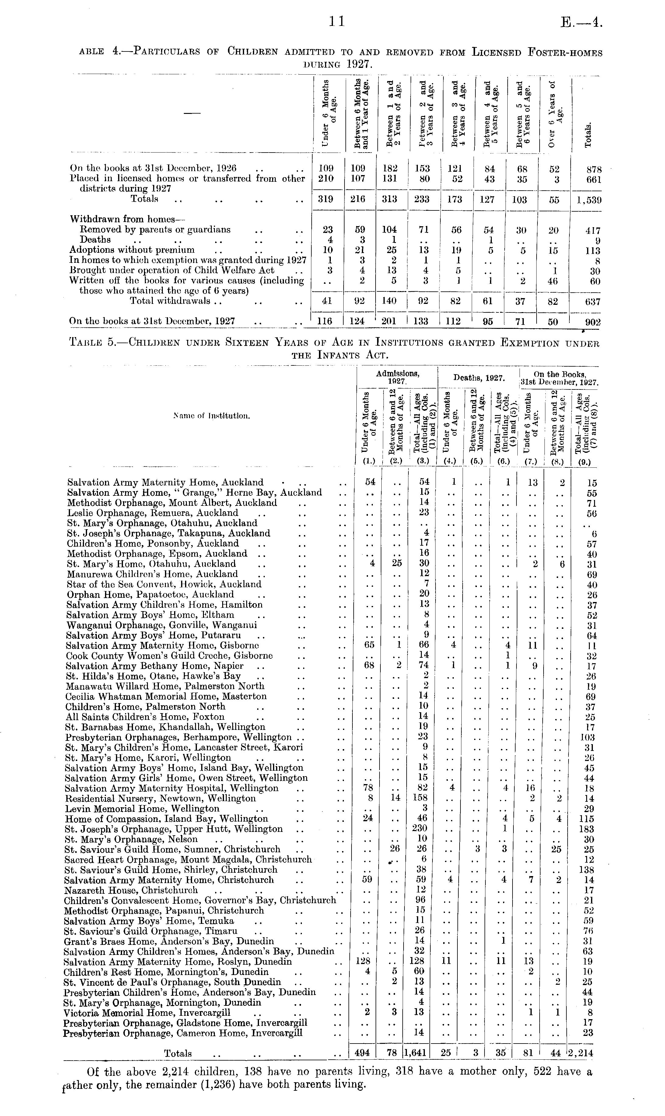 Ai Admissions, 1027. m r "'v Si a ClD bCo - > H M 0 CD O "3 W-—' 1 as i-c B.c , a fl co*o J. p oj > fl « —• oH .° flw (2.) I (8.) Dei oaths, 1! 127. On the Boi 31st Decembei >ks, •, 1B27. Name of institution. to 1. la CO<i So I' m A 43 **. fl S Is a co"' I a .,«- 1 rt co a ~. a 01 T ~ l CO a to g 2 ill a fl . « — 4*. CO O ■2 §51 3 o fl H* I to (6.) I (7.) a 5p g ' I 00 c "i co .fl ss («■) jpiu i'gs Sop Sot H© (9.) I (5.) Salvation Army Maternity Home, Auckland • .. Salvation Army Home, " Grange," Heme Bay, Auckland Methodist Orphanage, Mount Albert, Auckland Leslie Orphanage, Romuora, Auckland St. Mary's Orphanage, Otahuhu, Auckland St. Joseph's Orphanage, Takapuna, Auckland Children's Home, Ponsonby, Auckland Methodist Orphanage, Epsom, Auckland St. Mary's Home, Otahuhu, Auckland Manurcwa Children's Home, Auckland Star of the Sea Convent, Howick, Auckland Orphan Home, Papatoetoc, Auckland Salvation Army Children's Home, Hamilton Salvation Army Boys' Home, Eltham Wanganui Orphanage, Gonville, Wanganui Salvation Army Boys' Home, Putararu Salvation Army Maternity Home, Gisbornc Cook County Women's Guild Creche, Gisborne Salvation Army Bethany Home, Napier St. Hilda's Home, Otane, Hawke's Bay Manawatu Willard Home, Palmerston North Cecilia Whatman Memorial Home, Masterton Children's Home, Palmerston North All Saints Children's Homo, Foxton St. Barnabas Home, Khandallah, Wellington Presbyterian Orphanages, Berhampore, Wellington St. Mary's Children's Homo, Lancaster Street, Karori St. Mary's Homo, Karori, Wellington Salvation Army Boys' Homo, Island Bay, Wellington Salvation Army Girls' Home, Owen Street, Wellington Salvation Army Maternity Hospital, Wellington Residential Nursery, Newtown, Wellington Levin Memorial Home, Wellington .. Home of Compassion, Island Bay, Wellington St. Joseph's Orphanage, Upper Hutt, Wellington St. Mary's Orphanage, Nelson St. Saviour's Guild Home, Sumner, Christchurch Sacred Heart Orphanage, Mount Magdala, Christchurch St. Saviour's Guild Home, Shirley, Christchurch Salvation Army Maternity Home, Christchurch Nazareth House, Christchurch Children's Convalescent Home, Governor's Bay, Christchurch Methodist Orphanage, Papanui, Christchurch Salvation Army Boys' Home, Temuka St. Saviour's Guild Orphanage, Timaru Grant's Braes Home, Anderson's Bay, Dunedin Salvation Army Children's Homes, Anderson's Bay, Dunedin Salvation Army Maternity Home, Roslyn, Dunedin Children's Pest Home, Mornington's, Dunedin St. Vincent de Paul's Orphanage, South Dunedin Presbyterian Children's Home, Anderson's Bay, Dunedin St. Mary's Orphanage, Mornington, Dunedin Victoria Memorial Home, Invercargill Presbyterian Orphanage, Gladstone Home, Invercargill Presbyterian Orphanage, Cameron Home, Invercargill 54 54 15 14 23 1 1 13 2 15 55 71 56 '4 65 68 4 17 16 25 30 12 7 20 13 8 4 9 1 66 14 2 74 2 2 '.'. 14 10 14 19 23 9 8 15 15 82 14 158 3 46 .. 230 10 26 26 6 38 59 12 96 15 11 26 14 32 .. 128 5 60 2 13 14 4 3 13 4 i '.'> .. I 2 4 11 1 1 9 '2 I •• ii 9 6 •■ 6 57 40 31 09 40 26 37 52 31 64 II 32 17 26 19 69 37 25 17 103 31 26 45 44 18 14 29 115 183 30 25 i 12 138 14 17 21 52 59 76 31 63 19 10 25 44 19 8 17 23 78 8 '4 4 16 .16 2 2 2 24 'i '5 I 5 4 3 3 '.'. 25 59 4 4 '7 7 2 1 '.'. 128 4 11 ii i:i 13 2 2 o 2 1 i i '.. U Totals 494 78 1,641 25 I 3 36 j 81 81 44 2,214 Of the above 2,214 children, 1.38 have no parent: ?ather only, the remainder (1,236) have both parents livi 3 living, 318 hi ,ve a mot ter o: ily, 522 hi ,ve a ing.