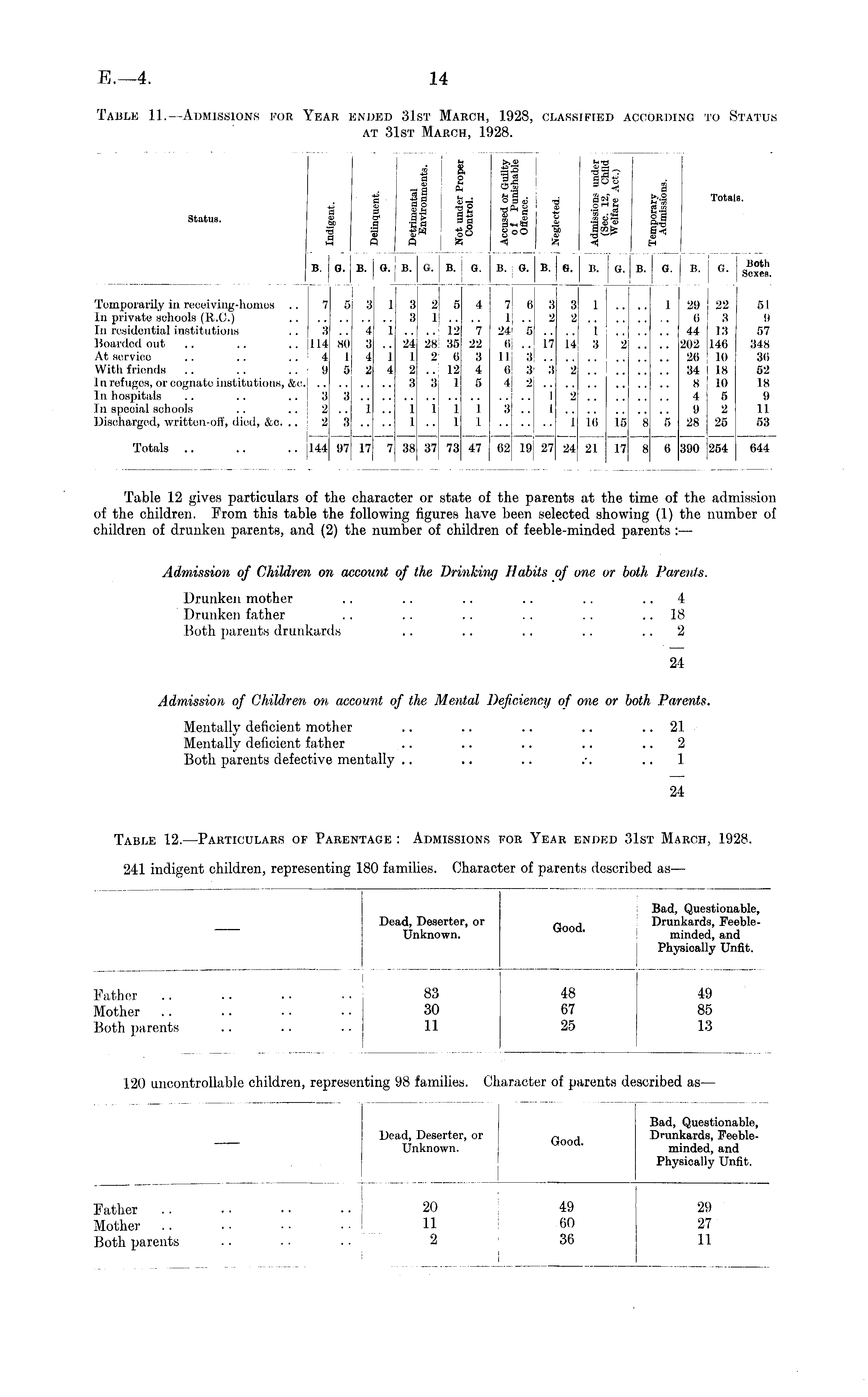 Table 12 gives particulars of the character or state of the parents at the time of the admission of the children. From this table the following figures have been selected showing (1) the number of children of drunken parents, and (2) the number of children of feeble-minded parents : — Admission of Children on account of the Drinking Habits of one or both Parents. Drunken mother .. . . .. .. .. .. 4 Drunken father .. .. . . . . .. 18 Both parents drunkards .. .. .. .. .. 2 24 Admission of Children on account of the Mental Deficiency of one or both Parents. Mentally deficient mother .. .. .. .. .. 21 Mentally deficient father .. .. .. .. .. 2 Both parents defective mentally .. .. .. .-. .. 1 24 Table 12.—Particulars of Parentage : Admissions for Year ended 31st March, 1928. 241 indigent children, representing 180 families. Character of parents described as —