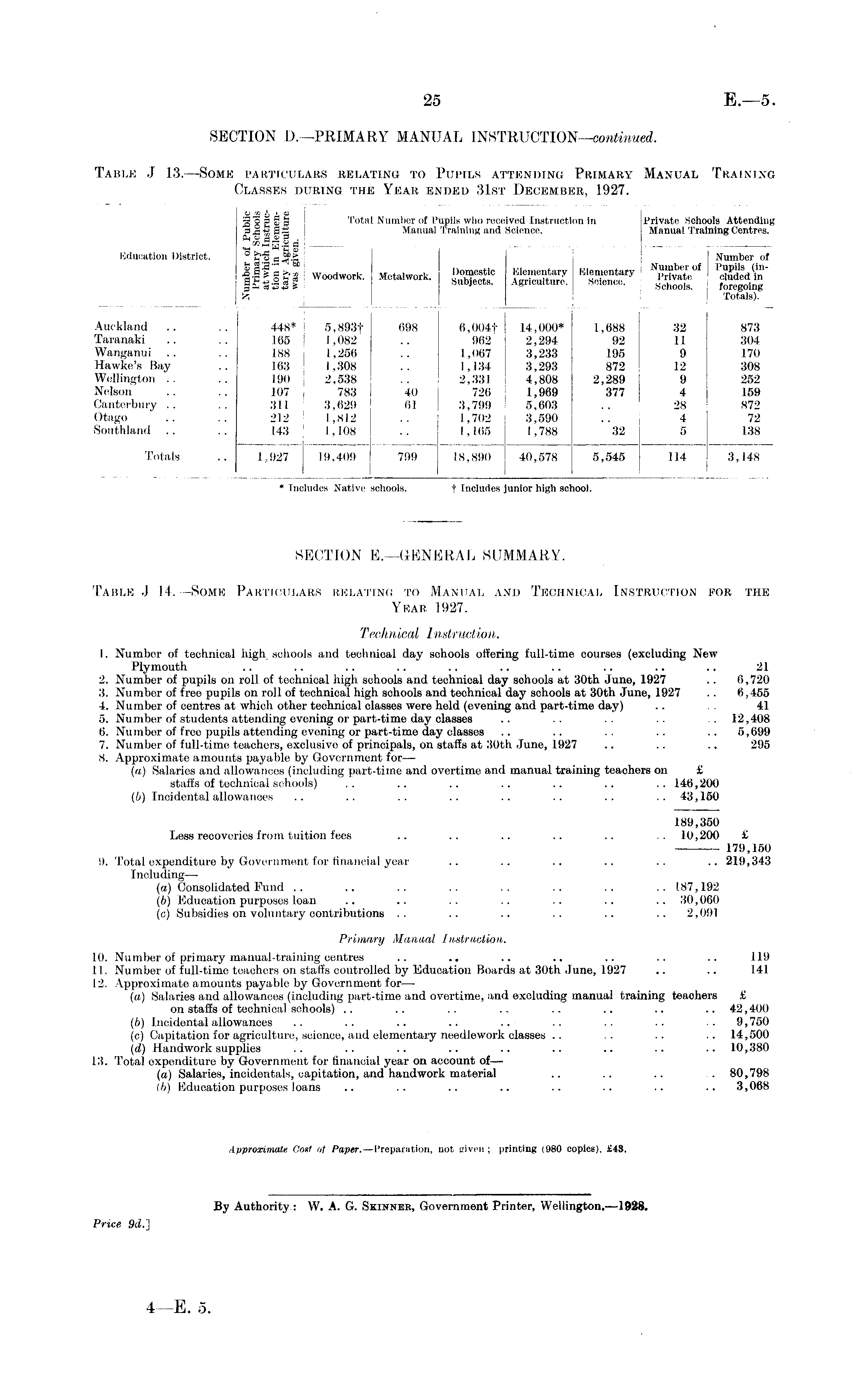 SECTION D.—PRIMARY MANUAL INSTRUCTION— continued. Table J 13.—Some particulars relating to Pupils attending Primary Manual Training Classes during the Year ended 31st December, 1927.