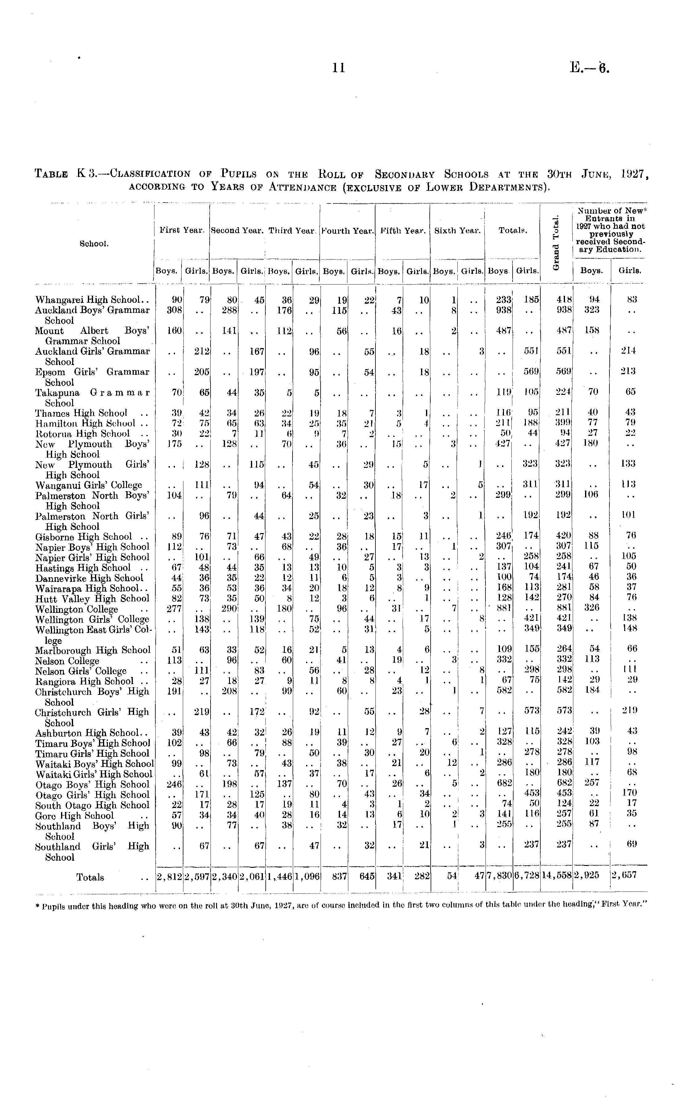 Table K3. —Classification of Pupils on the Roll of Secondary Schools at the 30th June, 1927, according to Years of Attendance (exclusive of Lower Departments).