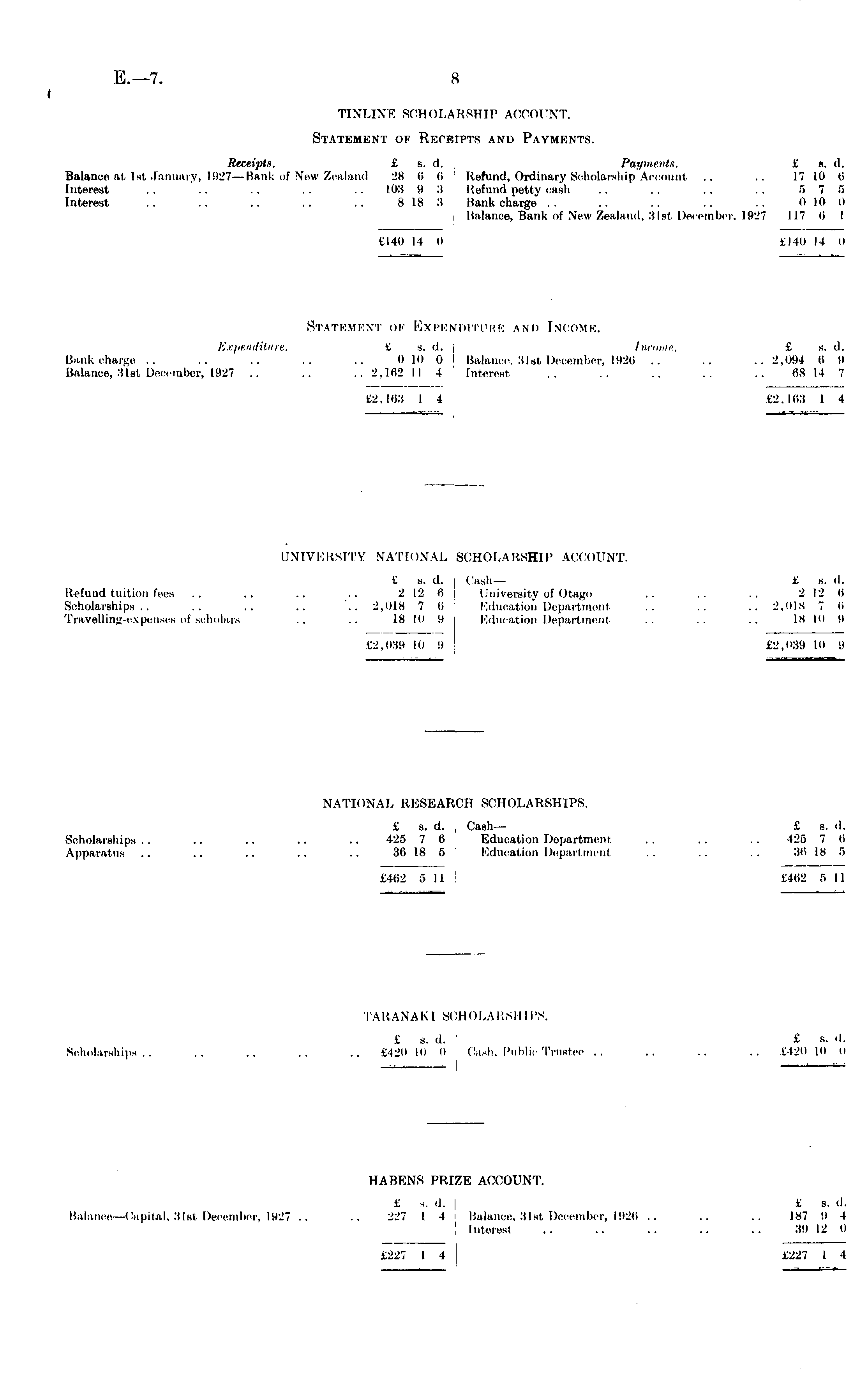 Receipts. £ s. d. Payments. £ s. d. Balance at Ist January, 1927 —Bank of New Zealand 28 6 6 Refund, Ordinary Scholarship Account .. .. 17 10 6 Interest .. .. .. .. .. 103 9 3 Refund petty cash .. .. .. .. 5 7 5 Interest .. .. .. .. .. 818 3 Bank charge .. .. .. .. .. 0100 Balance, Bank of New Zealand, 31st December, 1927 117 <> 1 £140 14 0 £140 14 0