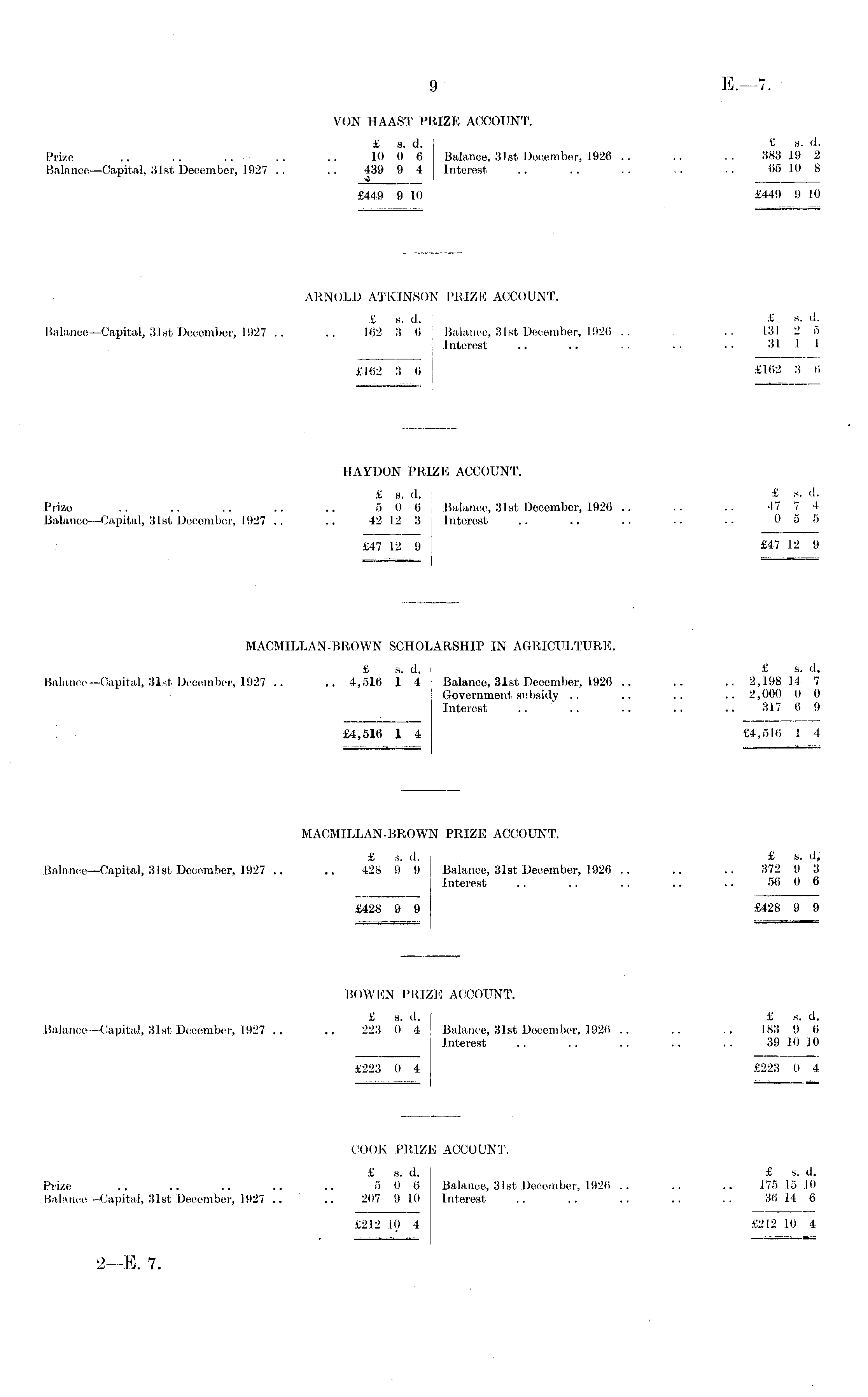 MAOMILLAN-BROWN PRIZE ACCOUNT. £ ,-s. d. £ s. d, Balance—Capital, 31st December, 1927 .. .. 428 99 | Balance, 31st December, 1926 .. .. .. 372 9 3 Interest .. .. .. .. .. 56 0 6 £428 9 9 £428 9 9