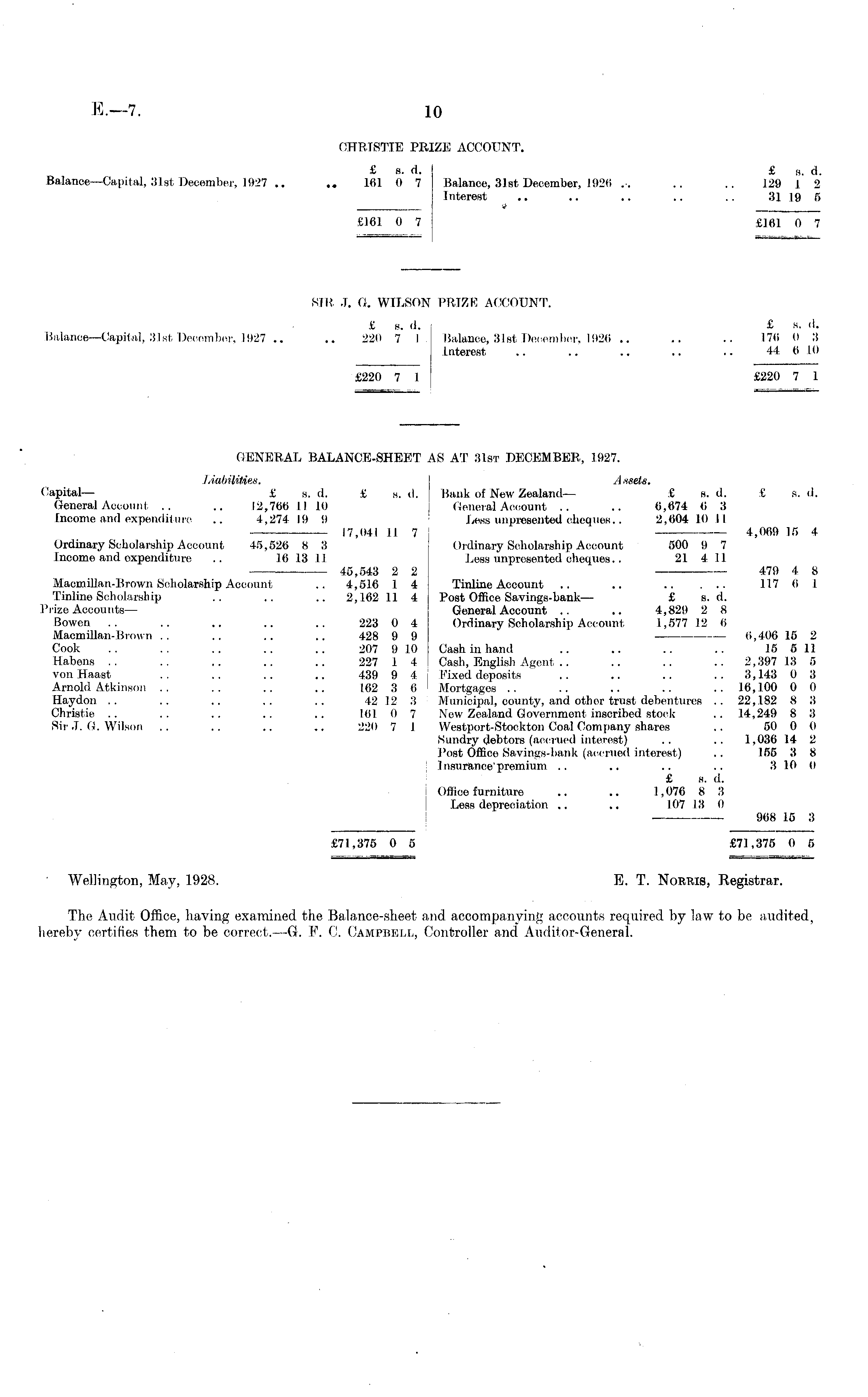 GENERAL BALANCE-SHEET AS AT 31st DECEMBER, 1927. Liabilities. Assets. Capital— £ s. d. £ s. <1. Bank of New Zealand-—■ £ s. d. £ a. d. General Account .. .. 12,766 11 10 General Account .. .. 6,674 0 3 Income and expenditure .. 4,274 19 9 Less unpresented cheques.. 2,604 10 II 17,041 11 7 4,009 15 4 Ordinary Scholarship Account 45,526 8 3 Ordinary Scholarship Account 500 9 7 Income and expenditure .. 16 13 II Less unpresented cheques.. 21 411 45,543 2 2 479 4 8 Macmillan-Brown Scholarship Account .. 4,516 1 4 Tinline Account .. .. .. ... 117 6 1 Tinline Scholarship .. .. .. 2,162 11 4 Post Office Savings-bank— £ s. d. Prize Accounts— General Aocount .. .. 4,829 2 8 Bowen .. .. .. .. .. 223 0 4 Ordinary Scholarship Account 1,577 12 6 Macmillan-Brown .. .. .. .. 428 9 9 6,406 15 2 Cook .. .. .. .. .. 207 9 10 Cash in hand .. .. .. .. 15 5 11 Habens .. .. .. .. .. 227 1 4 Cash, English Agent .. .. .. .. 2,397 13 5 von Haast .. .. .. .. 439 9 4 Fixed deposits .. .. .. .. 3,143 0 3 Arnold Atkinson .. .. .. .. 162 3 6 Mortgages .. .. .. .. .. 16,100 0 0 Haydon .. .. .. .. .. 42 12 3 Municipal, county, and other trust debentures .. 22,182 8 3 Christie .. .. .. .. .. 161 0 7 New Zealand Government inscribed stock .. .14,249 8 3 Sir .T. G. Wilson .. .. .. .. 220 7 I Westport-Stockton Coal Company shares .. 50 0 0 Sundry debtors (accrued interest) .. .. 1,036 14 2 Post Office Savings-bank (accrued interest) . . 155 3 8 Insurance'premium .. .. .. .. 3 10 0 £ s. d. Office furniture .. .. 1,076 8 3 Less depreciation .. .. 107 13 0 968 15 3 £71,375 0 5 £71,375 0 5 Wellington, May, 1928. E. T. Noruis, Registrar.