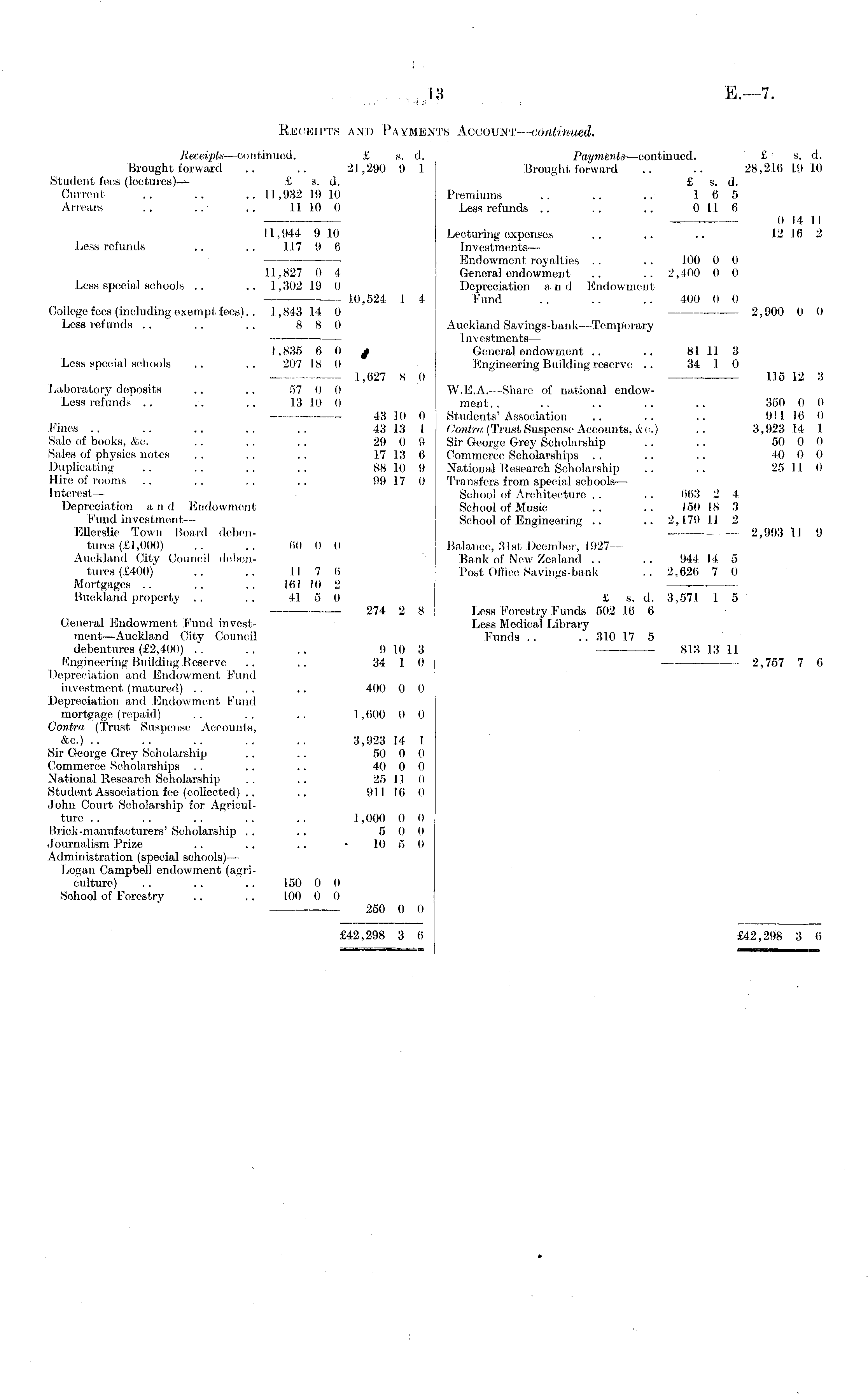 Receipts and Payments Account— continued. Receipts —continued. £ s, d. Payments —continued. £ s. d. Brought forward .. .. 21,290 9 1 Brought forward .. .. 28,216 19 10 Student fees (lectures)—*- £ s. d. £ s. d. Currcnl .. .. .. 11,932 19 10 Premiums .. .. .. 16 5 Arrears .. .. .. 11 10 0 Less refunds .. .. .. 0 11 6 —, . 0 14 11 11,944 9 10 Lecturing expenses .. .. .. 12 16 2 Less refunds .. .. 117 9 (> Investments— Endowment royalties .. .. 100 0 0 11,827 0 4 General endowment .. .. 2,400 0 0 Less special schools .. .. 1,302 19 0 Depreciation and Endowment 10,524 I 4 Fund .. .. .. 400 0 0 College fees (including exempt fees). . .1,843 14 0 2,900 0 0 Less refunds .. .. .. 8 8 0 Auckland Savings-bank—Temporary Investments— 1,835 6 0 f General endowment .. .. 81 11 3 Less special schools .. .. 207 18 0 Engineering Building reserve .. 34 I 0 1,627 8 0 115 12 3 Laboratory deposits .. .. 57 0 0 W.E.A.—Share of national endowLess refunds .. .. .. 13 10 0 ment.. .. .. .. .. 360 0 0 43 10 0 Students' Association .. .. .. 911 16 0 Fines .. .. .. .. .. 43 13 1 Contra (Trust Suspense Accounts, &c.) .. 3,923 14 1 Sale of books, &c. .. .. .. 29 0 9 Sir George Grey Scholarship .. .. 50 0 0 Sales of physios notes .. .. .. 17 13 6 Commerce Scholarships .. .. .. 40 0 0 Duplicating .. .. .. .. 88 10 9 National Research Scholarship .. .. 25 II 0 Hire of rooms .. .. .. .. 99 17 0 Transfers from special schools — Interest— School of Architecture .. .. 063 2 4 Depreciation and Endowment School of Music .. .. 150 18 3 Fund investment— School of Engineering .. .. 2,179 II 2 Ellcrslic Town Board deben- 2,993 11 9 tures (£1,000) .. .. (io o o Balance, 31st Doember, 1927Auckland City Council deben- Bank of New Zealand .. .. 944 14 5 lures (£4oo)' .. .. I I 7 (i Post Office Savings-bank .. 2,626 7 0 Mortgages .. .. .. 161 10 2 — Bnekland property .. .. 41 5 0 £ s. d. 3,571 1 5 274 2 8 Less Forestry Funds 502 16 6 General Endowment Fund invest- Less Medical Library ment—Auckland City Council Funds .. .. 310 17 5 debentures (£2,400) .'. .. .. 9 10 3 813 13 II Engineering Building Reserve .. .. 34 1 0 2,757 7 6 Depreciation and Endowment Fund investment (matured) . . . . .. 400 0 0 Depreciation and Endowment Fund mortgage (repaid) .. .. .. 1,600 0 0 Contra (Trust Suspense Accounts, &c.) .. .. .. .. .. 3,923 14 I Sir George Grey Scholarship .. .. 50 0 0 Commerce Scholarships .. .. .. 40 0 0 National Researoh Scholarship . . .. 25 11 0 Student Association fee (collected) . . .. 91 116 0 John Court Scholarship for Agriculture .. .. .. .. .. 1,000 0 0 Brick-manufacturers' Scholarship . . .. 5 0 0 Journalism Prize .. .. .. • 10 5 0 Administration (special schools) — Logan Campbell endowment (agriculture) .. .. .. 150 0 0 School of Forestry .. .. 100 0 0 250 0 0 £42,298 3 6 £42,298 3 6