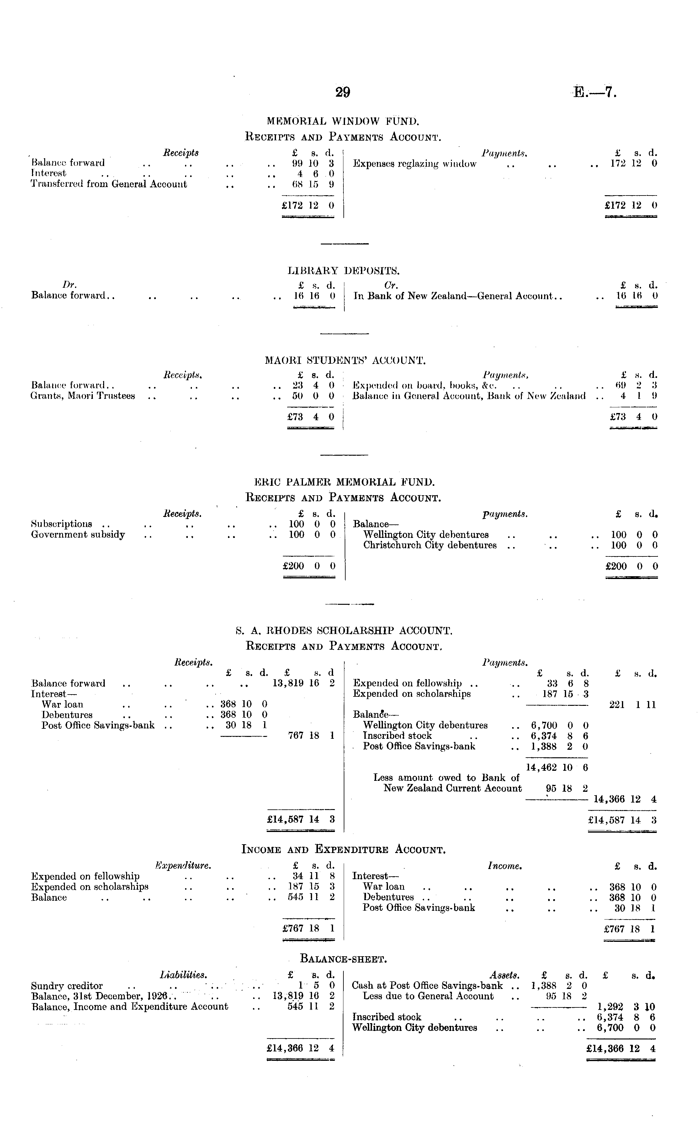 MEMORIAL WINDOW FUND. Receipts and Payments Account. Receipts £ s. d. Payments. £ s. d. Balance forward .. .. .. .. 99 10 3 Expenses reglazing window .. .. .. 172 12 0 Interest .. .. .. ~ .. 4 6 0 Transferred from General Account .. .. 68 15 9 £172 12 0 £172 12 0 LIBRARY DEPOSITS. Dr. £ s. d. Cr. £ s. d. Balance forward.. .. .. .. .. 16 16 0 In Bank of New Zealand—General Account.. .. 16 16 0 MAORI STUDENTS' ACCOUNT. Receipts. £ s. d. Payments, £ s. d. Balance forward.. .. .. .. 23 4 0 Expended on board, books, &o, .. .. 69 2 3 Grants, Maori Trustees .. .. .. .. 50 0 0 Balance in General Account, Bank of New Zealand .. 4 19 £73 4 0 | £73 4 0 ERIC PALMER MEMORIAL FUND. Receipts and Payments Account. Receipts. £ s. d. payments. £ s. d. Subscriptions .. .. .. .. .. 100 0 0 Balance— Government subsidy .. .. .. .'. 100 0 0 Wellington City debentures .. .. .. 100 0 0 Christchurch City debentures .. .. .. 100 0 0 £200 0 0 £200 0 0 S. A. RHODES SCHOLARSHIP ACCOUNT. Receipts and Payments Account. Receipts. Payments. £ s. d. £ s. d £ s. d. £ s. d. Balance forward .. .. .. .. 13,819 16 2 Expended on fellowship .. .. 33 6 8 Interest — Expended on scholarships .. 187 15 3 War loan .. .. .. 368 10 0 22.1 1 11 Debentures .. .. .. 368 1.0 0 Balance—Post Office Savings-bank .. .. 30 18 1 Wellington City debentures .. 6,700 0 0 767 18 1 Inscribed stock .. .. 6,374 8 6 Post Office Savings-bank .. 1,388 2 0 14,462 10 6 Less amount owed to Bank of New Zealand Current Account 95 .18 2 " 14,366 12 4 £14,587 14 3 £14,587 14 3 Income and Expenditure Account. Expenditure. £ s. d. Income. £ s. d. Expended on fellowship .. .. .. 34 11 8 Interest — Expended on scholarships .. .. ..187 15 3 War loan .. .. .. .. .. 368 10 0 Balance .. .. .. .. .. 545 11 2 Debentures .. .. .. .. .. 368 10 0 Post Office Savings-bank .. .. .. 30 18 1 £767 18 1 £767 18 1 Balance-sheet. Liabilities. _ £ s. d. Assets. £ s. d. £ s. d. Sundry creditor .. .. "... .. 15 0 Cash at Post Office Savings-bank .. 1,388 2 0 Balance, 31st Decembor, 1926.. .. .. 13,819 10 2 Less due to General Account .. 95 18 2 Balance, Income and Expenditure Account .. 545 11 2 —- 1,292 310 Inscribed stock .. .. .. .. 6,374 8 6 Wellington City debentures .. .. .. 6,700 0 0 £14,366 12 4 £14,366 12 4