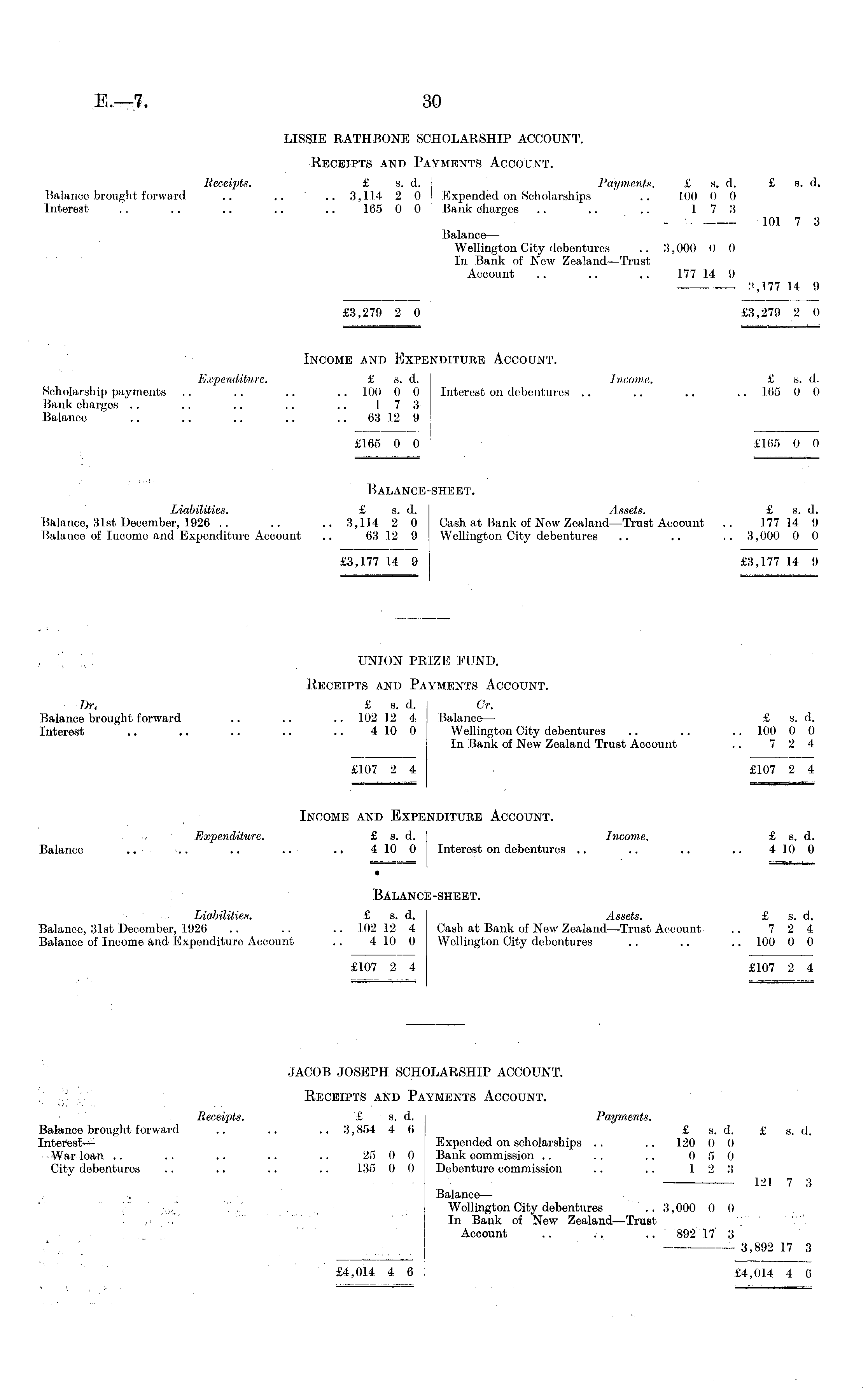 LISSIE RATHBONE SCHOLARSHIP ACCOUNT. Receipts and Payments Account. Receipts. £ s. d. :' Payments. £ s. d. £ s. d. Balance brought forward .. .. .. 3,114 20 I Expended on Scholarships .. 100 0 0 Interest .. .. .. .. .. 165 0 0 Bank charges .. .. .. 17 3 101 7 3 Balance—• Wellington City debentures .. 3,000 0 0 In Bank of Now Zealand—Trust Account .. .. .. 177 14 9 :',177 14 9 £3,279 2 0 £3,279 2 0 Income and Expenditure Account. Expenditure. £ s. d. Income. £ s. d. Scholarship payments .. .. .. .. 100 0 0 Interest on debentures .. .. .. .. 165 0 0 Bank charges .. .. .. .. .. 17 3 Balance .. .. .. .. 63 12 9 £165 0 0 £165 0 0 Balance-sheet. Lial>ilities. £ s. d. Assets. £ s. d. Balance, 31st December, 1926 .. .. .. 3,114 2 0 Cash at Bank of Now Zealand—Trust Account .. .177 14 9 Balance of Income and Expenditure Account .. 63 12 9 Wellington City debentures .. .. .. 3,000 0 0 £3,177 14 9 £3,177 14 9 ii \ . ; UNION PRIZE FUND. Receipts and Pay4vients Account. Dr, £ s. d. Or, Balance brought forward .. .. .. 102 12 4 Balance— £ s. d. Interest .. .. .. .. .. 410 0 Wellington City debentures .. .. .. 100 0 0 In Bank of New Zealand Trust Account .. 7 2 4 £107 2 4 i £107 2 4 Income and Expenditure Account. Expenditure, £ s. d. Income. £ s. d. Balance .. .. .. .. .. 4 10 0 Interest on debentures .. .. .. .. 4 10 0 Balance-sheet. Liabilities. £ s. d. Assets. £ s. d. Balance, 31st December, 1926 .. .. .. 102 12 4 Cash at Bank of Now Zealand—Trust Account .. 7 2 4 Balance of Income and Expenditure Account .. 410 0 Wellington City debentures .. .. .. 100 0 0 £107 2 4 £107 2 4 JACOB JOSEPH SCHOLARSHIP ACCOUNT. Receipts and Payments Account. Receipts. £ s. d. Payments. Balance brought forward .. .. .. 3,854 4 6 £ s. d. £ s. d. Interest—- Expended on scholarships .. .. 120 0 0 ■War loan .. .. .. .. .. 25 0 0 Bank commission .. .. .. 0 5 0 City debentures .. .. .. .. 135 0 0 Debenture commission .. .. 12.'! 121 7 3 Balance — ,';' v" ' '"•'.'.■;'... , Wellington City debentures .. 3,000 0 0 In Bank of New Zealand—Trust Account .. ;. .. 892 17 3 ' -3,892 17 3 £4,014 4 6 £4,014 4 0