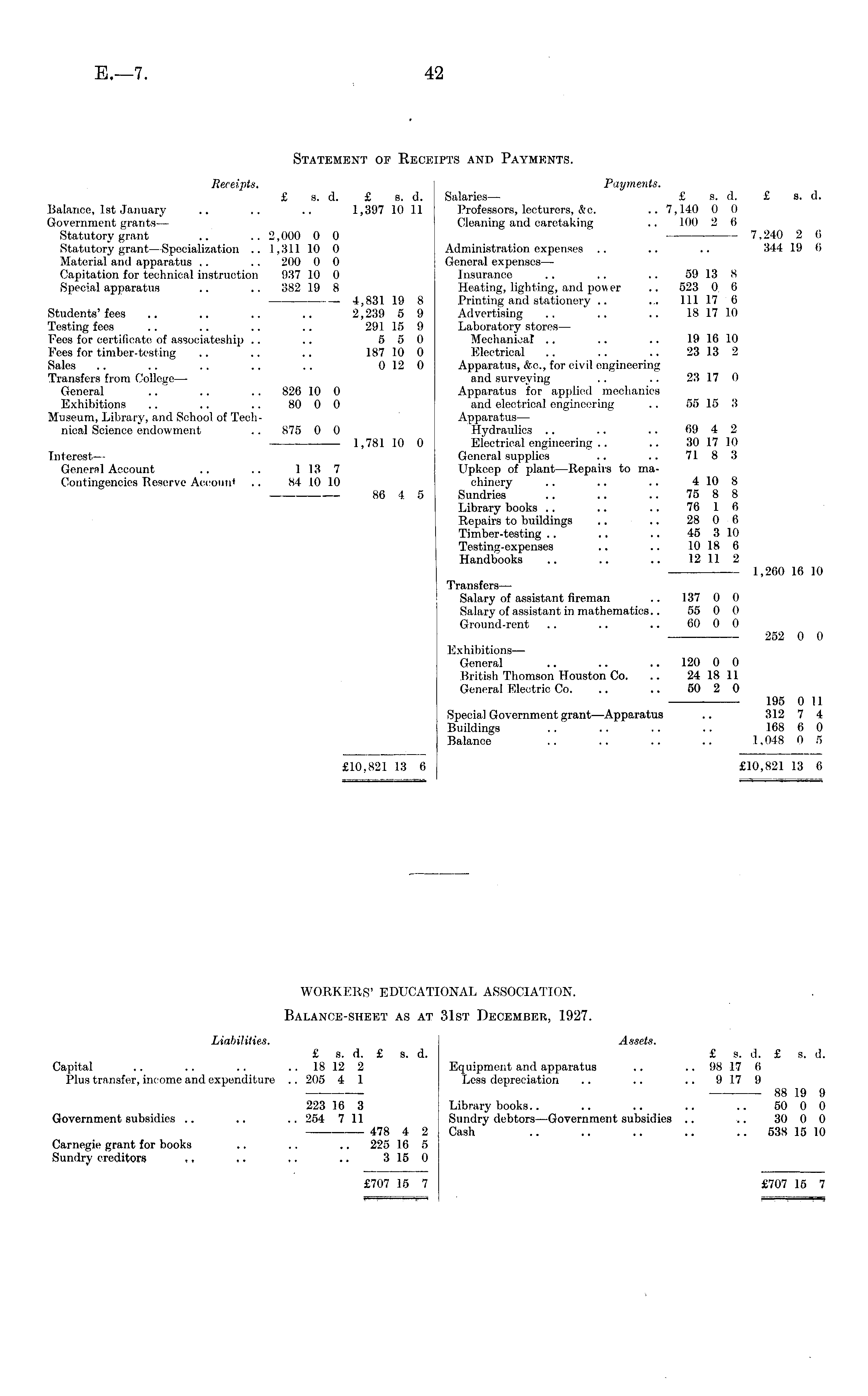 Statement of Receipts and Payments. Receipts. Payments. £ s. d. £ s. d. Salaries— £ s. cl. £ s. d. Balance, Ist January .. .. .. 1,397 10 11 Professors, lecturers, etc. .. 7,140 0 0 Government grants— Cleaning and caretaking .. 100 2 6 Statutory grant .. .. 2,000 0 0 7,240 2 6 Statutory grant —Specialization .. 1,311 10 0 Administration expenses .. .. .. 344 19 6 Material and apparatus .. .. 200 0 0 General expenses— Capitation for technical instruction 937 10 0 Insurance .. .. .. 59 13 8 Special apparatus .. .. 382 19 8 Heating, lighting, and power .. 523 0. 6 4,831 19 8 Printing and stationery .. ... 11l 17 6 Students'fees .. .. .. .. 2,239 5 9 Advertising .. .. .. 18 17 10 Testing fees .. .. .. .. 291 15 9 Laboratory stores— Fees for certificate of associateship .. .. 5 5 0 Mechanical .. .. .. 19 16 10 Fees for timber-testing .. .. .. 187 10 0 Electrical .. .. .. 23 13 2 Sales .. .. .. .. .. 012 0 Apparatus, &c, for civil engineering Transfers from College— and surveying .. .. 23 17 0 General .. .. .. 826 10 0 Apparatus for applied mechanics Exhibitions .. .. .. 80 0 0 and electrical engineering .. 55 15 3 Museum, Library, and School of Tech- Apparatus— nieal Science endowment .. 875 0 0 Hydraulics .. .. .. 69 4 2 1,781 10 0 Electrical engineering .. .. 30 17 10 Interest— General supplies .. .. 71 8 3 General Account .. .. 1 13 7 Upkeep of plant—Repairs to maContingencies Reserve Accoun* .. 84 10 10 chinery .. .. .. 410 8 86 4 5 Sundries .. .. .. 75 8 8 Library books .. .. .. 76 1 6 Repairs to buildings .. .. 28 0 6 Timber-testing .. ' .. .. 45 310 Testing-expenses .. .. 10 18 6 Handbooks .. .. .. 12 11 2 1,260 16 10 Transfers— Salary of assistant fireman .. 137 0 0 Salary of assistant in mathematics.. 55 0 0 Ground-rent .. .. .. 60 0 0 252 0 0 Exhibitions— General .. .. .. 120 0 0 British Thomson Houston Co. .. 24 18 11 General Electric Co. .. .. 50 2 0 195 0 11 Special Government grant —Apparatus .. 312 7 4 Buildings .. .. .. .. 168 6 0 Balance .. .. .. .. 1,048 0 5 £10,821 13 6 £10,821 13 6 WORKERS' EDUCATIONAL ASSOCIATION. Balance-sheet as at 31st December, 1927. Liabilities. Assets. £ s. d. £ s. d. £ s. d. £ s. d. Capital .. .. .. 18 12 2 Equipment and apparatus .. .. 98 17 6 Plus transfer, income and expenditure .. 205 4 I Less depreciation .. .. .. 917 9 88 19 9 223 16 3 Library books.. .. .. .. .. 50 0 0 Government subsidies .. .. .. 254 711 Sundry debtors —Government subsidies .. .. 30 0 0 478 4 2 Cash .. .. .. .. .. 538 15 10 Carnegie grant for books .. .. .. 225 16 5 Sundry creditors ~ ~ ~ .. 315 0 £707 15 7 £707 15 7