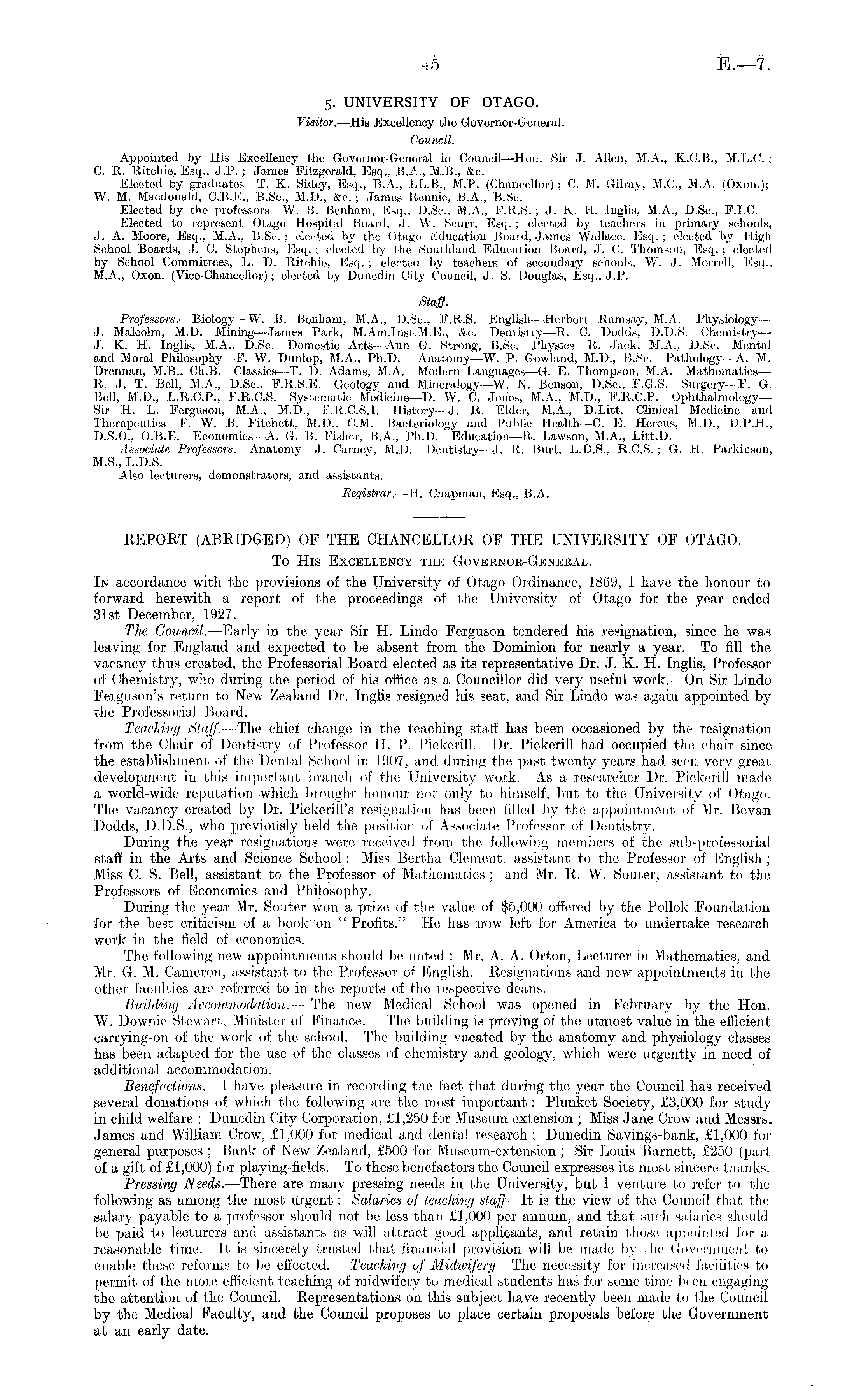 5. UNIVERSITY OF OTAGO. Visitor. —His Excellency the Governor-General. Council. Appointed by His Excellency tho Governor-General in Council—Hon. Sir J. Allen, M.A., X.C.8., M.L.C. ; C. R. Ritchie, Esq., J.P.; James "Fitzgerald, Esq., 8.A., M.8., &c Elected by graduates—T. K. Sidey, Esq., 8.A., LL.B., M.P. (Chancellor) jC. M. Gilray, M.C., M.A. (Oxon.); W. M. Maedonald, C.8.E., B.Sc, M.D., &o.; James Rennio, 8.A., B.Sc. Elected by the professors—W. B. Benham, Esq., D.Sc., M.A., F.R.S. ;J. K. 11. Inglis, M.A., D.Sc, F.T.O. Elected to represent Otago Hospital Board, J. W. Sourr, Esq.; oleetcd by teachers in primary schools, J. A. Moore, Esq., M.A., B.Sc; elected by the Otago Education Board, James Wallace, Esq.; elected by High School Boards, J. C. Stephens, Esq.; elected by the Southland Education Board, J. C. Thomson, Esq.; elected by School Committees, L. D. Ritchie, Esq. ; elected by teachers of secondary schools, W. J. Morrell, Esq., M.A., Oxon. (Vice-Chancellor); elected by Dunedin City Council, J. S. Douglas, Esq., J.P. Staff. Professors.- —Biology—W. B. Benham, M.A., D.Sc, F.R.S. English—Herbert Ramsay, M.A. Physiology— J. Malcolm, M.D. Mining—James Park, M.Am.lnst.M.E., &o. Dentistry—R. C. Dodds, D.D.S. Chemistry— J. K. H. Inglis, M.A., D.Sc Domestic Arts—Ann G. Strong, B.Sc. Physics—R. .lack, M.A., D.Sc Mental and Moral Philosophy—F. W. Dunlop, M.A., Ph.D. Anatomy—W. P. Gowland, M.D., B.Sc. Pathology—A. M. Drennan, M.8., Ch.B. Classics —T. D. Adams. M.A. Modern Languages—G. E. Thompson, M.A. Mathematics — R. J. T. Bell, M.A., D.Sc, F.R.S.E. Geology and Mineralogy—W. N. Benson, D.Sc, F.G.S. Surgery—F. G. Bell, M.D., L.R.C.P., F.R.C.S. Systematic Medicine—D. W. C. Jones, M.A., M.D., F.R.C.P. OphthalmologySir H. L. Ferguson, M.A., M.D., F.R.C.S.].. History—J. R. Elder, M.A., D.Litt. Clinical Medicine anil Therapeutics—F. W. B. Fitch ett, M.D., CM. Bacteriology and Public Health—C. E. Hercus, M.D., D.P.D., D.5.0., 0.8. E. Economics— A. G. B. Fisher, 8.A., Ph.D. Education—R. Lawson, M.A., Litt.D. Associate Professors. —Anatomy—J. Carney, M.D. Dentistry—J. it. Burt, L.D.S., R.C.S. ;G. H. Parkinson, M.S., L.D.S. Also lecturers, demonstrators, and assistants. Registrar. —lT. Chapman, Esq., B.A. REPORT (ABRIDGED) OF THE CHANCELLOR OF THE UNIVERSITY OF OTAGO. To His Excellency the Govebnob-Genebal. In accordance with the provisions of the University of Otago Ordinance, 1869, 1 have the honour to forward herewith a report of the proceedings of the University of Otago for the year ended 31st December, 1927. The Council. —Early in the year Sir H. Lindo Ferguson tendered his resignation, since he was leaving for England and expected to be absent from the Dominion for nearly a year. To fill tho vacancy thus created, the Professorial Board elected as its representative Dr. J. K. H. Inglis, Professor of Chemistry, who during the period of his office as a Councillor did very useful work. On Sir Lindo Ferguson's return to New Zealand Dr. Inglis resigned his seat, and Sir Lindo was again appointed by the Professorial Board. Teaching Staff. —The chief change in the teaching staff has been occasioned by the resignation from the Chair of Dentistry of Professor H. P. Pickerill. Dr. Pickerill had occupied the chair since the establish ment of the Dental School in 1907, and during the past twenty years had seen very great development in this important branch of the University work. As a. researcher Dr. Pickerill made a, world-wide, reputation which brought honour not only to himself, but to the; University of Otago. The vacancy created by Dr. Pickerill's resignation has been filled by the appointment of Mr. Bevan Dodds, D.D.S., who previously held the position of Associate Professor of Dentistry. During the year resignations were received from the following members of the sub-professorial staff in the Arts and Science School: Miss Bertha Clement, assistant to the Professor of English ; Miss C. S. Bell, assistant to the Professor of Mathematics; and Mr. R. W. Souter, assistant to the Professors of Economics and Philosophy. During the year Mr. Souter won a prize of the value of $5,000 offered by the Pollok Foundation for the best criticism of a book on " Profits." lie has now loft for America to undertake research work in the field of economics. The following new appointments should be noted : Mr. A. A. Orton, Lecturer in Mathematics, and Mr. G. M. Cameron, assistant to the Professor of English. Resignations and new appointments in the other faculties are referred to in the reports of the respective deans. Building Accommodation. — -The now Medical School was opened in February by the lion. W. Downic Stewart, Minister of Finance. The building is proving of the utmost value in the efficient carrying-on of the work of the school. The building vacated by the anatomy and physiology classes has been adapted for the use of the classes of chemistry and geology, which were urgently in need of additional accommodation. Benefactions. —I have pleasure in recording the fact that during the year the Council has received several donations of which tho following are the most important: Plunket Society, £3,000 for study in child welfare ; Dunedin City Corporation, £1,250 for Museum extension ; Miss Jane Crow and Messrs. James and William Crow, £1,000 for medical and dental research ; 'Dunedin Savings-bank, £1,000 for general purposes ; Bank of New Zealand, £500 for Museum-extension ; Sir Louis Barnett, £250 (part of a gift of £1,000) for playing-fields. To these benefactors the Council expresses its most sincere thanks. Pressing Needs. —There are many pressing needs in the University, but I venture to refer to the following as among the most urgent: Salaries of teaching staff —It is the view of the Council that the salary payable to a professor should not be less than £1,000 per annum, and that such salaries should be paid to lecturers and ass
