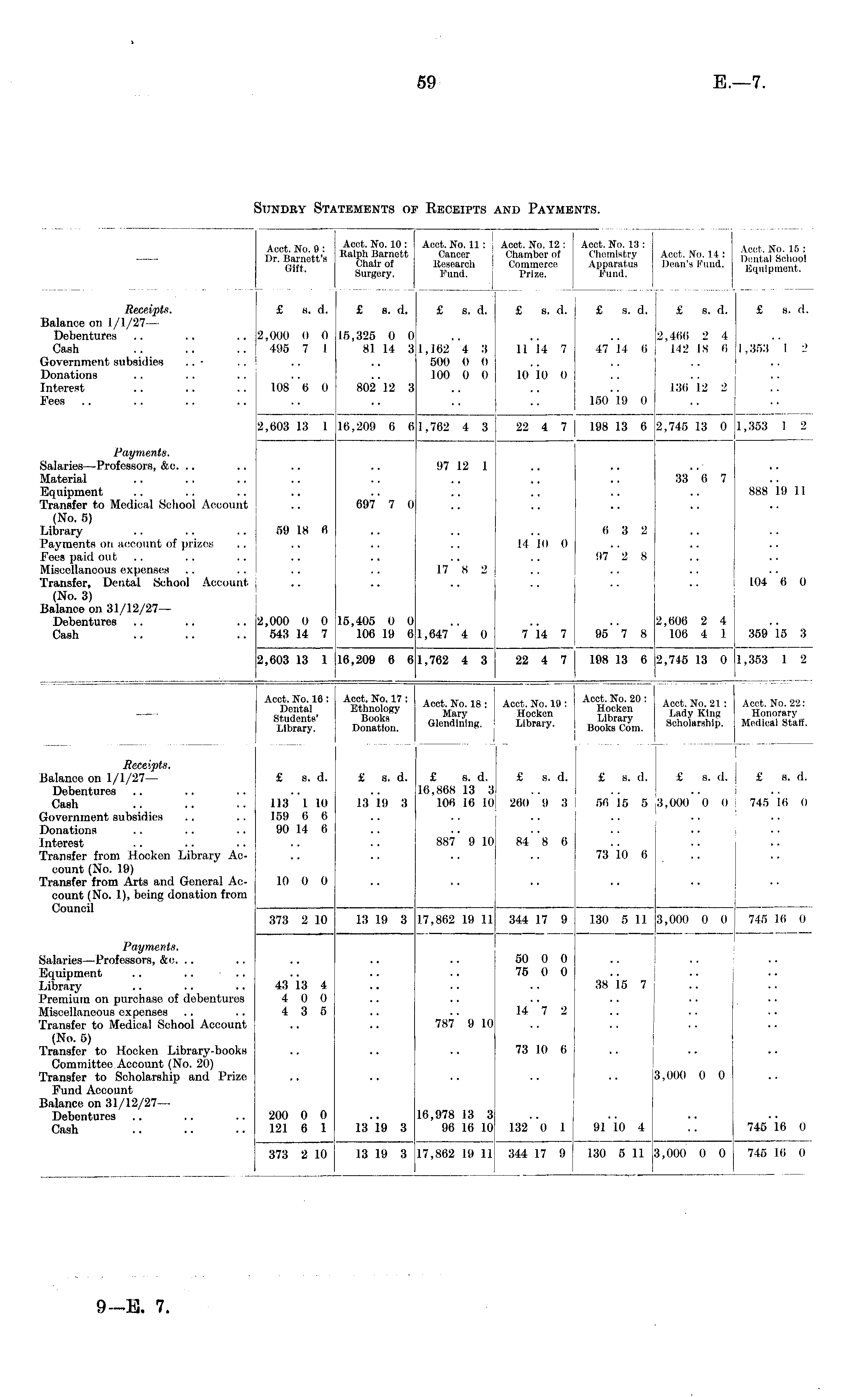 Acct Nn il- Acct. No. 10: Acct. No. 11: : Acct. No. 12 : Acct. No. 13 : ,,.,,. N „ ... u ■ Rnrnet+'"« R'uph Burnett Cancer \ Chamber of Chemistry Acct. No. 14 : fl, ,'".. ?&,, ,',' ' iir.Bi nuts g nau . 0( Research Commerce Apparatus Dean's Fund, , l' „,, '''"■ Surgery. Fund. Prize. I'und. imiiiliinuit. Receipts. Balance on 1/1/27 — Debentures Cash Government subsidies .. • Donations Interest Fees £ s. d. £ s. d. £ s. d. £ s. d. £ s. d. £ s. d. £ s. d. 2,000 0 0 15,325 0 0 .. .. .. 2,466 2 4 495 7 1 81 14 31,162 4 3 11 14 7 47 14 6 142 18 6 1,353 I 2 500 0 0 100 0 0 10 10 0 108 6 0 802 12 3 .. .. .. 136 12 2 150 19 0 2,603 13 1 16,209 6 6 1,762 4 3 22 4 7 I 198 13 6 2,745 13 0 1,353 I 2 16,209 6 6 1,762 4 3 22 4 7 198 13 6 2,745 13 0 1,353 I 2 Payments. Salaries—Professors, &c. Material Equipment Transfer to Medical School Account (No. 5) Library Payments on account of prizes Fees paid cm t Miscellaneous expenses Transfer, Dental School Account (No. 3) Balance on 31/12/27— Debentures Cash 59 18 6 697 7 0 97 12 1 14 10 0 6 3 2 33 " 6 7 888 i9 11 97 2 8 17 - 8 2 104 6 0 |2,000 0 0 543 14 7 16,405 0 0 106 19 6 1,647' 4 0 7 14 7 95 7 8 2,600 2 4 106 4 1 359 15 3 12,603 13 1 16,209 6 6 1,762 4 3 22 4 7 I 198 13 6 2,74.8 13 0 1,353 I 2 Acct. No. 16 : Dental Students' Library. f1w,Lv : Acct. No. 18 : Acct. No. 19 : A ™ I'J,?' 20 : BolT M Hooljen Library Donation. Library. BootoCom. I Acct. No. 21 : Lady King Scholarship. Acct. No. 22: lliiiiorarv Medical Staff. Receipts. Balance on 1/1/27 — Debentures Cash Government subsidies Donations Interest Transfer from Hocken Library Account (No. 19) Transfer from Arts and General Account (No. 1), being donation from Council £ s. d. 113 1 10 159 6 6 90 14 6 £ s. d. £ s. d. £ s. d. £ s. d. 16,868 13 3 13 19 3 106 16 10 260 9 3 56 15 5 .. 887* 9 101 84 8 6 .'. 73 10 6 £ s. d. 3,ooo"o 0 £ s. cl. 745 16 0 10 0 0 373 2 10 13 19 3 17,862 19 11 344 17 9 130 5 11 3,000 0 0 745 16 0 Payments. Salaries—Professors, &c. Equipment Library Premium on purchase of debentures Miscellaneous expenses Transfer to Medical School Account (No. 5) Transfer to Hocken Library-books Committee Account (No. 20) Transfer to Scholarship and Prize Fund Account Balance on 31/12/27— Debentures Cash 43 13 4 4 0 0 4 3 5 787" 9 10 50 0 0 75 0 0 14 7 2 38 is 7 73 10 6 3,000 0 0 200 0 0 121 6 1 13 19 3 16,978 13 3 96 16 10 132 "o 1 91 io 4 745 16 0 373 2 10 13 19 3 ! 17,862 19 11 344 17 9 130 5 11 3,000 0 0 746 16 0