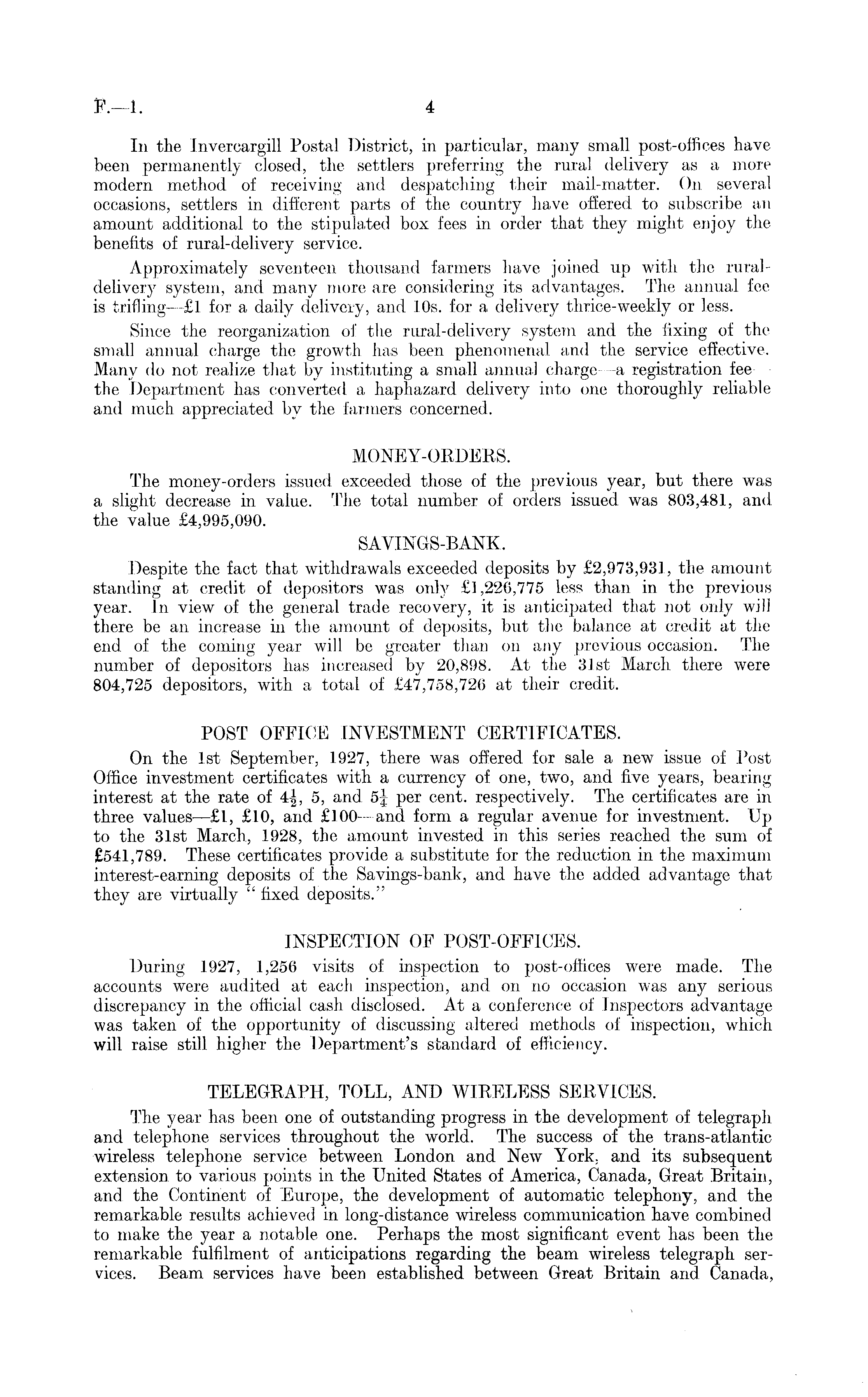 In the Invercargill Postal District, in particular, many small post-offices have been permanently closed, the settlers preferring the rural delivery as a more modern method of receiving and despatching their mail-matter. On several occasions, settlers in different parts of the country have offered to subscribe an amount additional to the stipulated box fees in order that they might enjoy the benefits of rural-delivery service. Approximately seventeen thousand farmers have joined up with the ruraldelivery system, and many more are considering its advantages. The annual fee is trifling- £l for a daily delivery, and 10s. for a delivery thrice-weekly or less. Since the reorganization of the rural-delivery system and the fixing of the small annual charge the growth has been phenomenal and the service effective. Many do not realize that by instituting a small annual charge —a registration fee the Department has converted a haphazard delivery into one thoroughly reliable and much appreciated by the farmers concerned. MONEY-ORDERS. The money-orders issued exceeded those of the previous year, but there was a slight decrease in value. The total number of orders issued was 803,481, and the value £4,995,090. SAVINGS-BANK. Despite the fact that withdrawals exceeded deposits by £2,973,931, the amount standing at credit of depositors was only £1,226,775 less than in the previous year. In view of the general trade recovery, it is anticipated that not only will there be an increase in the amount of deposits, but the balance at credit at the end of the coming year will be greater than on any previous occasion. The number of depositors has increased by 20,898. At the 31st March there were 804,725 depositors, with a total of £47,758,726 at their credit. POST OFFICE INVESTMENT CERTIFICATES. On the Ist September, 1927, there was offered for sale a new issue of Post Office investment certificates with a currency of one, two, and five years, bearing interest at the rate of 4|, 5, and 5j per cent, respectively. The certificates are in three values —£l, £10, and £100—and form a regular avenue for investment. Up to the 31st March, 1928, the amount invested in this series reached the sum of £541,789. These certificates provide a substitute for the reduction in the maximum interest-earning deposits of the Savings-bank, and have the added advantage that they are virtually " fixed deposits." INSPECTION OF POST-OFFICES. During 1927, 1,256 visits of inspection to post-offices were made. The accounts were audited at each inspection, and on no occasion was any serious discrepancy in the official cash disclosed. At a conference of Inspectors advantage was taken of the opportunity of discussing altered methods of inspection, which will raise still higher the Department's standard of efficiency. TELEGRAPH, TOLL, AND WIRELESS SERVICES. The year has been one of outstanding progress in the development of telegraph and telephone services throughout the world. The success of the trans-atlantic wireless telephone service between London and New York, and its subsequent extension to various points in the United States of America, Canada, Great Britain, and the Continent of Europe, the development of automatic telephony, and the remarkable results achieved in long-distance wireless communication have combined to make the a notable one. Perhaps the most significant event has been the remarkable fulfilment of anticipations regarding the beam wireless telegraph services. Beam services have been established between Great .Britain and Canada,