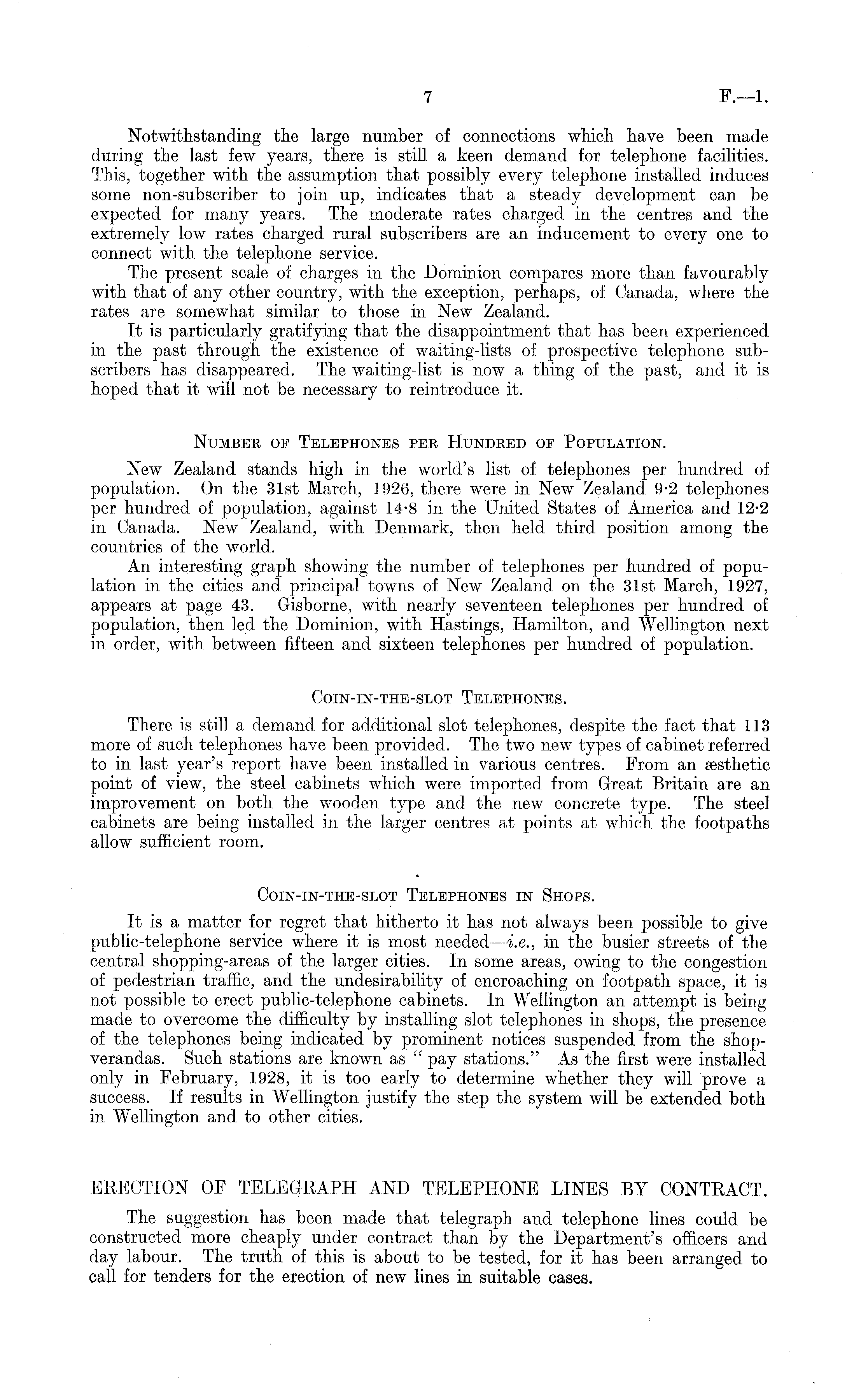 Notwithstanding the large number of connections which have been made during the last few years, there is still a keen demand for telephone facilities. This, together with the assumption that possibly every telephone installed induces some non-subscriber to join up, indicates that a steady development can be expected for many years. The moderate rates charged, in the centres and the extremely low rates charged rural subscribers are an inducement to every one to connect with the telephone service. The present scale of charges in the Dominion compares more than favourably with that of any other country, with the exception, perhaps, of Canada, where the rates are somewhat similar to those in. New Zealand. It is particularly gratifying that the disappointment that has been experienced in the past through the existence of waiting-lists of prospective telephone subscribers has disappeared. The waiting-list is now a thing of the past, and it is hoped that it will not be necessary to reintroduce it. Number oe Telephones per Hundred of Population. New Zealand stands high in the world's list of telephones per hundred of population. On the 31st March, 1926, there were in New Zealand 9-2 telephones per hundred of population, against 14-8 in the United States of America and 12-2 in Canada. New Zealand, with Denmark, then held third position among the countries of the world. An interesting graph showing the number of telephones per hundred of population in the cities and principal towns of New Zealand on the 3.lst March, 1927, appears at page 43. Gisborne, with nearly seventeen telephones per hundred of population, then led the Dominion, with. Hastings, Hamilton, and Wellington next in order, with between fifteen and sixteen telephones per hundred of population. Coin-in-the-slot Telephones. There is still a demand, for additional slot telephones, despite the fact that 113 more of such telephones have been provided. The two new types of cabinet referred to in last year's report have been installed in. various centres. From an aesthetic point of view, the steel cabinets which were imported from Great Britain are an improvement on both the wooden type and the new concrete type. The steel cabinets are being installed in the larger centres at points at which the footpaths allow sufficient room. Coin-in-the-slot Telephones in Shops. It is a matter for regret that hitherto it has not always been possible to give public-telephone service where it is most needed—i.e., in the busier streets of the central shopping-areas of the larger cities. In some areas, owing to the congestion of pedestrian traffic, and the undesirability of encroaching on footpath space, it is not possible to erect public-telephone cabinets. In Wellington an attempt is being made to overcome the difficulty by installing slot telephones in shops, the presence of the telephones being indicated by prominent notices suspended from the shopverandas. Such stations are known as " pay stations." As the first were installed only in February, 1928, it is too early to determine whether they will prove a success. If results in Wellington justify the step the system will be extended both in Wellington and to other cities. ERECTION OF TELEGRAPH AND TELEPHONE LINES BY CONTRACT. The suggestion has been made that telegraph and telephone lines could be constructed more cheaply under contract than by the Department's officers and day labour. The truth of this is about to be tested, for it has been arranged to call for tenders for the erection of new lines in suitable cases.
