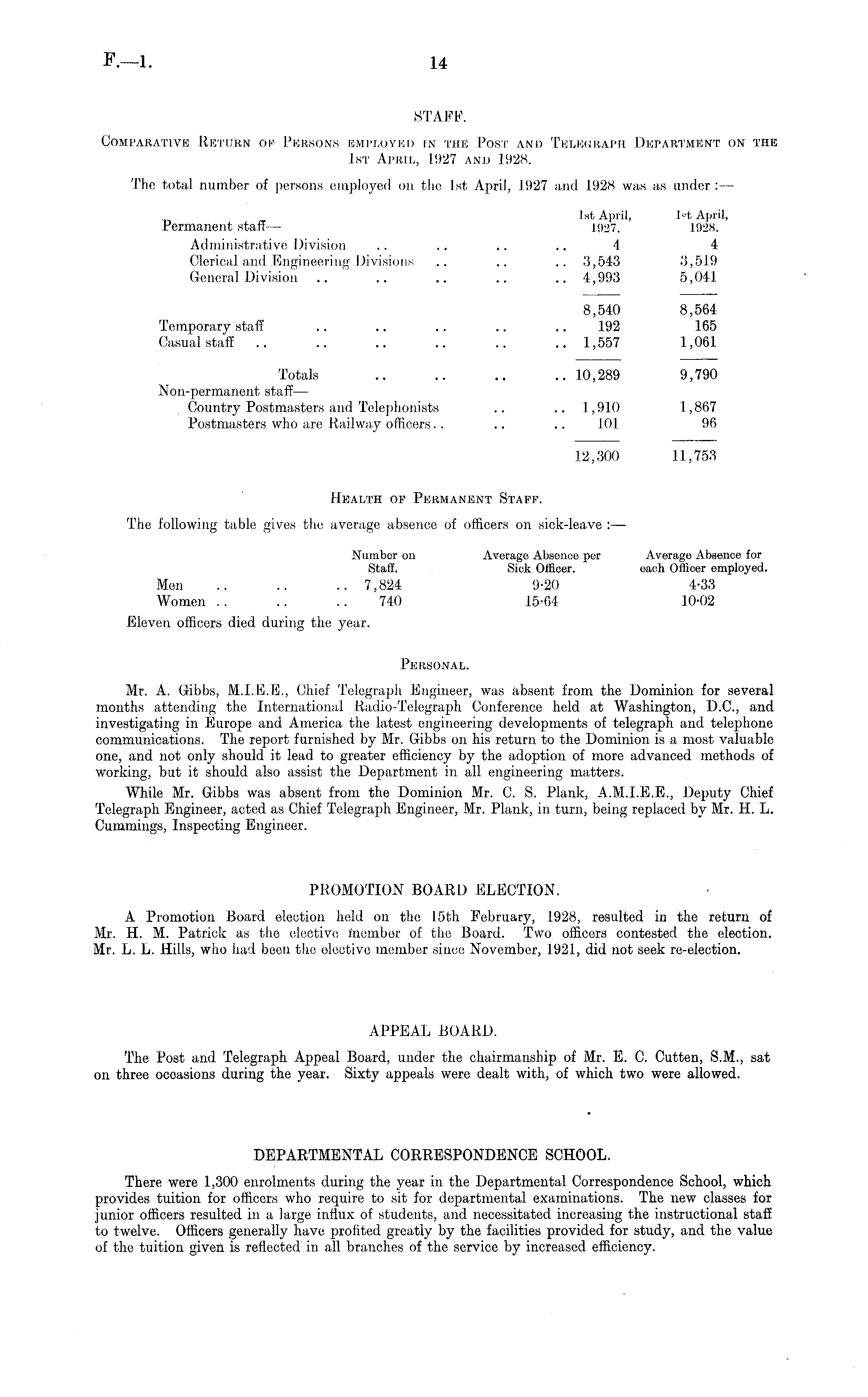 STAFF. Comparative Return of Persons employed in the Post and Telegraph Department on the Ist April, L 927 and 1928. The total number of persons employed on the Ist April, 1927 and 1928 was as under : — Ist April, l°t April, Permanent staff— 1927. 1928. Administrative Division .. .. .. .. 4 4 Clerical and Engineering Divisions .. .. .. 3,543 3,5.19 General Division .. .. .. .. .. 4,993 5,041 8,540 8,564 Temporary staff .. .. .. .. ..192 165 Casual staff .. .. .. .. .. .. 1,557 1,061 Totals .. .. .. .. 10,289 9,790 N on- permanent staff — Country Postmasters and Telephonists .. .. 1,910 1,867 Postmasters who are Railway officers. . .. .. 101 96 12,300 11,753 Health of Permanent Staff. The following table gives the average absence of officers on sick-leave : — Number on Average Absence per Average Absence for Stall. Sick Officer. each Officer employed. Men .. .. ..7,824 9-20 4-33 Women .. .. .. 740 15-64 10-02 Eleven officers died during the year. Personal. Mr. A. Gibbs, M.1.E.E., Chief Telegraph Engineer, was absent from the Dominion for several months attending the International. Radio-Telegraph Conference held at Washington, D.C., and investigating in Europe and America the latest engineering developments of telegraph and telephone communications. The report furnished by Mr. Gibbs on his return to the Dominion is a most valuable one, and not only should it lead to greater efficiency by the adoption of more advanced methods of working, but it should also assist the Department in all engineering matters. While Mr. Gibbs was absent from the Dominion Mr. C. S. Plank, A.M.1.E.E., Deputy Chief Telegraph Engineer, acted as Chief Telegraph Engineer, Mr. Plank, in turn, being replaced by Mr. H. L. Cummings, Inspecting Engineer. PROMOTION BOARD ELECTION. A Promotion Board election held on the 15th February, 1928, resulted in the return of Mr. H. M. Patrick as the elective fnember of the Board. Two officers contested the election. Mr. L. L. Hills, who had been the elective member since November, 1921, did not seek re-election. APPEAL BOARD. The Post and Telegraph Appeal Board, under the chairmanship of Mr. E. 0 Cutten, S.M., sat on three ocoasions during the year. Sixty appeals were dealt with, of which two were allowed. DEPARTMENTAL CORRESPONDENCE SCHOOL. There were 1,300 enrolments during the year in the Departmental Correspondence School, which provides tuition for officers who require to sit for departmental examinations. The new classes for junior officers resulted in a large influx of students, and necessitated increasing the instructional staff to twelve. Officers generally have proiited greatly by the facilities provided for study, and the value of the tuition given is reflected in all branches of the service by increased efficiency.