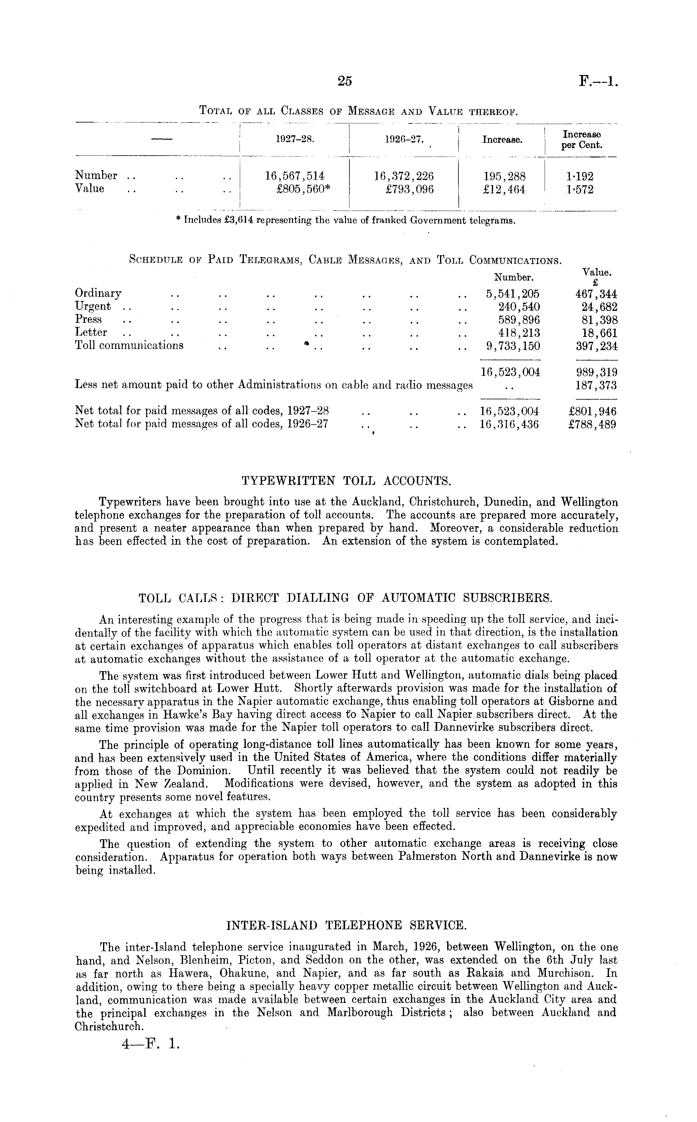 Schedule of Paid Telegrams, Cable Messages, and Toll Communications. Number. Va £ ! ue - Ordinary .. .. .. .. .. .. .. 5,541,205 467,344 Urgent .. .. .. .. .. .. .. .. 240,540 24,682 Press .. .. .. .. .. .. .. .. 589,896 81,398 Letter .. .. .. .. .. .. .. .. 418,213 18,661 Toll communications .. .. •.. .. .. .. 9,733,150 397,234 16,523,004 989,319 Less net amount paid to other Administrations on cable and radio messages .. 187,373 Net total for paid messages of all codes, 1927-28 .. .. .. 16,523,004 £801,946 Net total for paid messages of all codes, 1926-27 .. .. .. 16,316,436 £788,489 TYPEWRITTEN TOLL ACCOUNTS. Typewriters have been brought into use at the Auckland, Christchurch, Dunedin, and Wellington telephone exchanges for the preparation of toll accounts. The accounts are prepared more accurately, and present a neater appearance than when prepared by hand. Moreover, a considerable reduction has been effected in the cost of preparation. An extension of the system is contemplated. TOLL CALLS: DIRECT DIALLING OF AUTOMATIC SUBSCRIBERS. An interesting example of the progress that is being made in speeding up the toll service, and incidentally of the facility with which the automatic system can be used in that direction, is the installation at certain exchanges of apparatus which enables toll operators at distant exchanges to call subscribers at automatic exchanges without the assistance of a toll operator at the automatic exchange. The system was first introduced between Lower Hutt and Wellington, automatic dials being placed on the toll switchboard at Lower Hutt. Shortly afterwards provision was made for the installation of the necessary apparatus in the Napier automatic exchange, thus enabling toll operators at Gisborne and all exchanges in Hawke's Bay having direct access to Napier to call Napier subscribers direct. At the same time provision was made for the Napier toll operators to call Dannevirke subscribers direct. The principle of operating long-distance toll lines automatically has been known for some years, and has been extensively used in the United States of America, where the conditions differ materially from those of the Dominion. Until recently it was believed that the system could not readily be applied in New Zealand. Modifications were devised, however, and the system as adopted in this country presents some novel features. At exchanges at which the system has been employed the toll service has been considerably expedited and improved, and appreciable economies have been effected. The question of extending the system to other automatic exchange areas is receiving close consideration. Apparatus for operation both ways between Palmerston North and Dannevirke is now being installed. INTER-ISLAND TELEPHONE SERVICE. The inter-Island telephone service inaugurated in March, 1926, between Wellington, on the one hand, and Nelson, Blenheim, Picton, and Seddon on the other, was extended on the 6th July last as far north as Hawera, Ohakune, and Napier, and as far south as Rakaia and Murchison. In addition, owing to there being a specially heavy copper metallic circuit between Wellington and Auckland, communication was made available between certain exchanges in the Auckland City area and the principal exchanges in the Nelson and Marlborough Districts ; also between Auckland and Christchurch.