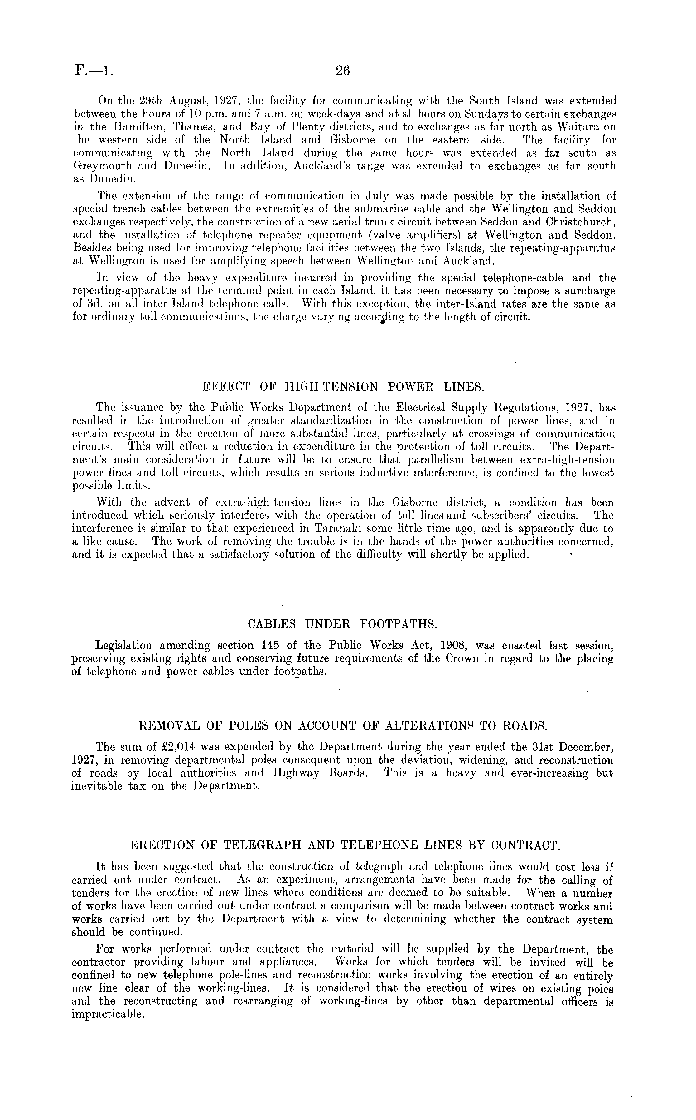 On the 29th August, 1927, the facility for communicating with the South Island was extended between the hours of 10 p.m. and 7 a.m. on week-days and at all hours on Sundays to certain exchanges in the Hamilton, Thames, and Bay of Plenty districts, and to exchanges as far north as Waitara on the western side of the North Island and Gisborne on the eastern side. The facility for communicating with the North Island during the same hours was extended as far south as Greymouth and Dunedin. Tn addition, Auckland's range was extended to exchanges as far south as Dunedin. The extension of the range of communication in July was made possible by the installation of special trench cables between the extremities of the submarine cable and the Wellington and Seddon exchanges respectively, the construction of a new aerial trunk circuit between Seddon and Christchurch, and the installation of telephone repeater equipment (valve amplifiers) at Wellington and Seddon. Besides being used for improving telephone facilities between the two Islands, the repeating-apparatus at Wellington is used for amplifying speech between Wellington and Auckland. In view of the heavy expenditure incurred in providing the special telephone-cable and the repeating-apparatus at the terminal point in each Island, it has been necessary to impose a surcharge of 3d. on all inter-Island telephone calls. With this exception, the inter-Island rates are the same as for ordinary toll communications, the charge varying according to the length of circuit. EFFECT OF HIGH-TENSION POWER LINES. The issuance by the Public Works Department of the Electrical Supply Regulations, 1927, has resulted in the introduction of greater standardization in the construction of power lines, and in certain respects in the erection of more substantial lines, particularly at crossings of communication circuits. This will effect a reduction in expenditure in the protection of toll circuits. The Department's main consideration in future will be to ensure that parallelism between extra-high-tension power lines and toll circuits, which results in serious inductive interference, is confined to the lowest possible limits. With the advent of extra-high-tension lines in the Gisborne district, a condition has been introduced which seriously interferes with the operation of toll lines and subscribers' circuits. The interference is similar to that experienced in Taranaki some little time ago, and is apparently due to a like cause. The work of removing the trouble is in the hands of the power authorities concerned, and it is expected that a satisfactory solution of the difficulty will shortly be applied. CABLES UNDER FOOTPATHS. Legislation amending section 145 of the Public Works Act, 1908, was enacted last session, preserving existing rights and conserving future requirements of the Crown in regard to the placing of telephone and power cables under footpaths. REMOVAL OF POLES ON ACCOUNT OF ALTERATIONS TO ROADS. The sum of £2,014 was expended by the Department during the year ended the 31st December, 1927, in removing departmental poles consequent upon the deviation, widening, and reconstruction of roads by local authorities and Highway Boards. This is a heavy and ever-increasing but inevitable tax on the Department. ERECTION OF TELEGRAPH AND TELEPHONE LINES BY CONTRACT. It has been suggested that the construction of telegraph and telephone lines would cost less if carried out under contract. As an experiment, arrangements have been made for the calling of tenders for the erection of new lines where conditions are deemed to bo suitable. When a number of works have been carried out under contract a comparison will be made between contract works and works carried out by the Department with a view to determining whether the contract system should be continued. For works performed under contract the material will be supplied by the Department, the contractor providing labour and appliances. Works for which tenders will be invited will be confined to new telephone pole-lines and reconstruction works involving the erection of an entirely new line clear of the working-lines. It is considered that the erection of wires on existing poles and the reconstructing and rearranging of working-lines by other than departmental officers is impracticable.