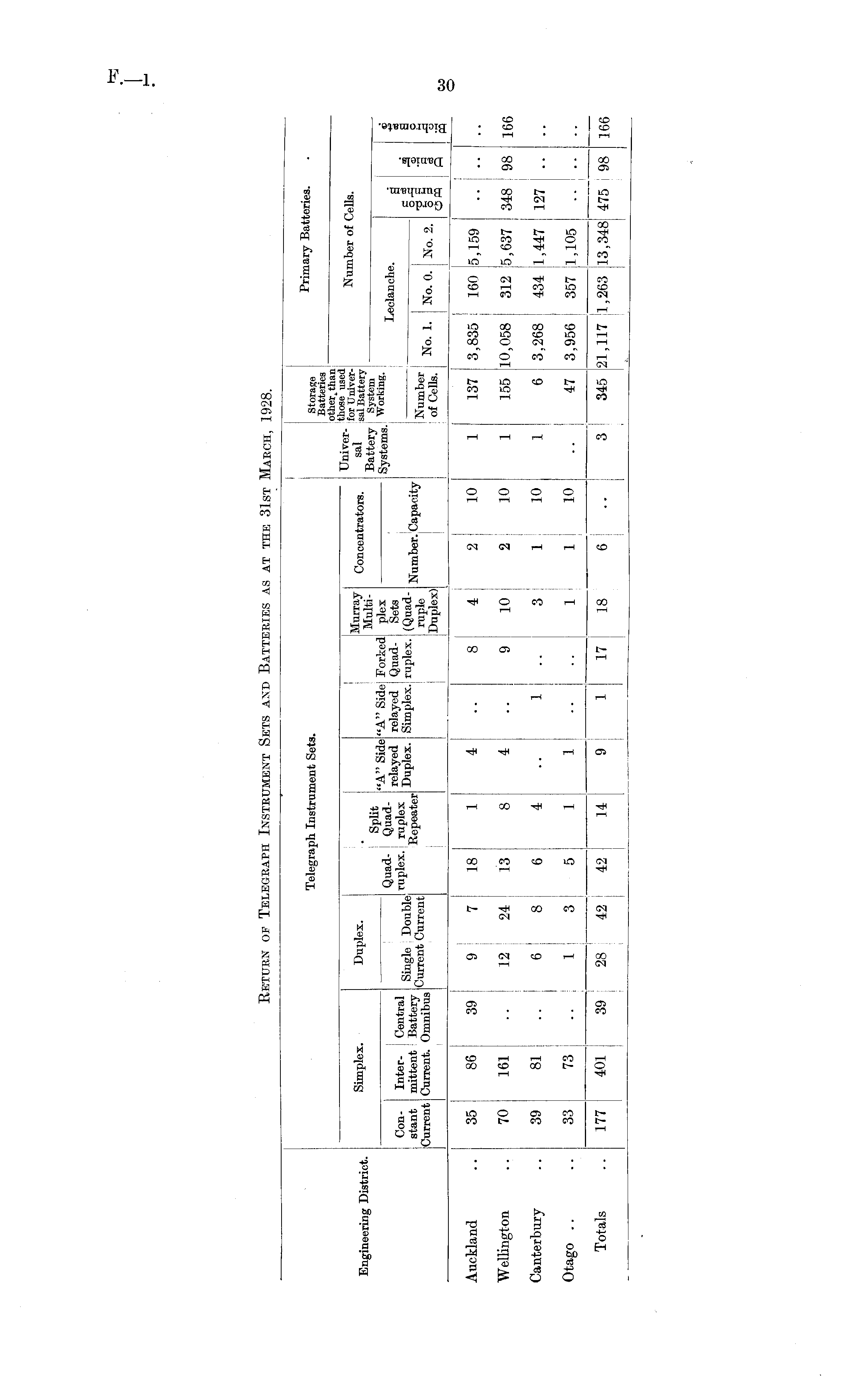 Telegraph Instrument Sets. Storage Batteries other than; Primary Batteries. Engineering District. Con- Inter- Central stant mittent Battery Jurrent Current. Omnibus 1 Simplex. Duplex. Murray a ,-. MultiOuad I Quad " A " Side " A " Side For!!:etl P les rrolex ' molex rela y ed relayed Quad- Sets ' Repeater Du P Ies - Simplex, ruplex.' (QuadF i ruple jDuplex) Concentrators. Universal Battery for Universal Battery System Working. Leelanche. Number of Cells. a 6 ■8 Single . Double! Current Current Number. Capacity Number , T . „ „ ._ _ of Cells. No - L No - °- *°- 2 - .2-S ® ■OS -3 r< E £ o 0 a o o aickland 35 86 39 9 12 7 24 18 13 1 4 1 i 8 9 4 10 3 1 2 2 1 1 10 10 10 10 1 137 3,835 10,058 I 160 5,159 312 5,637 348 Wellington 70 161 8 4 1 155 9s 166 lanterbury 39 81 6 8 6 4 1 6 3,268 434 1,447 127 )tago .. 33 73 1 3 5 1 1 I I 47 3,956 | 357 1,105 •• Totals 177 401 39 28 42 42 9 1 17 18 6 ! 3 ! 345 121,117 1,263 13,348 166 14 475 98